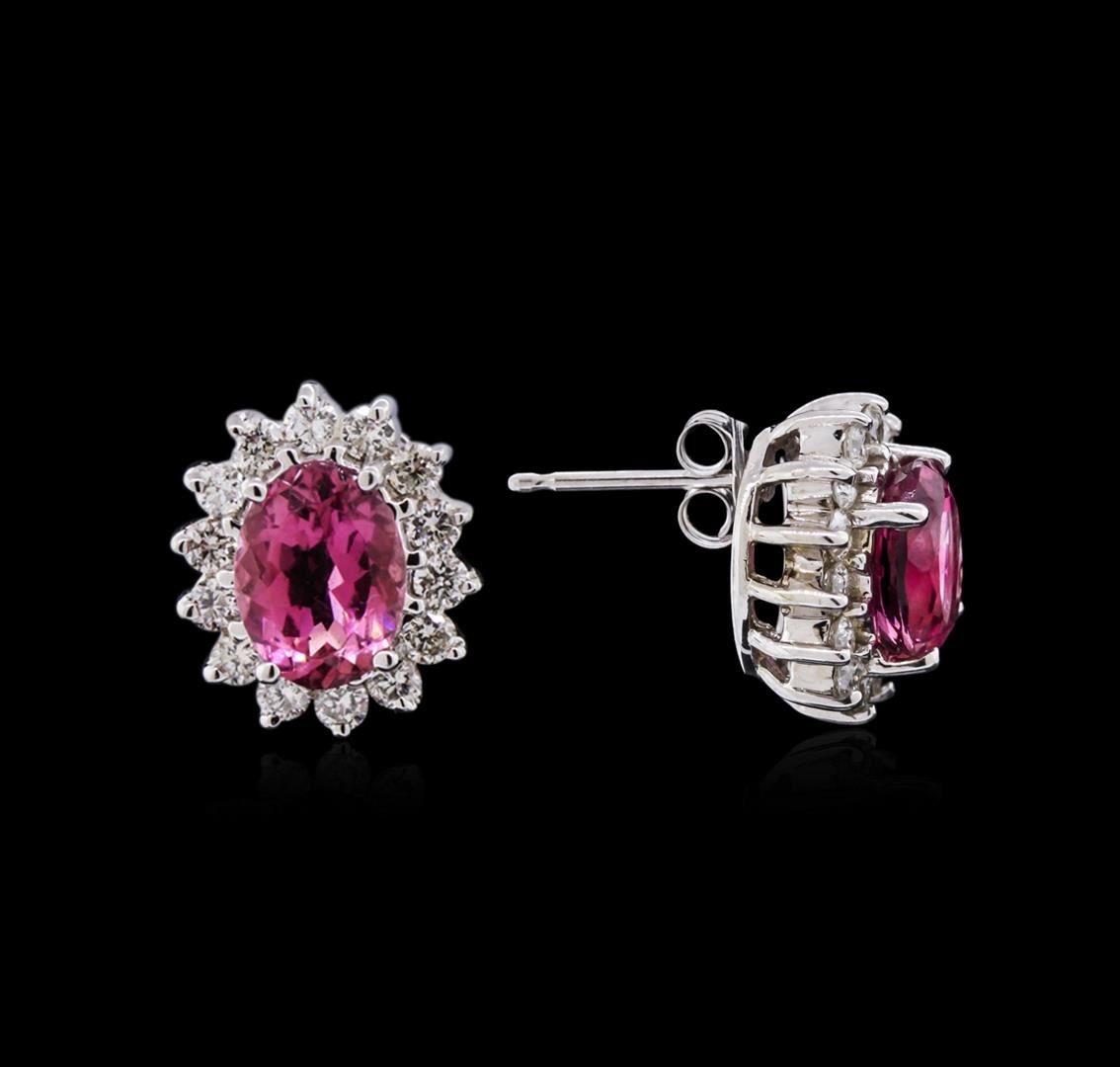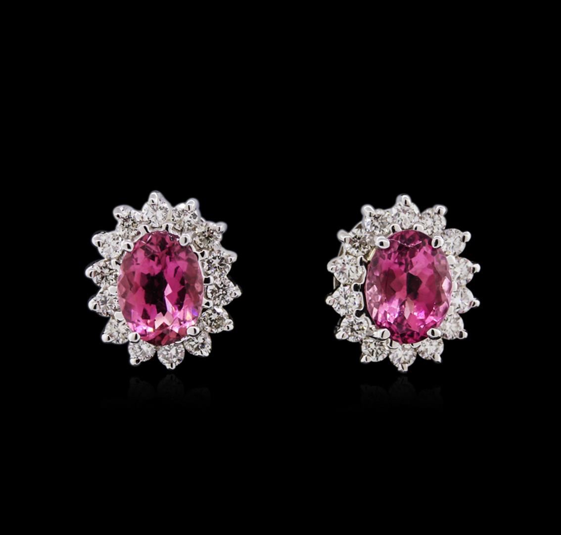 One pair electronically tested 14KT white gold ladies cast tourmaline and diamond earrings with friction posts with a bright polish finish. Identified with markings of "14K". Condition is new. Containing: Two prong set oval modified brilliant cut natural pink tourmalines, measuring 7.90 x 6.00 x 3.90mm, approximate total weight of 2.38ct., clarity is eye clean, type II, medium light, very slightly grayish, reddish purple color, (GIA rP 4/3), cut is good. Thirty prong set round brilliant cut diamonds, measuring 1.90 - 1.96 x 1.16mm (depth est.) approximate total weight of 30 Stones = 0.79ct. Clarity: SI-1 to SI-2. Color: H - I, Cut is Good. Colored gemstones are presumed to have been subjected to commonly used enhancement processes. All diamonds and colored gemstones are graded in the mounting, unless otherwise stated. Total Weight of Colored Stones 2.38ct. Total Weight of Diamonds 0.79ct. Total Weight of Earrings 5.20 grams. GGL Appraised at $2,975.00.