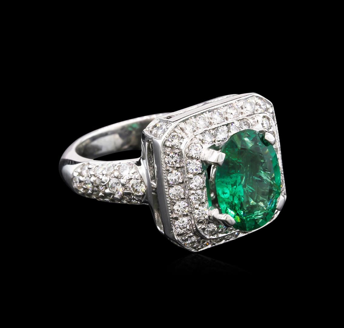 One electronically tested 14KT white gold lady's cast fashion ring with a double halo with a bright polish finish. The featured lady's ring has a shank measuring 3.20 millimeters wide. Identified with markings of "14K". Condition is new, good workmanship. Containing: One prong set oval modified brilliant cut natural emerald, measuring 10.35 x 7.92 x 3.95mm, 15% bulge factor, approximate weight of 2.39ct., clarity is slightly included, type III, medium, moderately strong, very slightly bluish green color, (GIA vslbG 5/4), cut is good. Transmitting light with a minimum of distortion, transparent. Naturally occurring internal & external characteristics are present. Indications of oil residue. Graded in the setting. Seventy-Eight bead set round brilliant cut diamonds, measuring 1.60 - 1.55 x 1.01mm (depth est.) approximate total weight of 78 Stones = 1.20ct. Graded in the setting. Clarity: SI-1 to SI-2. Color: G - I. Cut Good. Total Weight of Colored Stones 2.39ct. Total Weight of Diamonds 1.20ct. Total Weight of Ring 9.40gm. GAS Appraised at $9,725.00.