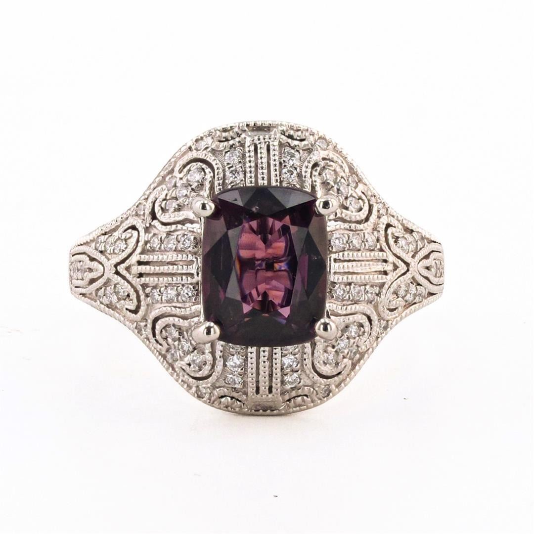 2.39ct Purplish Pink Spinel and 0.23ctw Diamond Platinum Ring. Platinum (PLAT) natural spinel and diamond ring. A cushion brilliant cut natural spinel gemstone is mounted in the center of the ring. Round brilliant cut diamonds accent the ring around and on botn smes ot the center gemstone. The ring has a gross weight of 10.0 Grams. NATURAL GEMSTONE GEMSTONE: Spinel NATURE: Natural SHAPE: Cushion Brilliant, Faceted Cut WEIGHT: 2.39 carat total DIMENSIONS 8.72 x 6.83mm CLARITY: Type 1 COLOR: Purplish Pink (5/5) SYMMETRY: Excellent COLOR INTENSITY: Intense TRANSPARENCY: Transparent TONE: Dark NATURAL DIAMOND SHAPE: Round Brilliant Cut WEIGHT: 0.23 carat total (74pcs.) DIMENSIONS: 1.0 x 0.8mm AVERAGE CLARITY: VS1-VS2 AVERAGE COLOR: F-G SYMMETRY: Excellent POLISH: Excellent METAL METAL: Platinum PURITY: 950 COLOR: White CONDITION: Excellent FINISH: High Polish