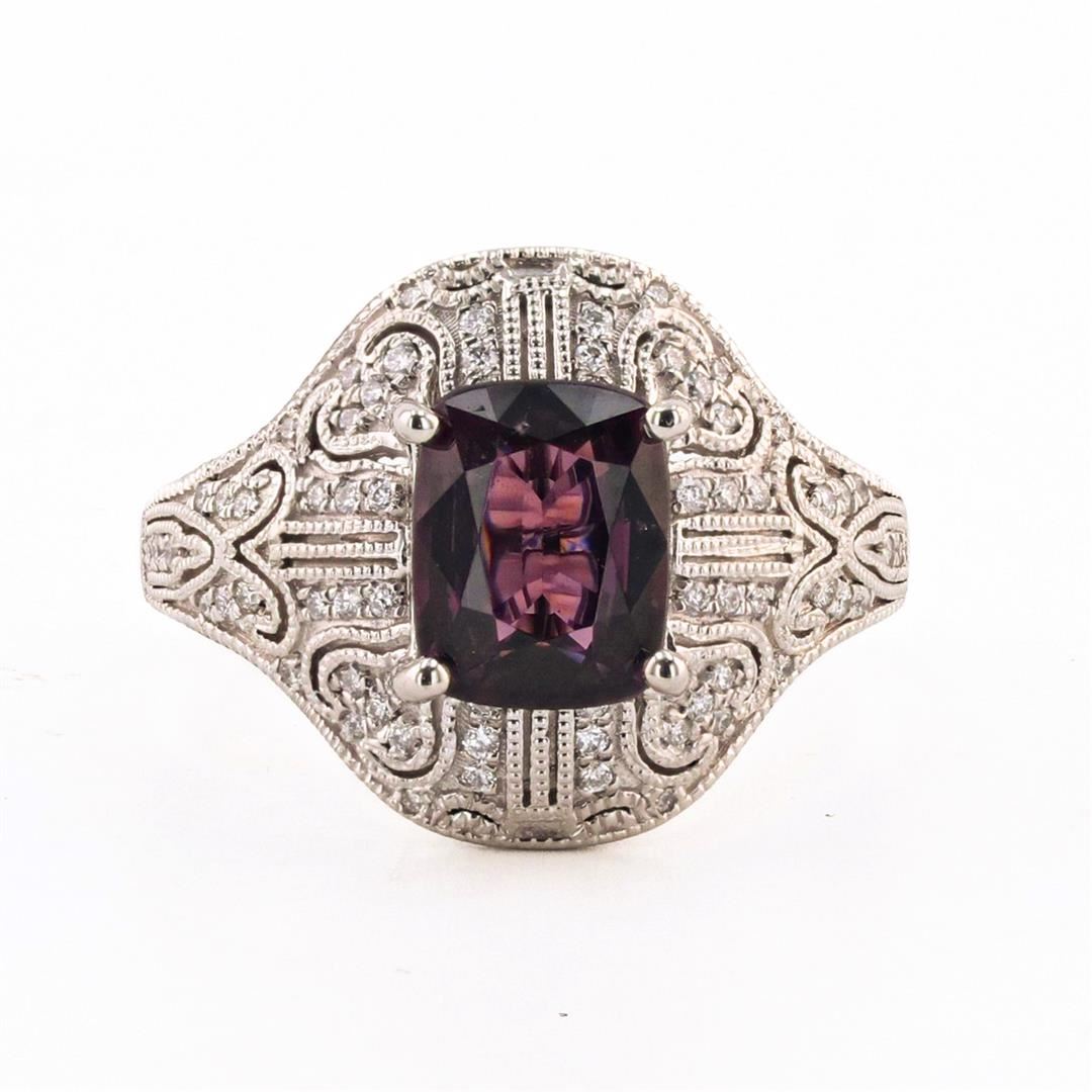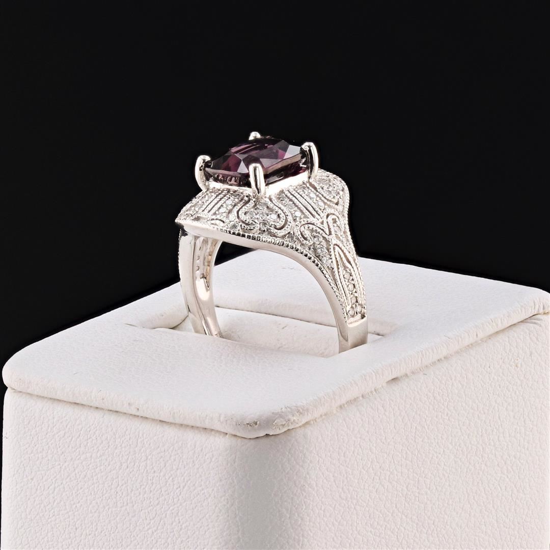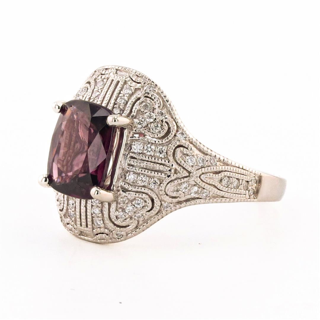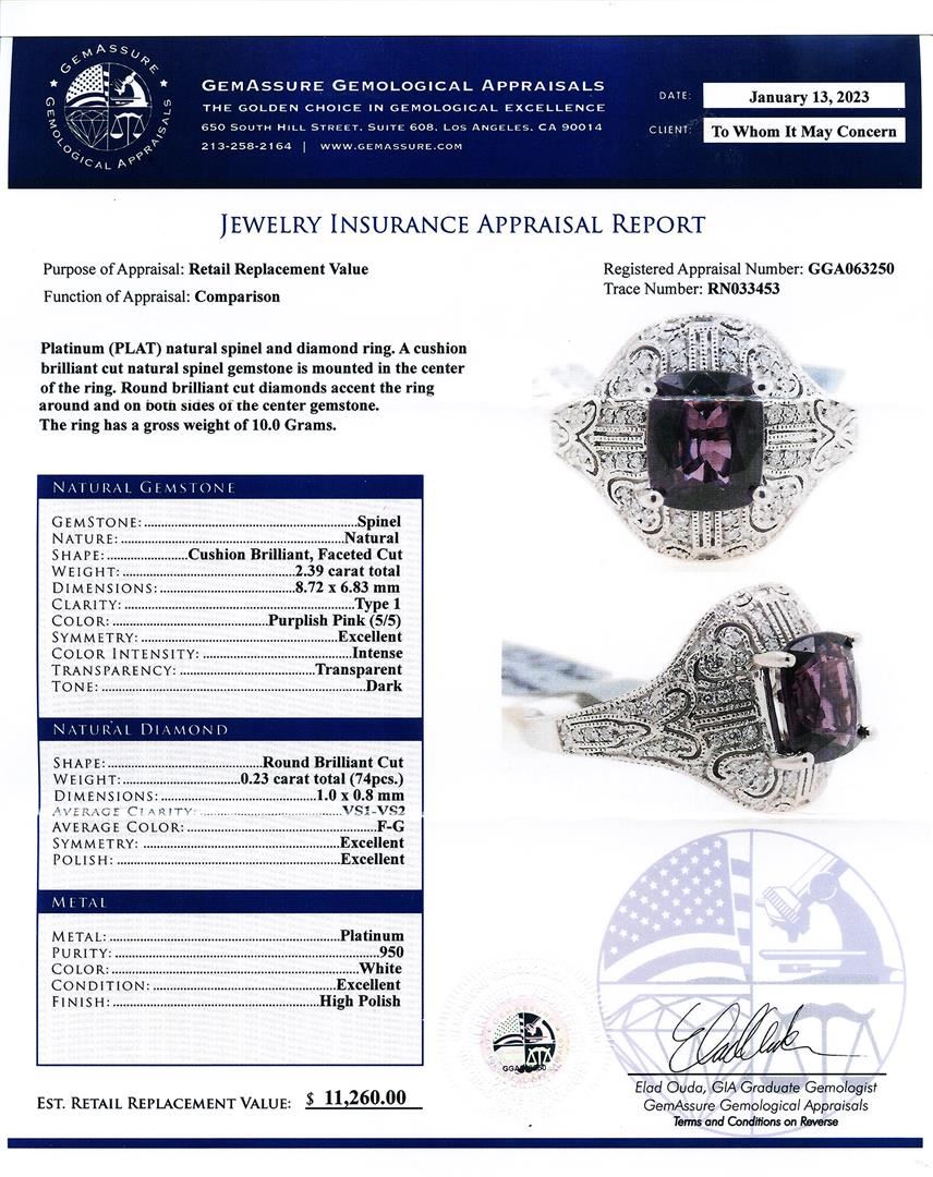 2.39ct Purplish Pink Spinel and 0.23ctw Diamond Platinum Ring. Platinum (PLAT) natural spinel and diamond ring. A cushion brilliant cut natural spinel gemstone is mounted in the center of the ring. Round brilliant cut diamonds accent the ring around and on botn smes ot the center gemstone. The ring has a gross weight of 10.0 Grams. NATURAL GEMSTONE GEMSTONE: Spinel NATURE: Natural SHAPE: Cushion Brilliant, Faceted Cut WEIGHT: 2.39 carat total DIMENSIONS 8.72 x 6.83mm CLARITY: Type 1 COLOR: Purplish Pink (5/5) SYMMETRY: Excellent COLOR INTENSITY: Intense TRANSPARENCY: Transparent TONE: Dark NATURAL DIAMOND SHAPE: Round Brilliant Cut WEIGHT: 0.23 carat total (74pcs.) DIMENSIONS: 1.0 x 0.8mm AVERAGE CLARITY: VS1-VS2 AVERAGE COLOR: F-G SYMMETRY: Excellent POLISH: Excellent METAL METAL: Platinum PURITY: 950 COLOR: White CONDITION: Excellent FINISH: High Polish