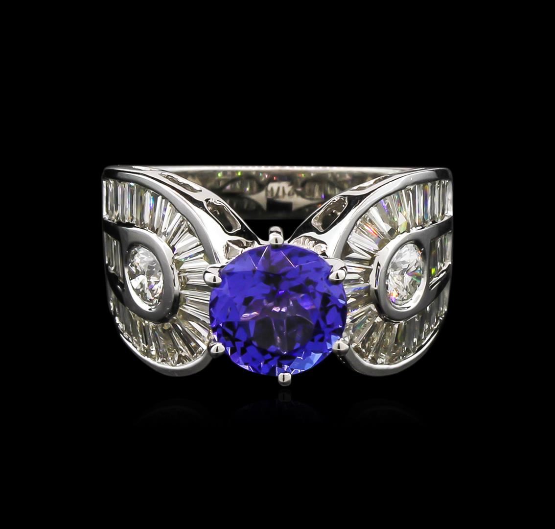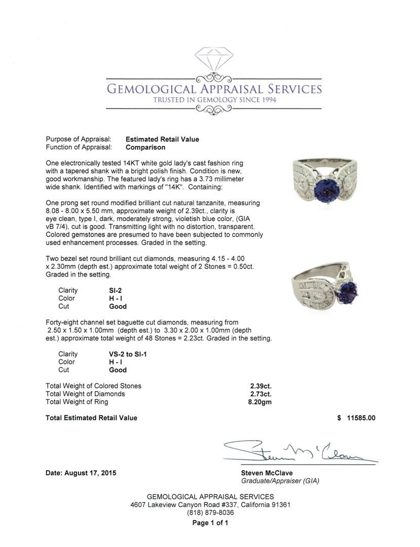 One electronically tested 14KT white gold lady's cast fashion ring with a tapered shank with a bright polish finish. The featured lady's ring has a 3.73 millimeter wide shank. Identified with markings of "14K". Condition is new, good workmanship. Containing: One prong set round modified brilliant cut natural tanzanite, measuring 8.08 - 8.00 x 5.50 mm, approximate weight of 2.39ct., clarity is eye clean, type I, dark, moderately strong, violetish blue color, (GIA vB 7/4), cut is good. Transmitting light with no distortion, transparent. Colored gemstones are presumed to have been subjected to commonly used enhancement processes. Graded in the setting. Two bezel set round brilliant cut diamonds, measuring 4.15 - 4.00 x 2.30mm (depth est.) approximate total weight of 2 Stones = 0.50ct. Graded in the setting. Clarity: SI-2. Color: H - I. Cut Good Forty-Eight channel set baguette cut diamonds, measuring from 2.50 x 1.50 x 1.00mm (depth est.) to 3.30 x 2.00 x 1.00mm (depth est.) approximate total weight of 48 Stones = 2.23ct. Graded in the setting. Clarity: VS-2 to SI-1. Color: H - I. Cut Good. Total Weight of Colored Stones 2.39ct. Total Weight of Diamonds 2.73ct. Total Weight of Ring 8.20gm. GAS Appraised at $11,585.00.