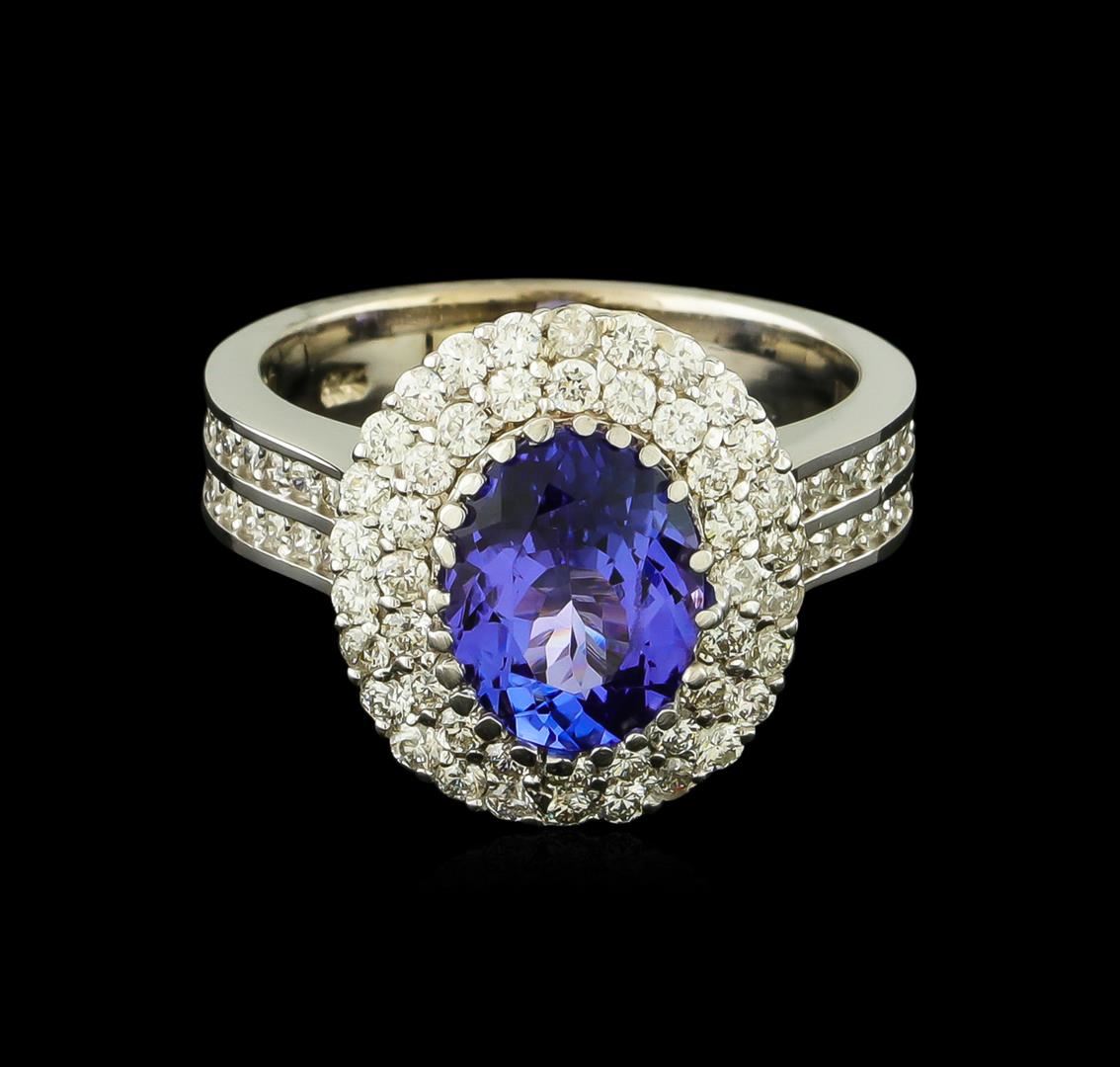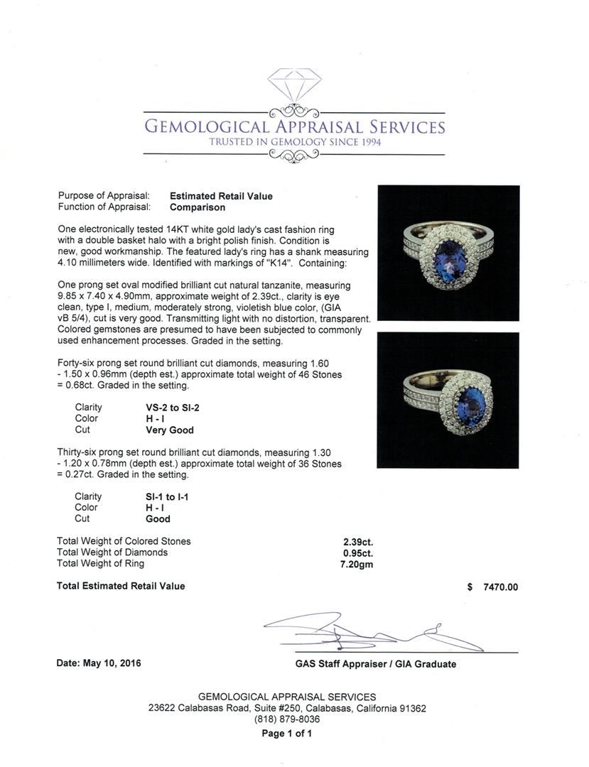 One electronically tested 14KT white gold lady's cast fashion ring with a double basket halo with a bright polish finish. The featured lady's ring has a shank measuring 4.10 millimeters wide. Identified with markings of "K14". Condition is new, good workmanship. Containing: One prong set oval modified brilliant cut natural tanzanite, measuring 9.85 x 7.40 x 4.90mm, approximate weight of 2.39ct., clarity is eye clean, type I, medium, moderately strong, violetish blue color, (GIA vB 5/4), cut is very good. Transmitting light with no distortion, transparent. Colored gemstones are presumed to have been subjected to commonly used enhancement processes. Graded in the setting. Forty-Six prong set round brilliant cut diamonds, measuring 1.60 - 1.50 x 0.96mm (depth est.) approximate total weight of 46 Stones = 0.68ct. Graded in the setting. Clarity: VS-2 to SI-2. Color: H - I. Cut Very Good Thirty-Six prong set round brilliant cut diamonds, measuring 1.30 - 1.20 x 0.78mm (depth est.) approximate total weight of 36 Stones = 0.27ct. Graded in the setting. Clarity: SI-1 to I-1. Color: H - I. Cut Good. Total Weight of Colored Stones 2.39ct. Total Weight of Diamonds 0.95ct. Total Weight of Ring 7.20gm. GAS Appraised at $7,470.00.