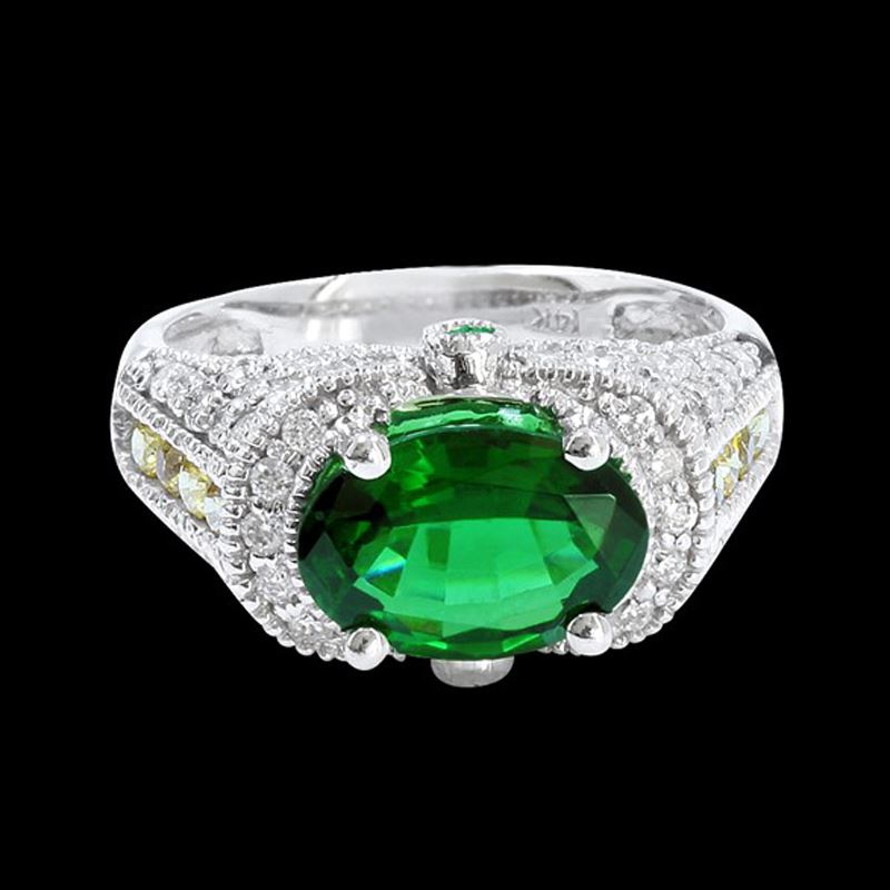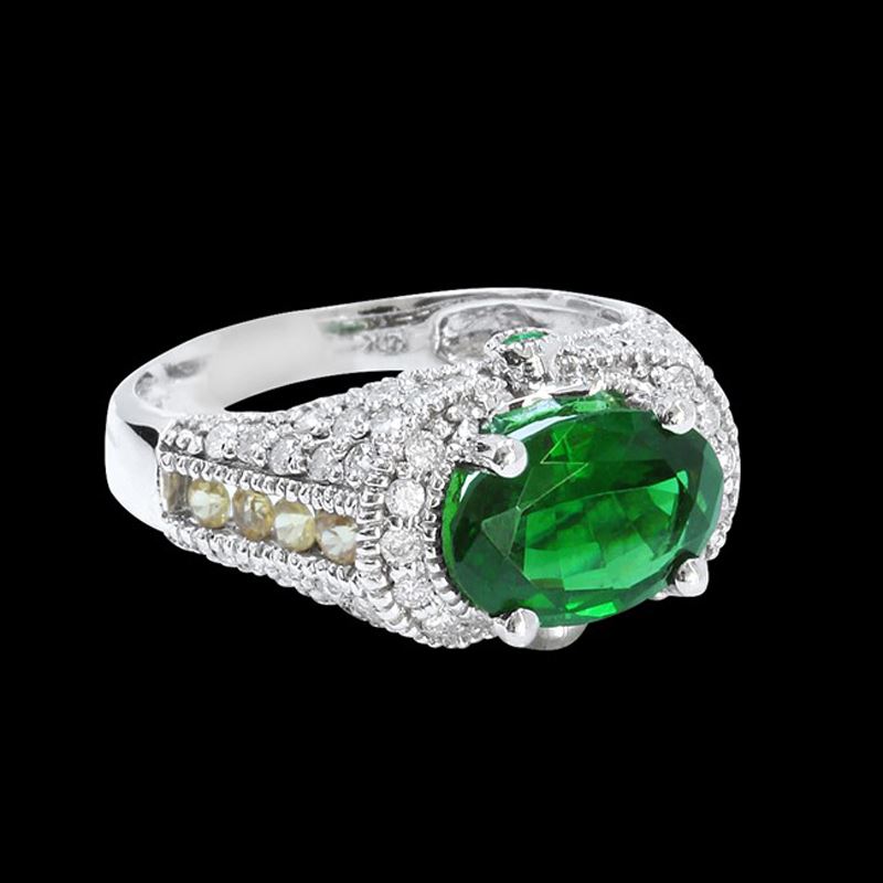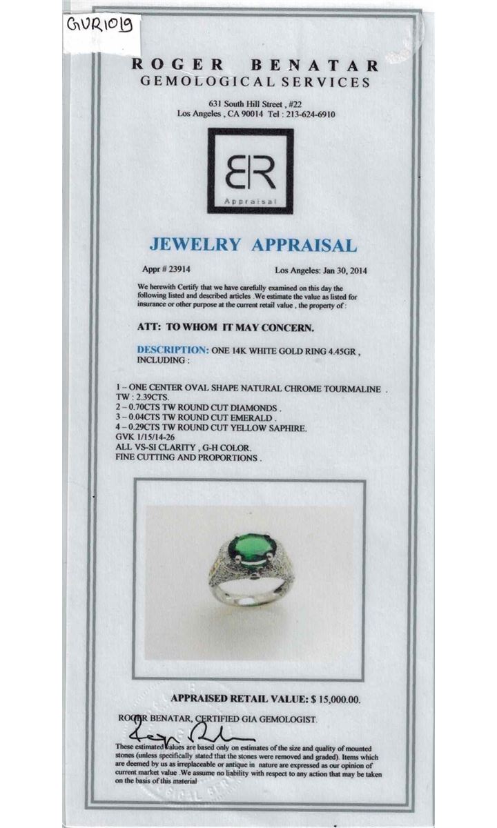 14K WHITE GOLD NATURAL TOURMALINE RING:4.45 GRAMS/CHROME TOURMALINE:2.39 CT/DIAMOND:0.70 CT/COLUMBIAN EMERALD:0.04 CT/YELLOW SAPPHIRE:0.29 CT/#GVR1019