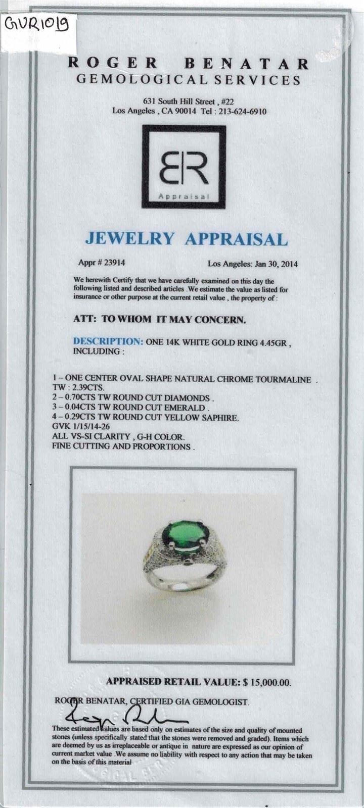 14K WHITE GOLD NATURAL TOURMALINE RING:4.45 GRAMS/CHROME TOURMALINE:2.39 CT/DIAMOND:0.70 CT/COLOMBIAN EMERALD:0.04 CT/YELLOW SAPPHIRE:0.29 CT/#GVR1019 **Warmly crafted in 14kt white gold, this handsome style features a vibrant green 2.39ct oval shape natural Chrome Tourmaline center stone, one of the premiere stones for self healing. Framed with shimmering 0.70ct round cut Diamonds, 0.29ct round cut Yellow Sapphires, and a 0.04ct round cut Emerald, a touch of subtle sparkle adds to its richness and depth.**