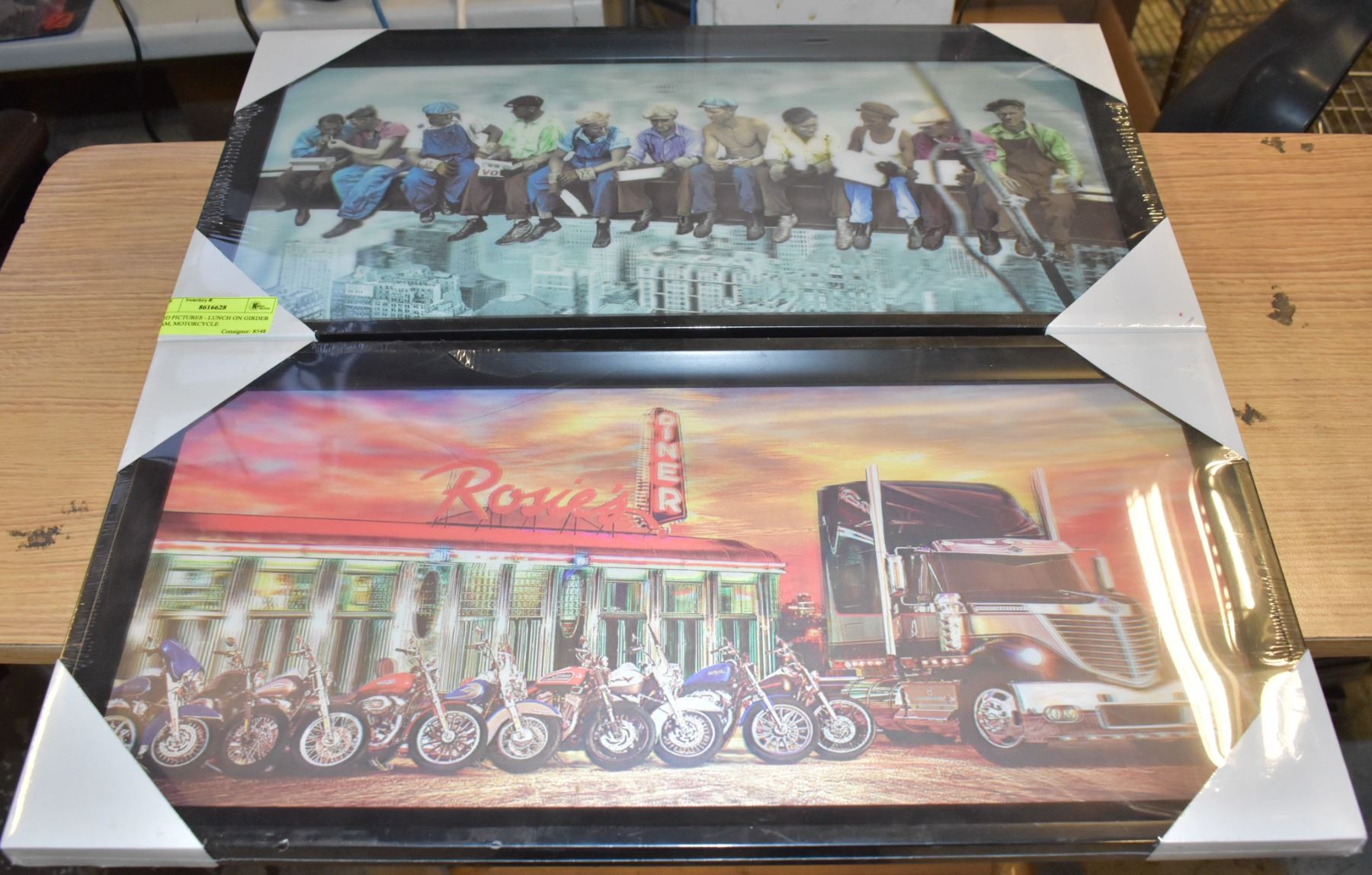 LUNCH ON GIRDER BEAM SKYSCRAPER 30 ROCKEFELLER CENTRE, NEW YORK COLOURIZED, AND MOTORCYCLE LINEUP WITH RIG TRUCK. 3D, NEW IN PACKAGING, SIZE: 20.75" WIDE X 10" HIGH. QUANTITY OF 2
