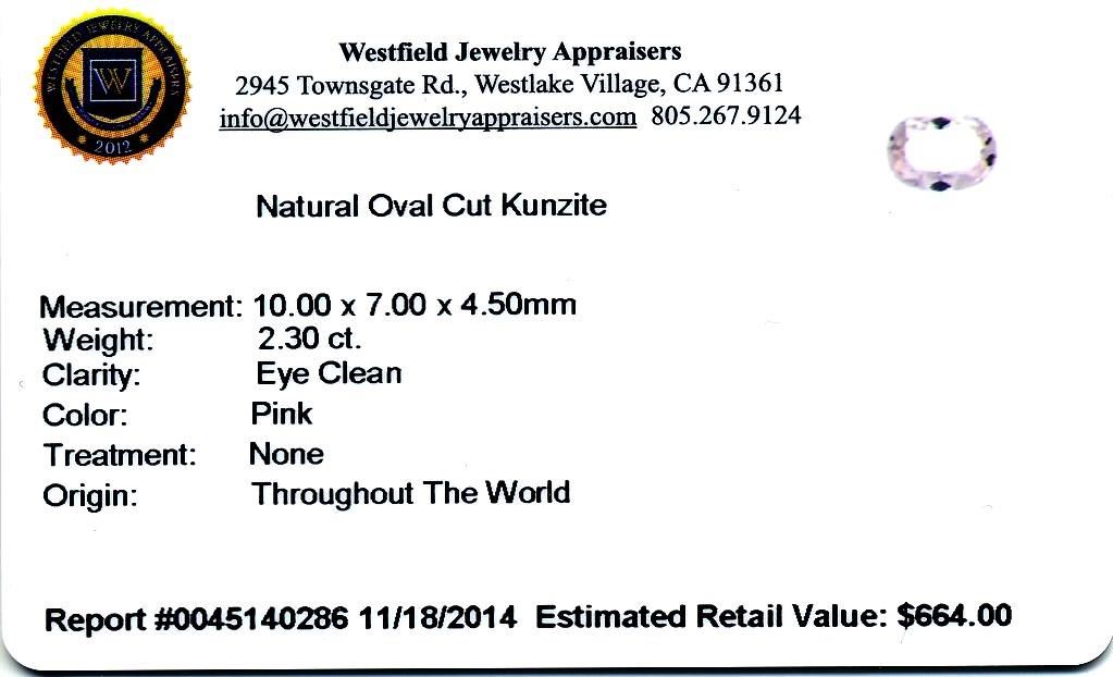 2.3ctw. Natural Oval Cut Kunzite. Westfield Appraised at $664.00.