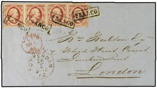 2(4) 1862 ROTTERDAM a LONDON. 10 cts. carmín tira de cuatro. MAGNIFICA.