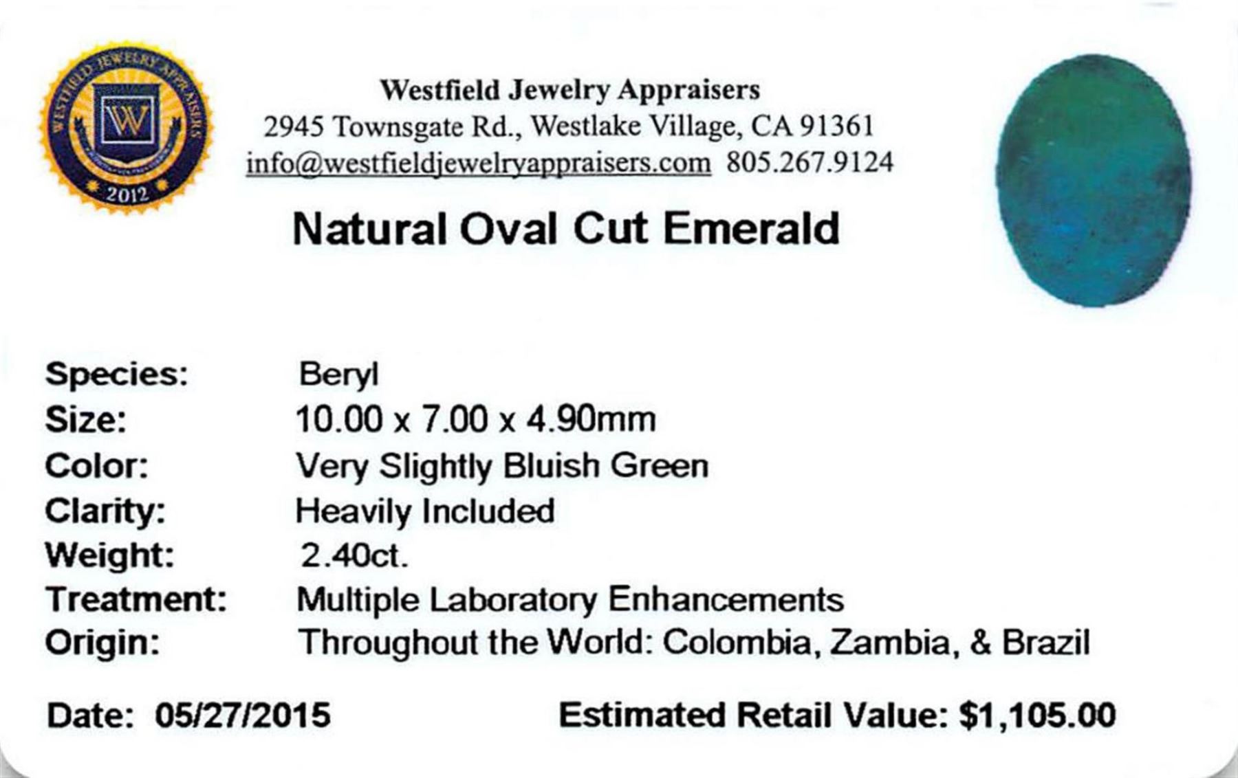 One oval mixed cut natural emerald, measuring 10.00 x 7.00 x 4.90mm, exact weight 2.40 ct., clarity is heavily included, type III, medium dark, very slightly grayish, very slightly bluish green color, (GIA vslbG 6/3), cut is good. Transmitting light somewhat diffusely, translucent, Naturally occurring internal & external characteristics are present, Indications of multiple laboratory enhancements, including high temperature heat treatment. Westfield Appraised.