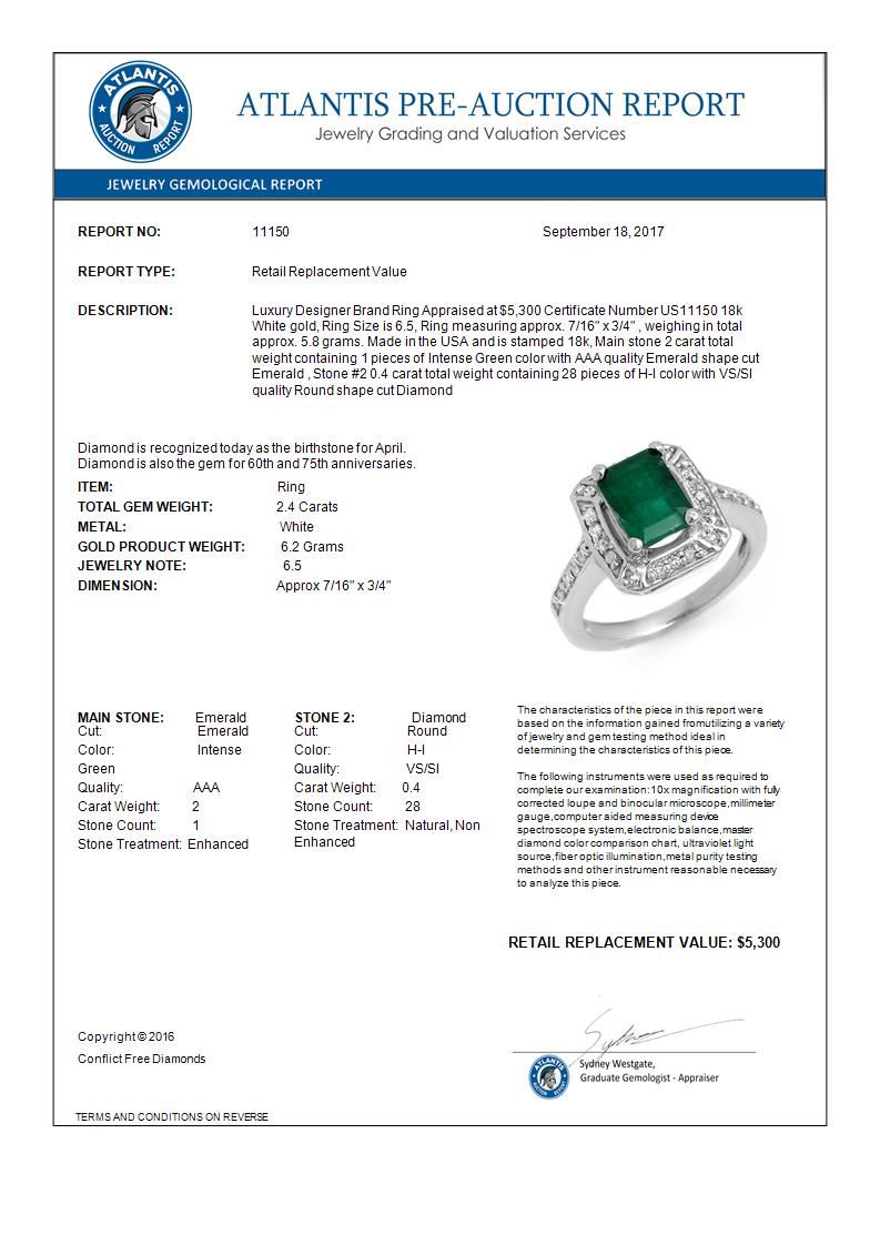 11150 - REF-80F2N ---- 2.40 CTW Emerald & Diamond Ring 18K White Gold ---- Luxury Designer Brand Ring Appraised at $5,300 Certificate Number US11150 18k White gold, Ring Size is 6.5, Ring measuring approx. 7/16" x 3/4" , weighing in total approx. 5.8 grams. Made in the USA and is stamped 18k, Main stone 2 carat total weight containing 1 pieces of Intense Green color with AAA quality Emerald shape cut Emerald , Stone #2 0.4 carat total weight containing 28 pieces of H-I color with VS/SI quality Round shape cut Diamond