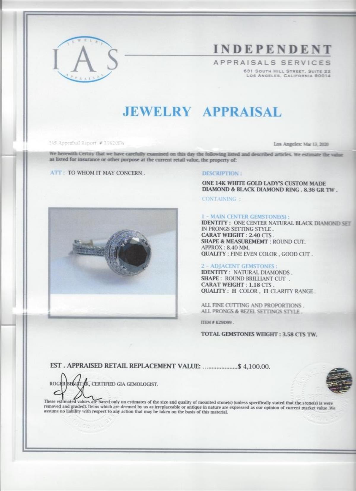 One 2.40 ct Black Diamond and Diamond Ring - 14KT White Gold. IAS certified. See Appraisal for more details.