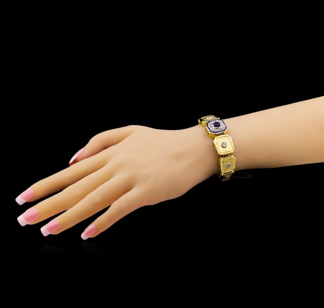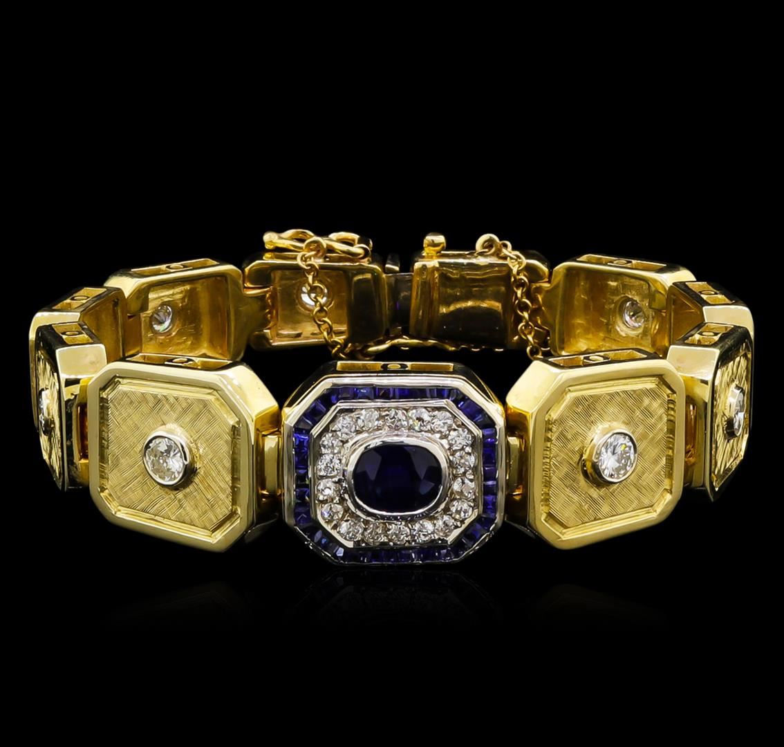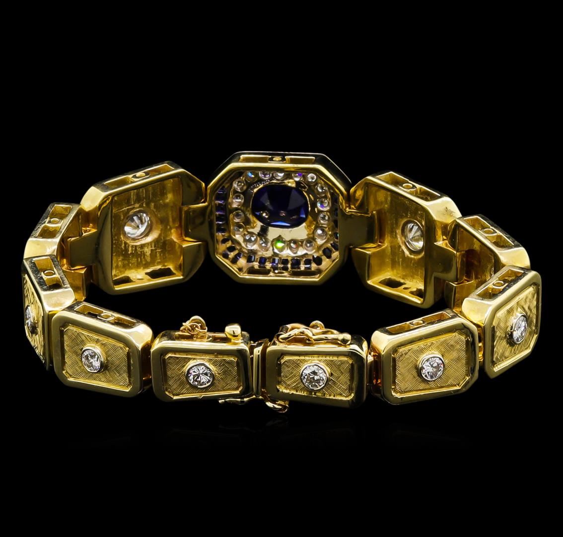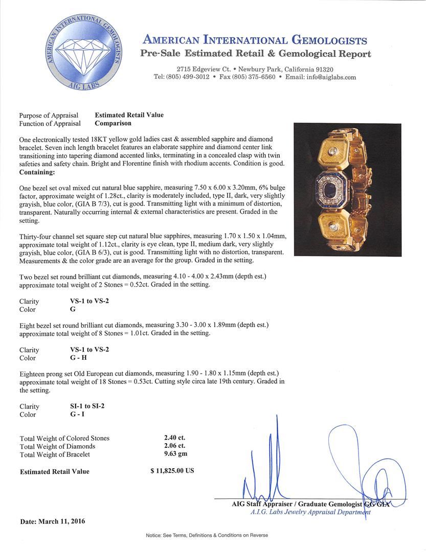 One electronically tested 18KT yellow gold ladies cast & assembled sapphire and diamond bracelet. Seven inch length bracelet features an elaborate sapphire and diamond center link transitioning into tapering diamond accented links, terminating in a concealed clasp with twin safeties and safety chain. Bright and Florentine finish with rhodium accents. Condition is good. Containing: One bezel set oval mixed cut natural blue sapphire, measuring 7.50 x 6.00 x 3.20mm, 6% bulge factor, approximate weight of 1.28ct., clarity is moderately included, type II, dark, very slightly grayish, blue color, (GIA B 7/3), cut is good. Transmitting light with a minimum of distortion, transparent. Naturally occurring internal & external characteristics are present. Graded in the setting. Thirty-four channel set square step cut natural blue sapphires, measuring 1.70 x 1.50 x 1.04mm, approximate total weight of 1.12ct., clarity is eye clean, type II, medium dark, very slightly grayish, blue color, (GIA B 6/3), cut is good. Transmitting light with no distortion, transparent. Measurements & the color grade are an average for the group. Graded in the setting. Two bezel set round brilliant cut diamonds, measuring 4.10 - 4.00 x 2.43mm (depth est.) approximate total weight of 2 Stones = 0.52ct. Graded in the setting. Clarity: VS-1 to VS-2. Color: G. Eight bezel set round brilliant cut diamonds, measuring 3.30 - 3.00 x 1.89mm (depth est.) approximate total weight of 2 Stones = 0.52ct. Graded in the setting. Clarity: VS-1 to VS-2. Color: G - H. Eighteen prong set Old European cut diamonds, measuring 1.90 - 1.80 x 1.15mm (depth est.) approximate total weight of 18 Stones = 0.53ct. Cutting style circa late 19th century. Graded in the setting. Clarity: SI-1 to SI-2. Color: G - I. Total Weight of Colored Stones 2.40ct. Total Weight of Diamonds 2.06ct. Total Weight of Bracelet 9.63 grams. AIG Appraised at $11,825.00.
