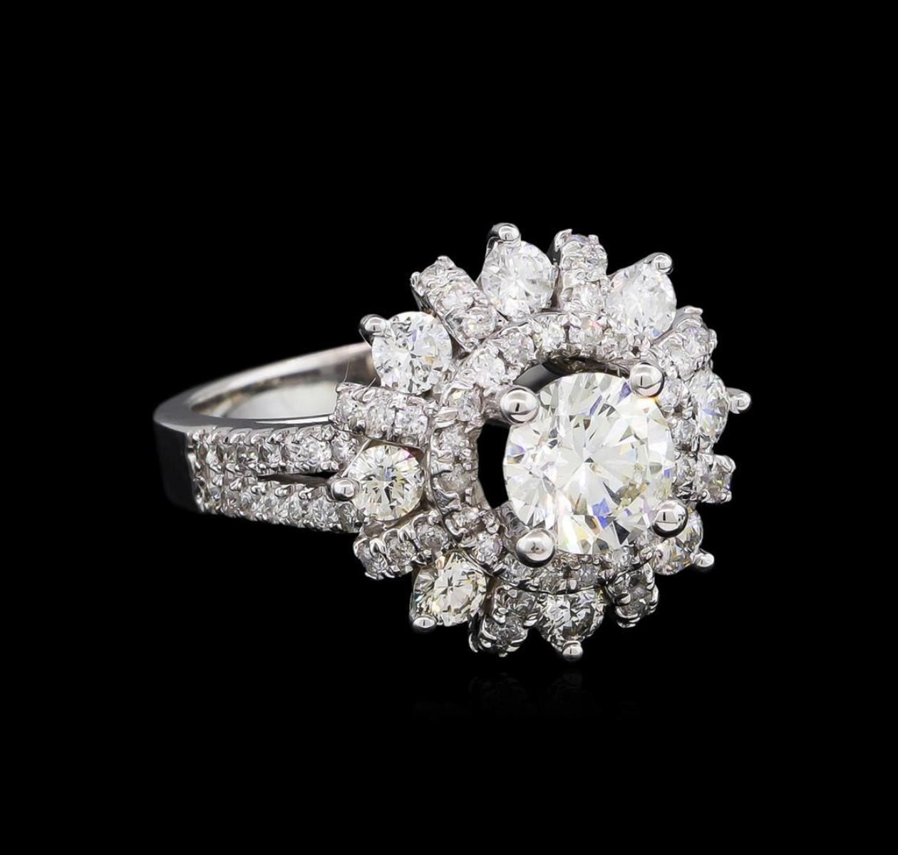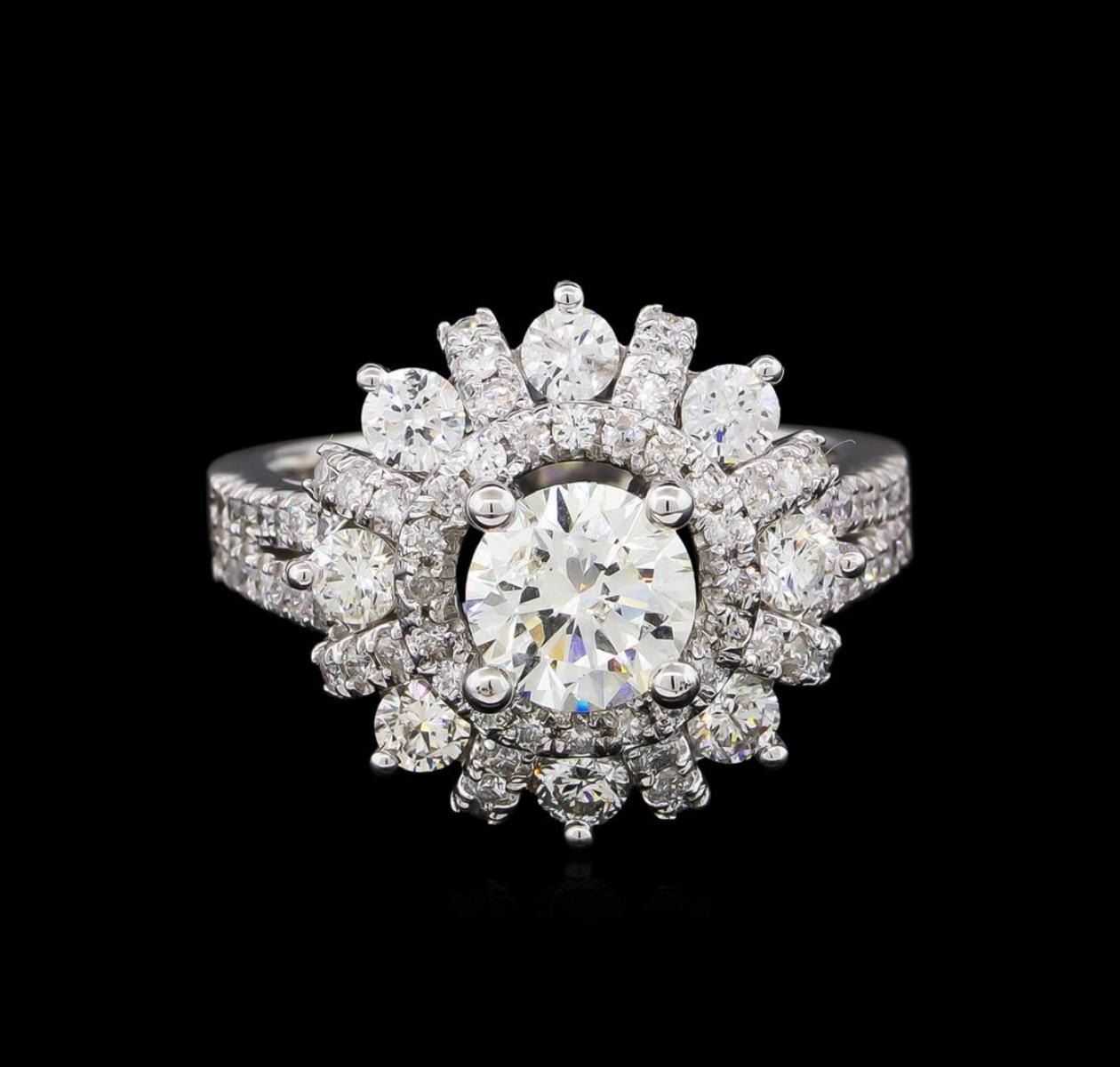 One electronically tested 14KT white gold ladies cast diamond unity ring with a bright polish finish. The featured diamond is set within a stylized diamond floret supported by diamond set split shoulders, completed by a two and one-half millimeter wide band. Identified with markings of "K14". Condition is new, good workmanship. Containing: One prong set round brilliant cut diamond, measuring 6.67 - 6.62 x 4.27mm exact weight 1.21ct. Measured loose prior to setting. Graded in the setting. Clarity: SI-3. Color: H. Depth 64.2%. Table 58.0%. Pavil. Depth%. 44.0%. Eight prong set round brilliant cut diamonds, measuring 2.80 - 2.80 x 1.68mm (depth est.) approximate total weight of 8 Stones = 0.69ct. Graded in the setting. Clarity: SI-2 to I-2. Color: G - H Seventy-Two prong set round brilliant cut diamonds, measuring 1.20 - 1.20 x 0.72mm (depth est.) approximate total weight of 72 Stones = 0.50ct. Graded in the setting. Clarity: SI-2 to I-2. Color: G - I. Total Weight of Diamonds 2.40ct. Total Weight of Ring 6.53gm. AIG Appraised.