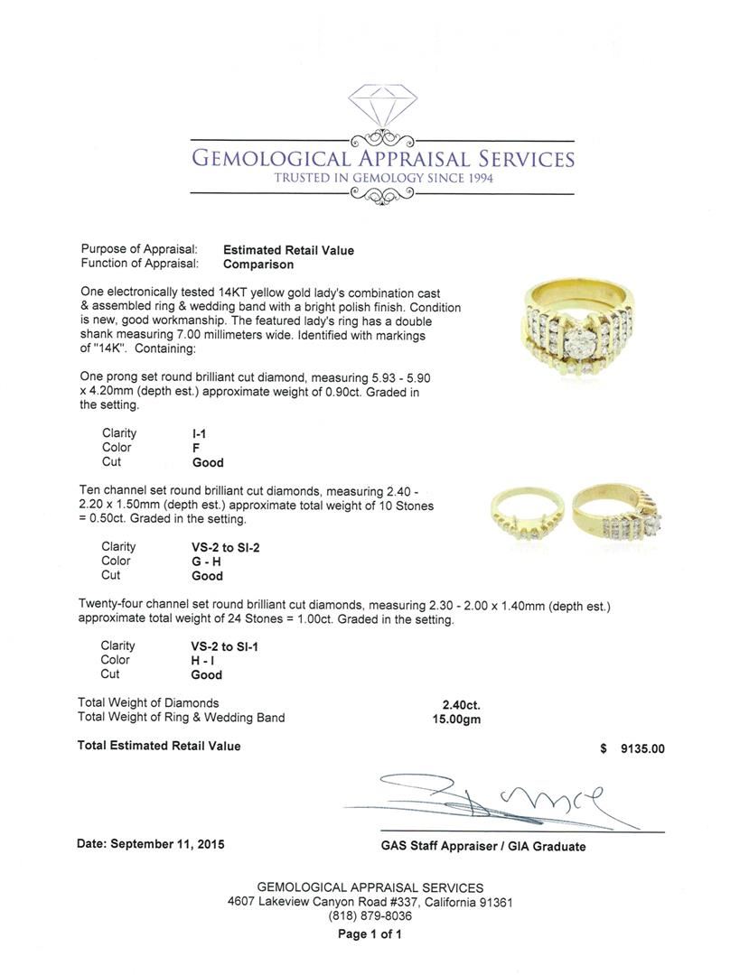 One electronically tested 14KT yellow gold lady's combination cast & assembled ring & wedding band with a bright polish finish. The featured lady's ring has a double shank measuring 7.00 millimeters wide. Identified with markings of "14K". Condition is new, good workmanship. Containing: One prong set round brilliant cut diamond, measuring 5.93 - 5.90 x 4.20mm (depth est.) approximate weight of 0.90ct. Graded in the setting. Clarity: I-1. Color: F. Cut Good Ten channel set round brilliant cut diamonds, measuring 2.40 - 2.20 x 1.50mm (depth est.) approximate total weight of 10 Stones = 0.50ct. Graded in the setting. Clarity: VS-2 to SI-2. Color: G - Good Twenty-Four channel set round brilliant cut diamonds, measuring 2.30 - 2.00 x 1.40mm (depth est.) approximate total weight of 24 Stones = 1.00ct. Graded in the setting. Clarity: VS-2 to SI-1. Color: H - I. Cut Good. Total Weight of Diamonds 2.40ct. Total Weight of Ring & Wedding Band 15.00gm. GAS Appraised at $9,135.00.