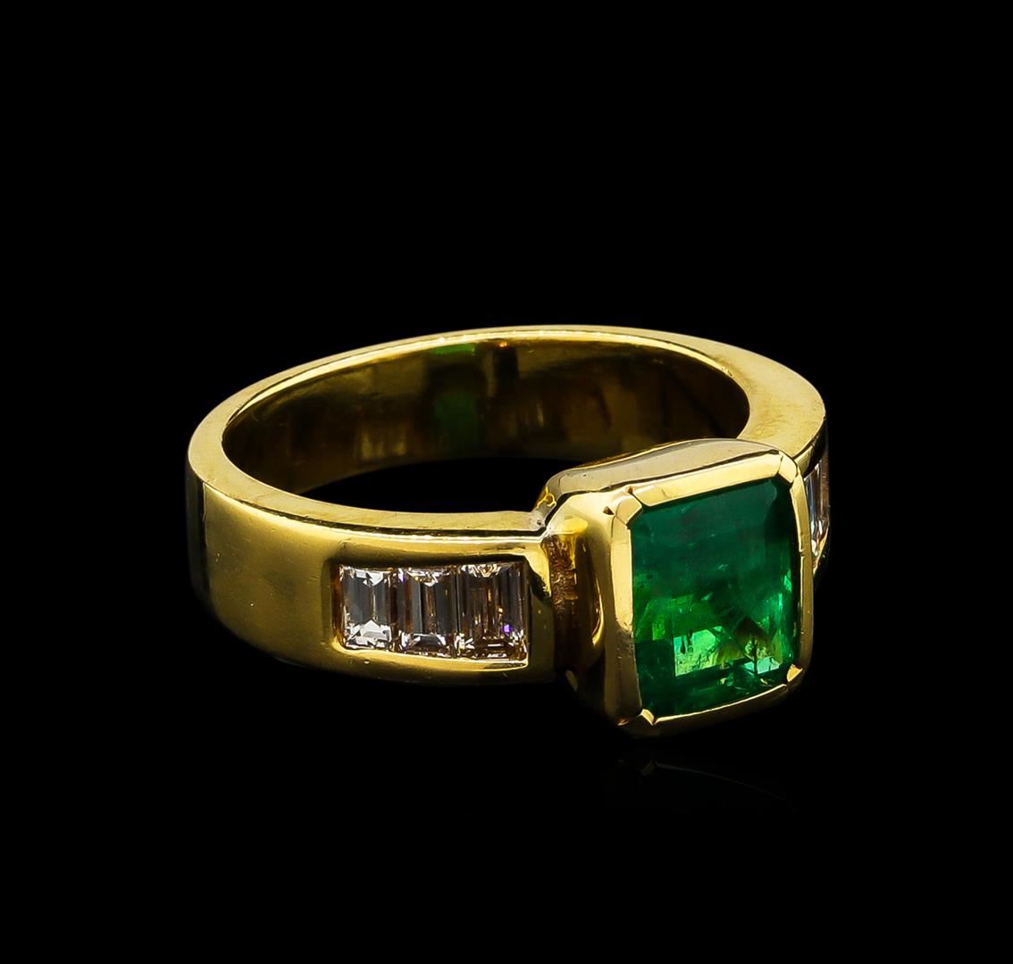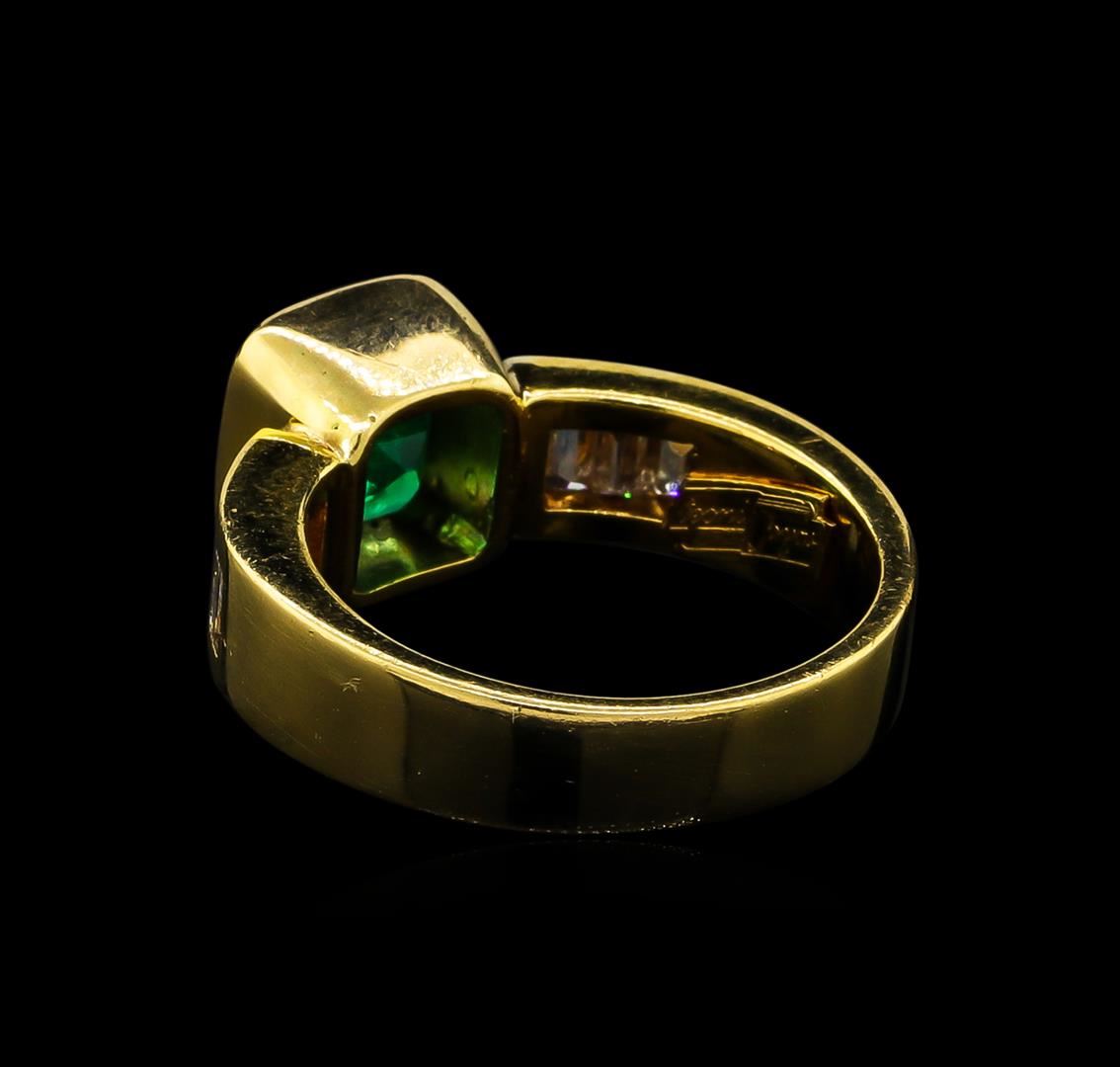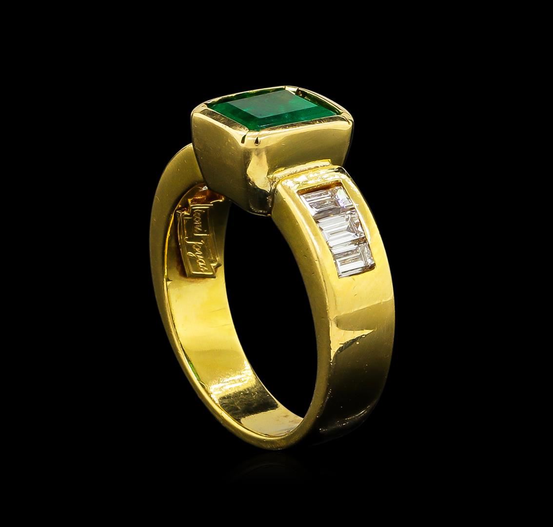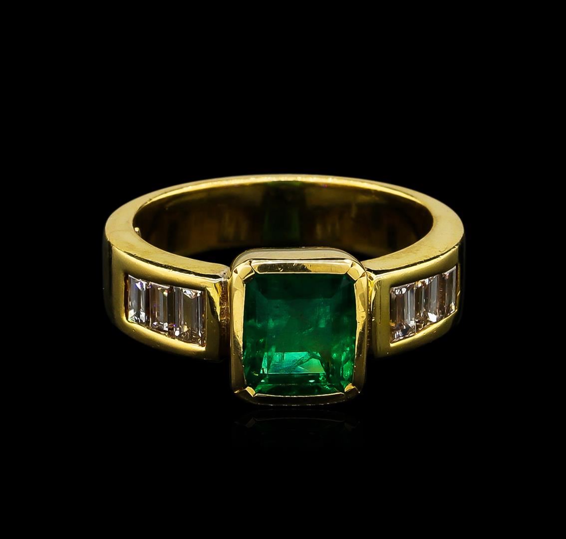 One electronically tested 18KT yellow gold ladies cast emerald and diamond ring with a bright polish finish. The featured emerald is supported by tapering diamond set shoulders, completed by a four millimeter wide band. Trademark is teoni Joyas. Identified with markings of "18K". Condition is good. Containing: One bezel set emerald step cut natural emerald, measuring 8.00 x 7.20 x 5.20mm, 5%. bulge factor, approximate weight of 2.40ct., clarity is moderately included, type III, medium dark, moderately strong, green color, (GIA G 6/4), cut is good. Transmitting light with a minimum of distortion, transparent. Naturally occurring internal & external characteristics are present. Indications of oil residue. Graded in the setting. Six channel set baguette cut (tapered) diamonds, measuring from 3.30 x 2.00 x 1.40mm (depth est.) to 3.70 x 2.30 x 1.61mm (depth est.) approximate total weight of 6 Stones = 0.65ct. Graded in the setting. Clarity: VS-1 to SI-1. Color: G - H. Total Weight of Colored Stones 2.40ct. Total Weight of Diamonds 0.65ct. Total Weight of Ring 9.09gm. AIG Appraised at $7,945.00.