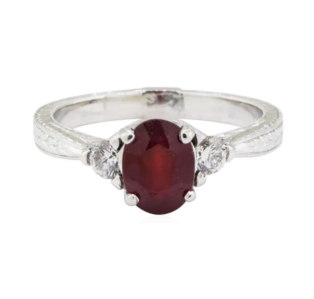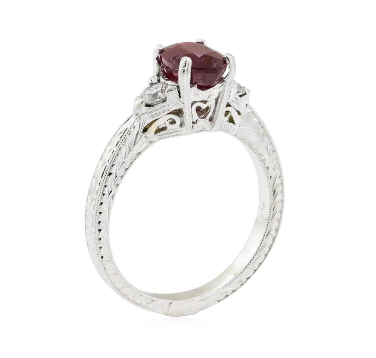 One electronically tested 18KT white gold lady's cast fashion ring with a three stone cathedral motif with a bright polish with milgrain detailing finish. The featured lady's ring has vintage style hand engraved details and a shank measuring 2.65 millimeters wide. Identified with markings of '18K'. Condition is new, good workmanship. Containing: One prong set oval modified mixed cut natural ruby-glass composite, measuring 8.08 x 6.07 x 4.57mm, (depth est.) 10%. bulge factor, approximate weight of 2.10 ct., clarity is heavily included, medium dark, very slightly brownish, slightly purplish red color, (GIA slpR 6/3), cut is good. Transmitting light somewhat diffusely, semi-transparent to translucent. Naturally occurring internal & external characteristics are present. Indications of laboratory high temperature heat treatment, with glass & flux additives. Colored gemstones are presumed to have been subjected to commonly used enhancement processes. Graded in the setting. Two prong set round brilliant cut diamonds, measuring 3.35 - 3.30 x 2.06mm (depth est.) approximate total weight of 2 Stones = 0.30 ct. Graded in the setting. Color G - H Clarity VS-2 Cut Very Good. Total Weight of Colored Stones 2.10 ct.. Total Weight of Diamonds 0.30 ct.. Total Weight of Ring 7.50gm GAS Appraised at $2870.00. GAS Appraised.