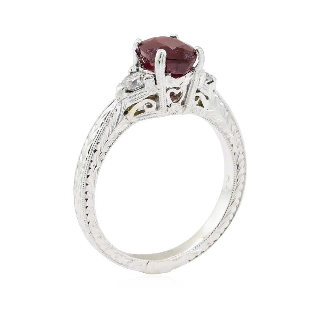 One electronically tested 18KT white gold lady's cast fashion ring with a three stone cathedral motif with a bright polish with milgrain detailing finish. The featured lady's ring has vintage style hand engraved details and a shank measuring 2.65 millimet