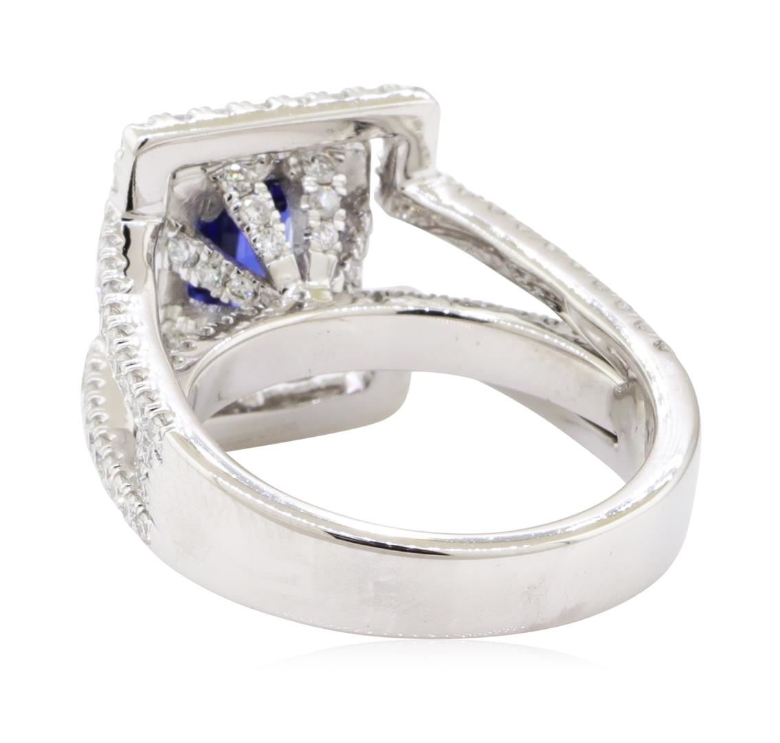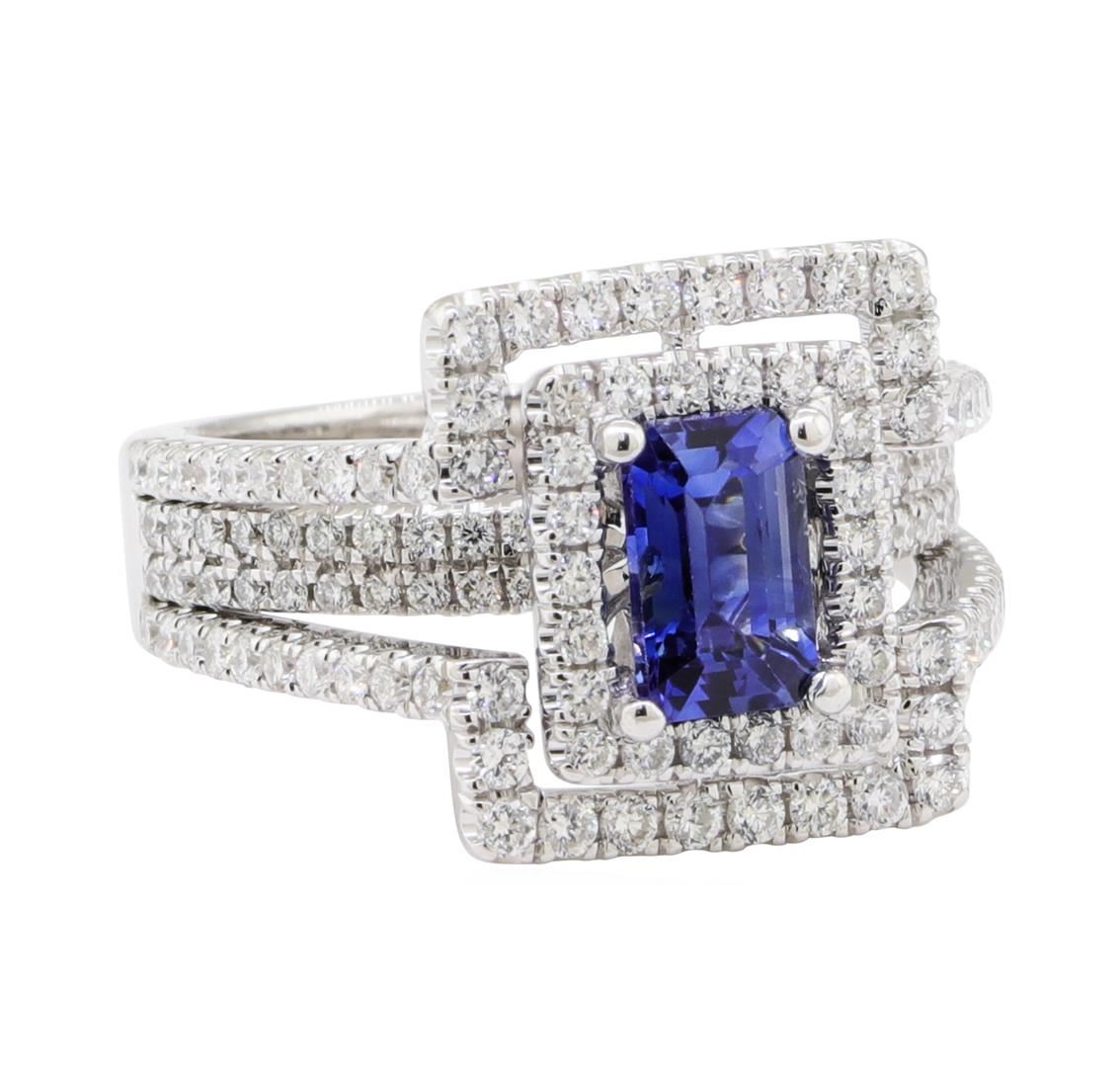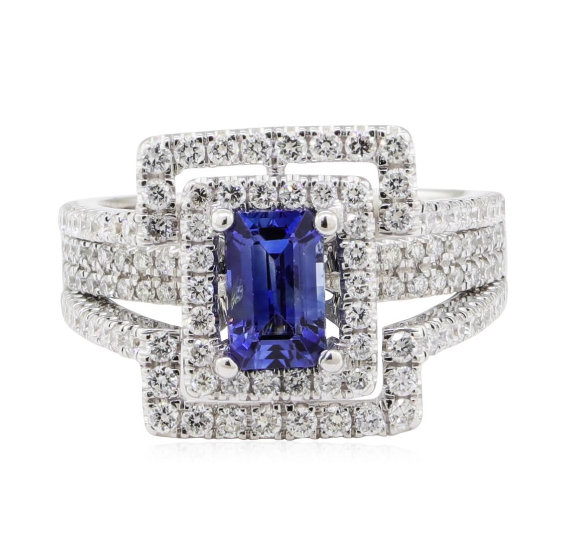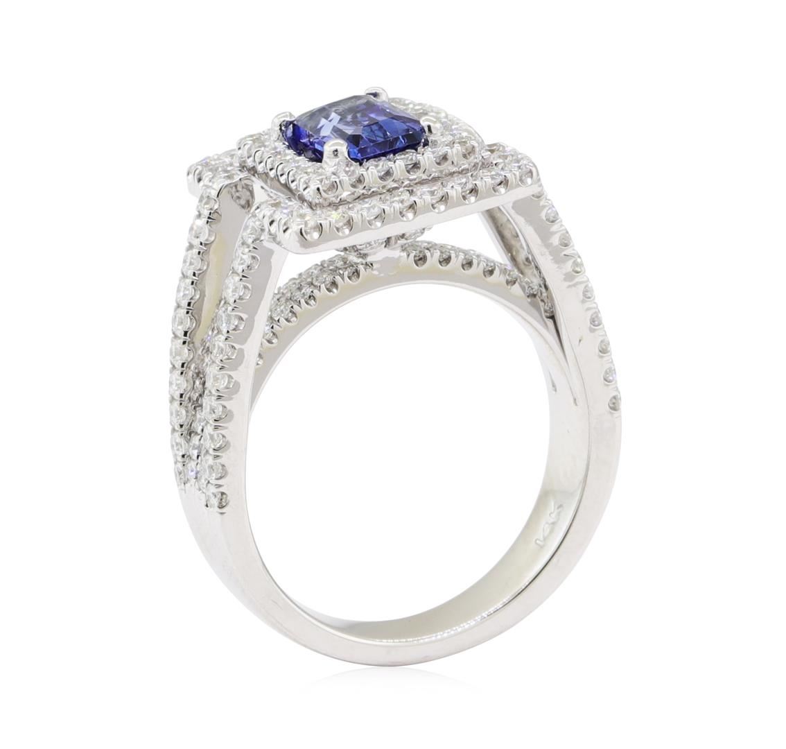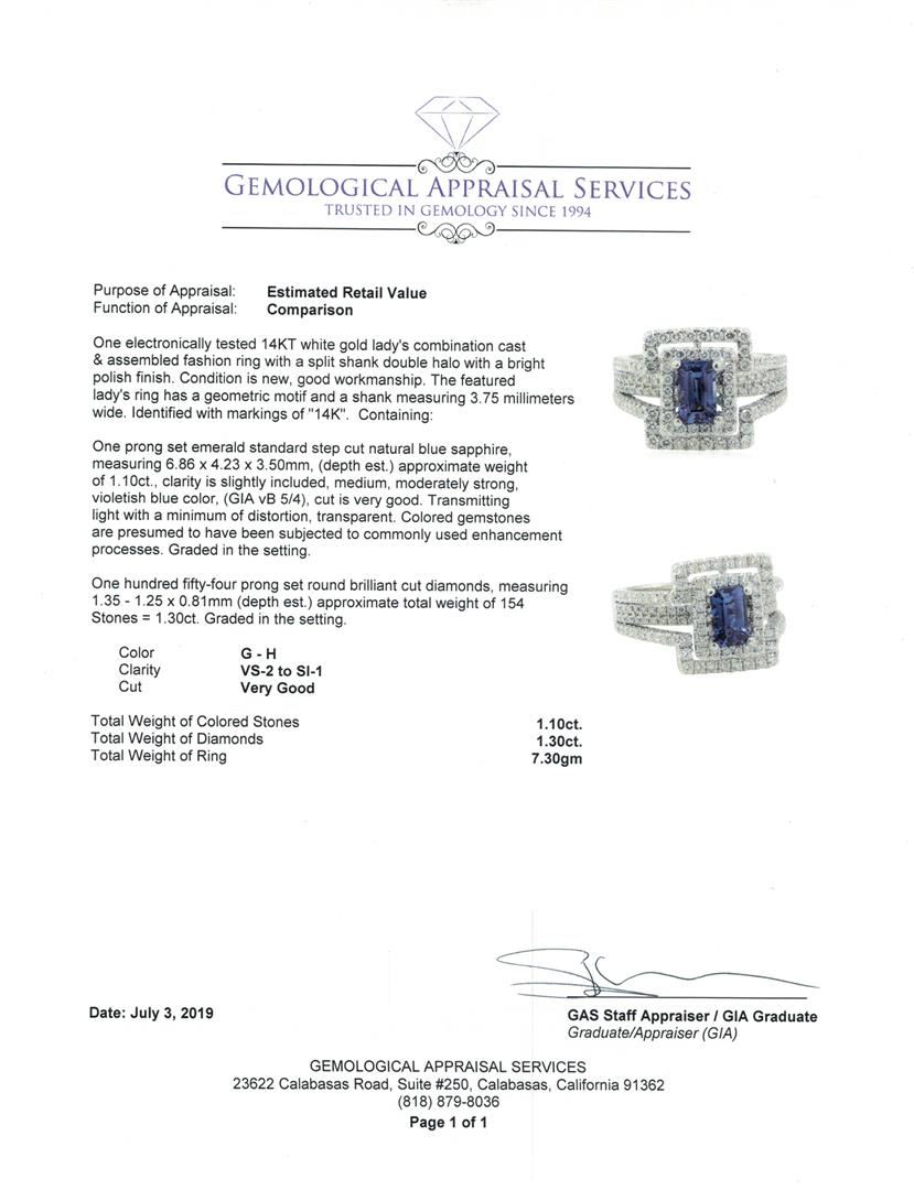 One electronically tested 14KT white gold lady's combination cast & assembled fashion ring with a split shank double halo with a bright polish finish. The featured lady's ring has a geometric motif and a shank measuring 3.75 millimeters wide. Identified with markings of '14K'. Condition is new, good workmanship. Containing: One prong set emerald standard step cut natural blue sapphire, measuring 6.86 x 4.23 x 3.50mm, (depth est.) approximate weight of 1.10ct., clarity is slightly included, medium, moderately strong, violetish blue color, (GIA vB 5/4), cut is very good. Transmitting light with a minimum of distortion, transparent. Colored gemstones are presumed to have been subjected to commonly used enhancement processes. Graded in the setting. One Hundred Fifty-Four prong set round brilliant cut diamonds, measuring 1.35 - 1.25 x 0.81mm (depth est.) approximate total weight of 154 Stones = 1.30ct. Graded in the setting. Color G - H Clarity VS-2 to SI-1 Cut Very Good. Total Weight of Colored Stones 1.10ct.. Total Weight of Diamonds 1.30ct.. Total Weight of Ring 7.30gm GAS Appraised at $7765.00. GAS Appraised at $7,765.00.