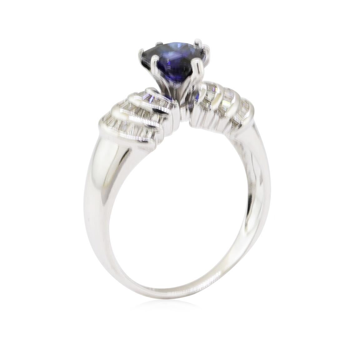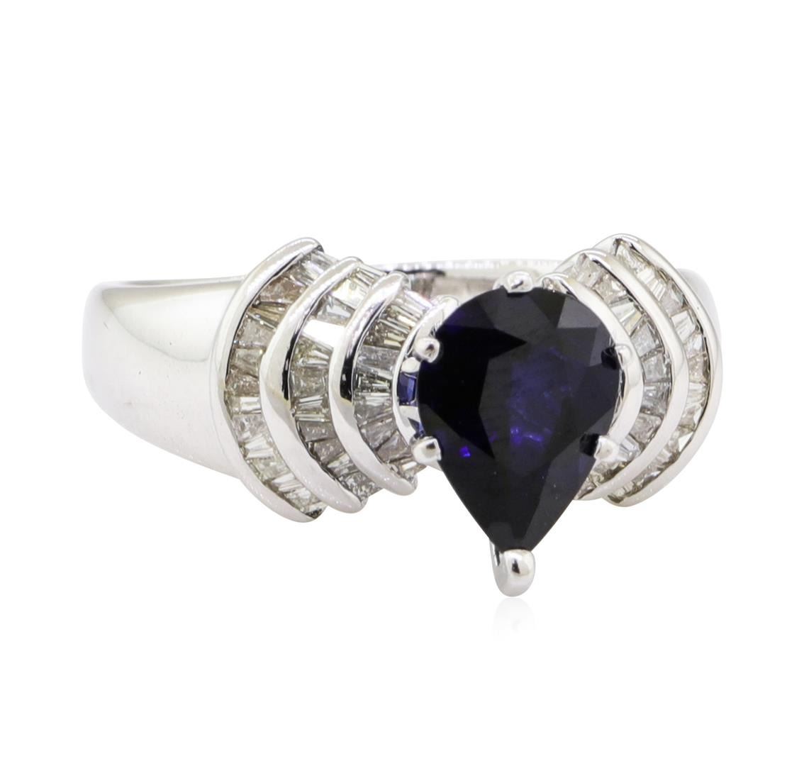 One electronically tested 18KT white gold lady's combination cast & assembled fashion ring with a tapered cathedral shank with a bright polish finish. The featured lady's ring has diamond set half dome shoulders and a shank measuring 2.30 millimeters wide. Identified with markings of '18K'. Condition is like new, good workmanship. Containing: One prong set pear modified mixed cut natural blue sapphire, measuring 8.70 x 6.85 x 3.50mm, (depth est.) approximate weight of 1.70 ct., clarity is moderately included, dark, strong, violetish blue color, (GIA vB 7/5), cut is very good. Transmitting light somewhat diffusely, transparent to translucent. Colored gemstones are presumed to have been subjected to commonly used enhancement processes. Graded in the setting. Fifty-Eight channel set baguette cut (tapered) diamonds, measuring from 1.40 x 0.95 x 0.81mm (depth est.) to 1.50 x 1.10 x 0.94mm (depth est.) approximate total weight of 58 Stones = 0.70 ct. Graded in the setting. Color H - J Clarity SI-1 to SI-2 Cut Good. Total Weight of Colored Stones 1.70 ct.. Total Weight of Diamonds 0.70 ct.. Total Weight of Ring 6.10gm GAS Appraised at $4875.00. GAS Appraised.