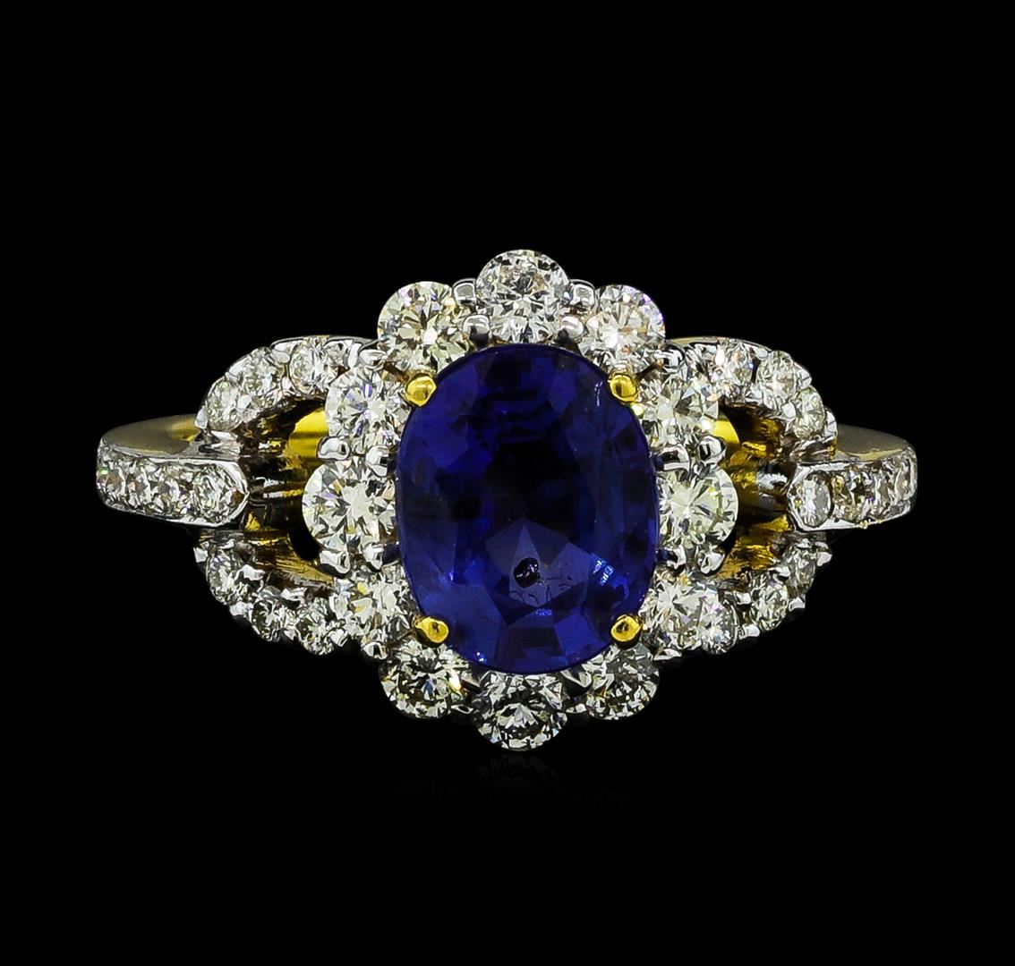 One electronically tested 18KT yellow gold ladies cast sapphire and diamond ring. The featured sapphire is set within a diamond bezel supported by stylized diamond set shoulders, completed by a two millimeter wide band. Bright polish finish with rhodium accents. Identified with markings of '750'. Condition is good. Containing: One prong set oval mixed cut natural blue sapphire, measuring 8.91 x 7.07 x 4.10mm, exact weight 2.40ct., clarity is moderately included, type II, medium dark, very slightly grayish, violetish blue color, (GIA vB 6/3), cut is good. Transmitting light with a minimum of distortion, transparent. Naturally occurring internal & external characteristics are present. No indications of heating. Origin is Myanmar. Asian Institute of Gemological Sciences (AIGS) Report attached. Graded loose in the AIGS Laboratory. AIGS Report # GF16011075. Twelve prong set round brilliant cut diamonds, measuring 2.70 - 2.40 x 1.53mm (depth est.) approximate total weight of 12 Stones = 0.73ct. Graded in the setting. Clarity SI-1 to SI-2. Color: H - J Twenty-Four prong set round brilliant cut diamonds, measuring 1.60 - 1.50 x 0.93mm (depth est.) approximate total weight of 24 Stones = 0.38ct. Brown secondary color throughout. Graded in the setting. Clarity VS-2 to SI-2. Color: H - J. Total Weight of Colored Stones 2.40ct.. Total Weight of Diamonds 1.11ct.. Total Weight of Ring 6.56gm. AIG Appraised at $18,165.00.