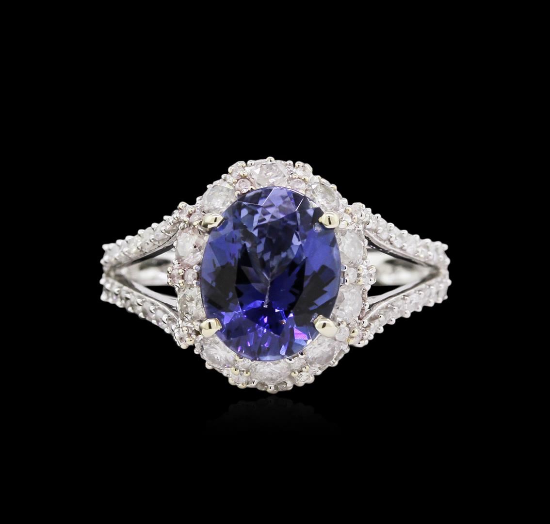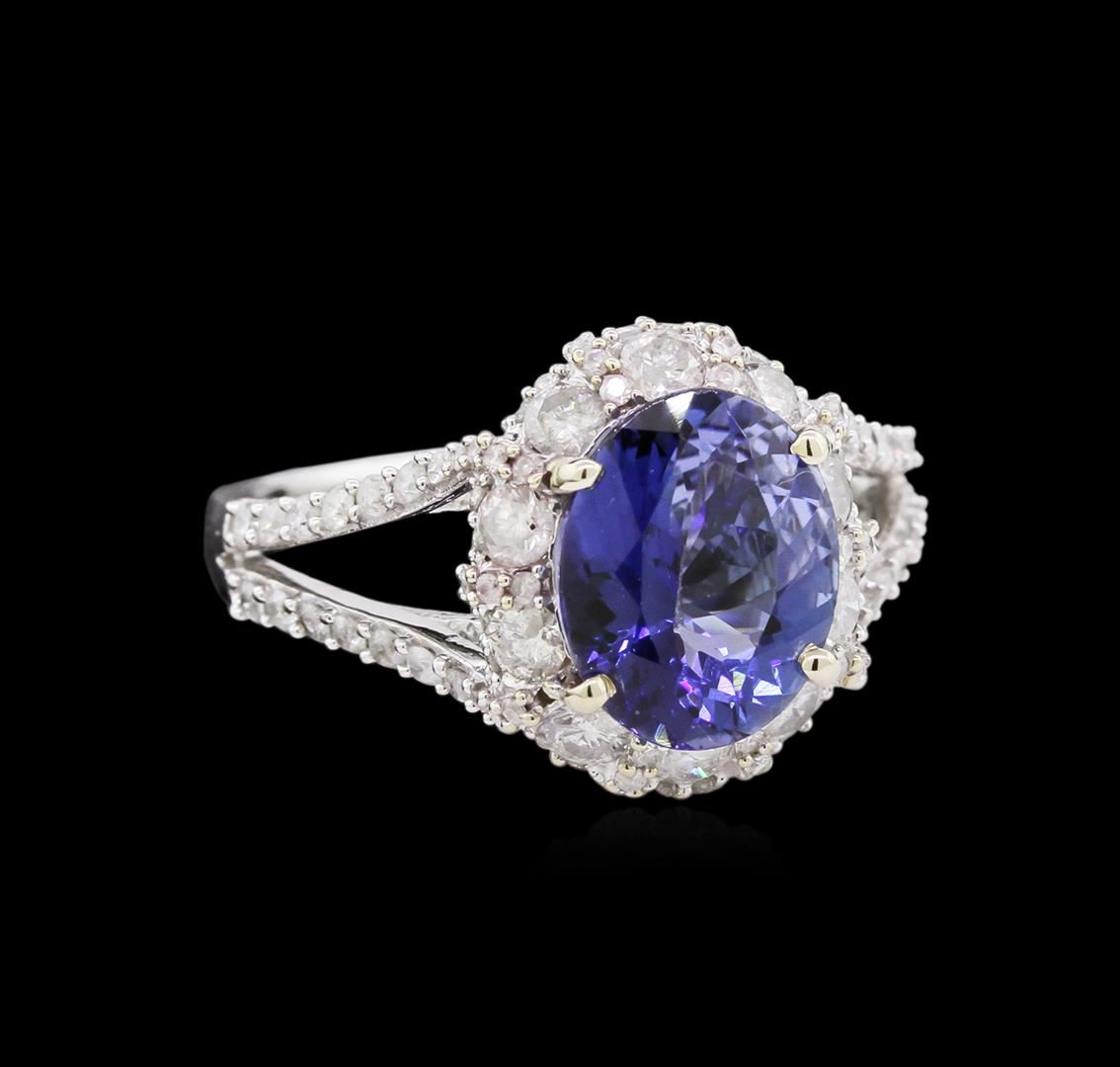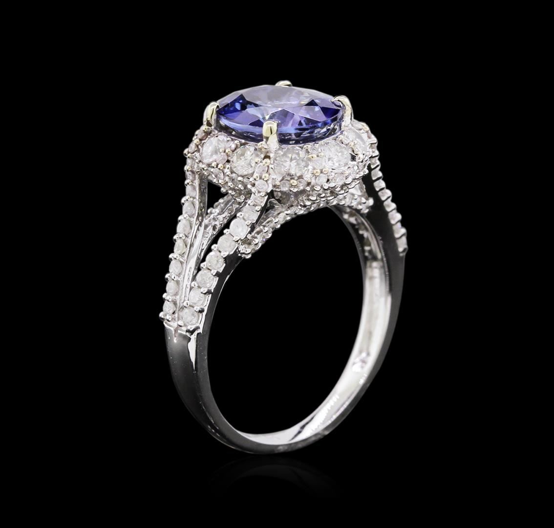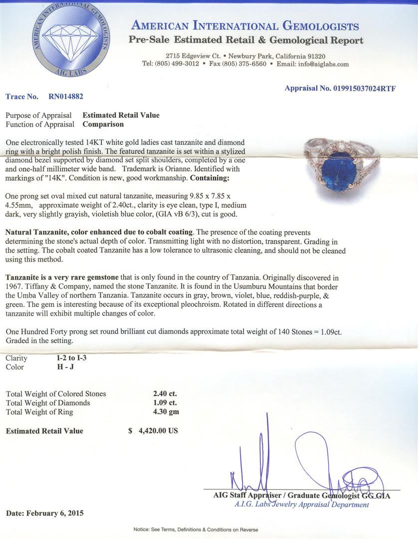 One electronically tested 14KT white gold ladies cast tanzanite and diamond ring with a bright polish finish. The featured tanzanite is set within a stylized diamond bezel supported by diamond set split shoulders, completed by a one and one-half millimeter wide band. Trademark is Orianne. Identified with markings of "14K". Condition is new, good workmanship. One prong set oval mixed cut natural tanzanite, measuring 9.85 x 7.85 x 4.55mm, approximate weight of 2.40ct., clarity is eye clean, type I, medium dark, very slightly grayish, violetish blue color, (GIA vB 6/3), cut is good. Natural Tanzanite, color enhanced due to cobalt coating. The presence of the coating prevents determining the stone's actual depth of color. Transmitting light with no distortion, transparent. Grading in the setting. The cobalt coated Tanzanite has a low tolerance to ultrasonic cleaning, and should not be cleaned using this method. Tanzanite is a very rare gemstone that is only found in the country of Tanzania. Originally discovered in 1967. Tiffany & Company, named the stone Tanzanite. It is found in the Usumburu Mountains that border the Umba Valley of northern Tanzania. Tanzanite occurs in gray, brown, violet, blue, reddish-purple, & green. The gem is interesting because of its exceptional pleochroism. Rotated in different directions a tanzanite will exhibit multiple changes of color. One Hundred Forty prong set round brilliant cut diamonds approximate total weight of 140 Stones = 1.09ct. Graded in the setting. Clarity: I-2 to I-3. Color: H - J. Total Weight of Colored Stones 2.40ct. Total Weight of Diamonds 1.09ct. AIG Appraised at $4,420.00.
