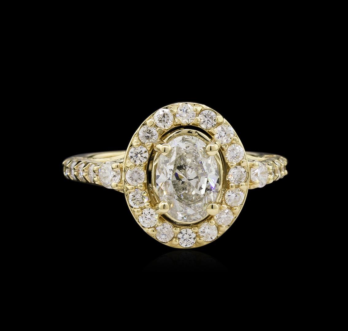 One electronically tested 14KT yellow gold lady's cast wedding ring with a halo with a bright polish finish. The featured lady's ring has a shank measuring 2.24 millimeters wide. Identified with markings of "K14". Condition is new, good workmanship. Containing: One prong set oval shaped cut diamond, measuring 8.18 x 5.98 x 4.01mm (depth est.) , 10.00.%. GTCF approximate weight of 1.47ct. Graded in the setting. Clarity: I-1. Color: I - Good Two prong set round brilliant cut diamonds, measuring 2.75 - 2.70 x 1.64mm (depth est.) approximate total weight of 2 Stones = 0.15ct. Graded in the setting. Clarity: SI-2 to I-1. Color: H - I. Cut Good Twenty-Four prong set round brilliant cut diamonds, measuring 1.90 - 1.85 x 1.17mm (depth est.) approximate total weight of 24 Stones = 0.60ct. Graded in the setting. Clarity: SI-1 to I-1. Color: H - I. Cut Good Forty-Eight prong set round brilliant cut diamonds, measuring 1.00 - 0.95 x 0.62mm (depth est.) approximate total weight of 48 Stones = 0.18ct. Graded in the setting. Clarity: SI-1 to I-1. Color: H - I. Cut Good. Total Weight of Diamonds 2.40ct. Total Weight of Ring 5.40gm. GAS Appraised at $10,730.00.