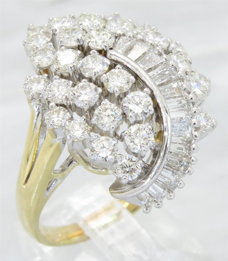 One tested 14K yellow gold diamond ring. Containing: 30 Round Brilliant Cut Diamonds. Clarity: VS-SI, Color: F-H. Approximate total diamond weight: 2.40CTW. Diamonds are graded in the mounting, unless otherwise stated. Weight of ring: 10.5 grams. Size: 6.5.