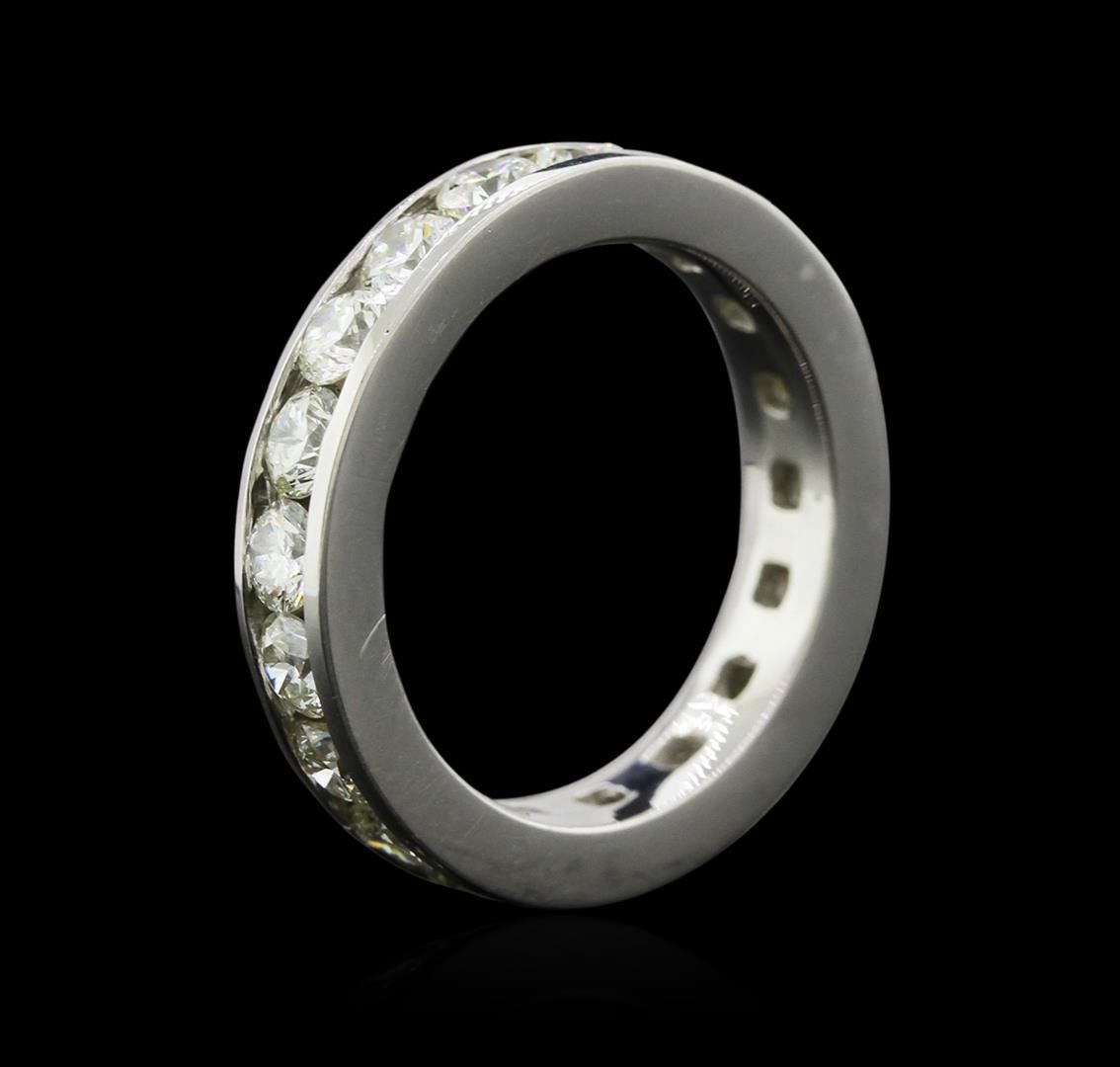 One electronically tested platinum ladies cast diamond eternity ring with a bright polish finish. Condition is very good. Containing: Twenty channel set round brilliant cut diamonds, measuring 3.20 - 3.20 x 1.92mm (depth est.) approximate total weight of 20 Stones = 2.40ct. Clarity: VS-2. Color: J - K, Cut is Good. Diamonds are graded in the mounting, unless otherwise stated. Total Weight of Diamonds 2.40ct. Total Weight of Eternity Ring 6.70 grams. GGL Appraised at $5,165.00.