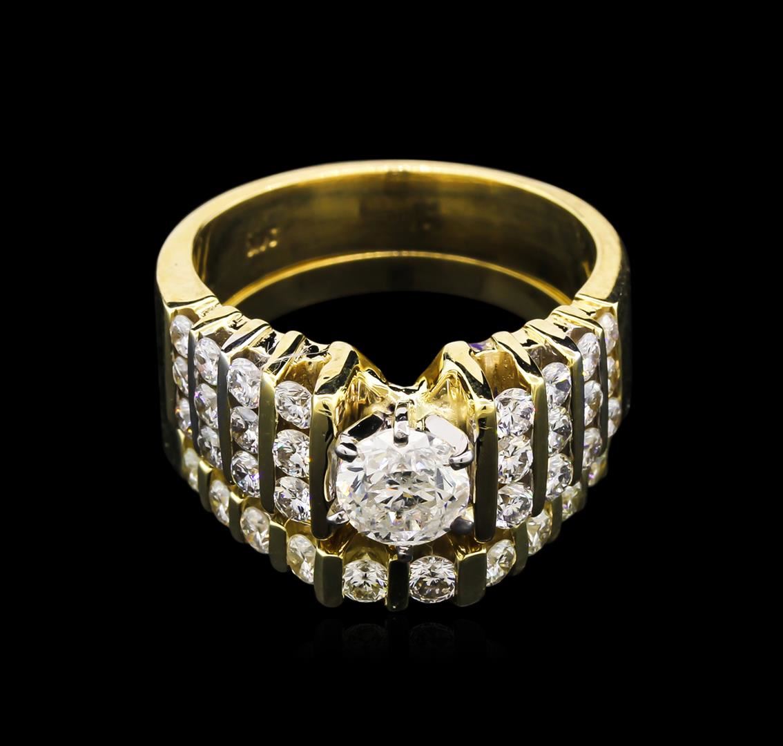 One electronically tested 14KT yellow gold lady's combination cast & assembled ring & wedding band with a bright polish finish. The featured lady's ring has a double shank measuring 7.00 millimeters wide. Identified with markings of "14K". Condition is new, good workmanship. Containing: One prong set round brilliant cut diamond, measuring 5.93 - 5.90 x 4.20mm (depth est.) approximate weight of 0.90ct. Graded in the setting. Clarity: I-1. Color: F. Cut Good Ten channel set round brilliant cut diamonds, measuring 2.40 - 2.20 x 1.50mm (depth est.) approximate total weight of 10 Stones = 0.50ct. Graded in the setting. Clarity: VS-2 to SI-2. Color: G - Good Twenty-Four channel set round brilliant cut diamonds, measuring 2.30 - 2.00 x 1.40mm (depth est.) approximate total weight of 24 Stones = 1.00ct. Graded in the setting. Clarity: VS-2 to SI-1. Color: H - I. Cut Good. Total Weight of Diamonds 2.40ct. Total Weight of Ring & Wedding Band 15.00gm. GAS Appraised at $9,135.00.