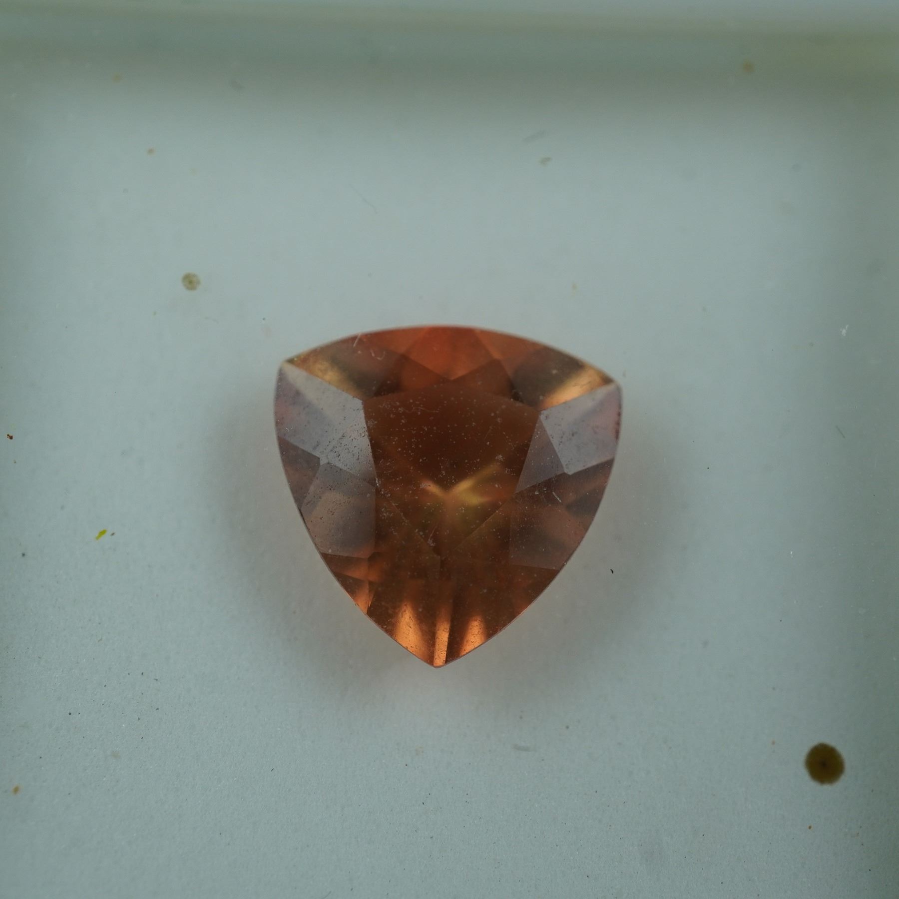 This stunning honey labradorite gemstone features a trillion cut and weighs approximately 2.41 carats. The warm honey tones of this gemstone are complemented by its unique iridescent sheen, a signature characteristic of labradorite. An exquisite choice for custom jewelry designs. Comes with a protective case.