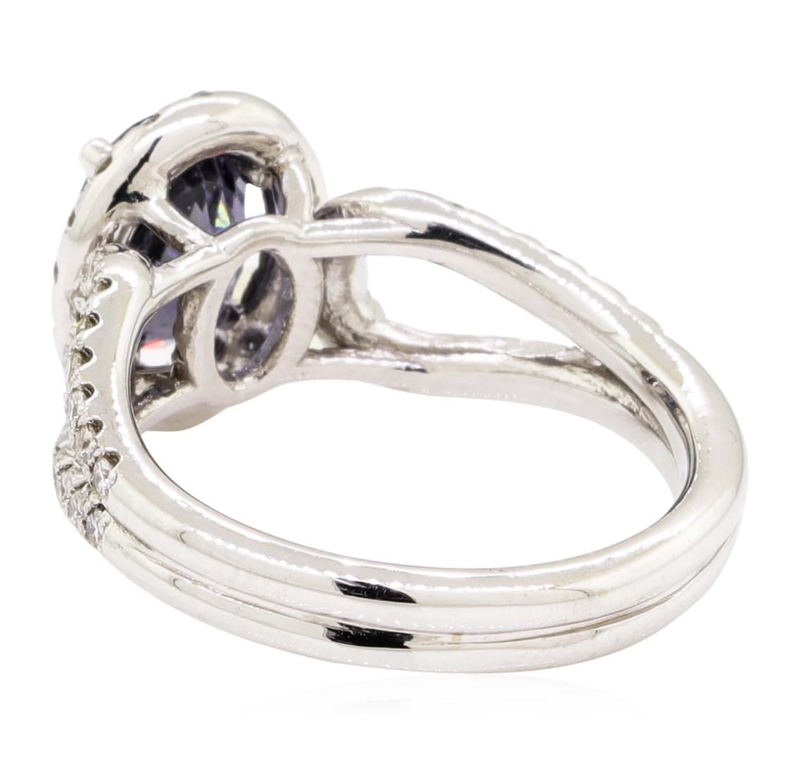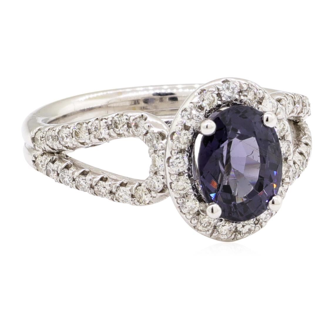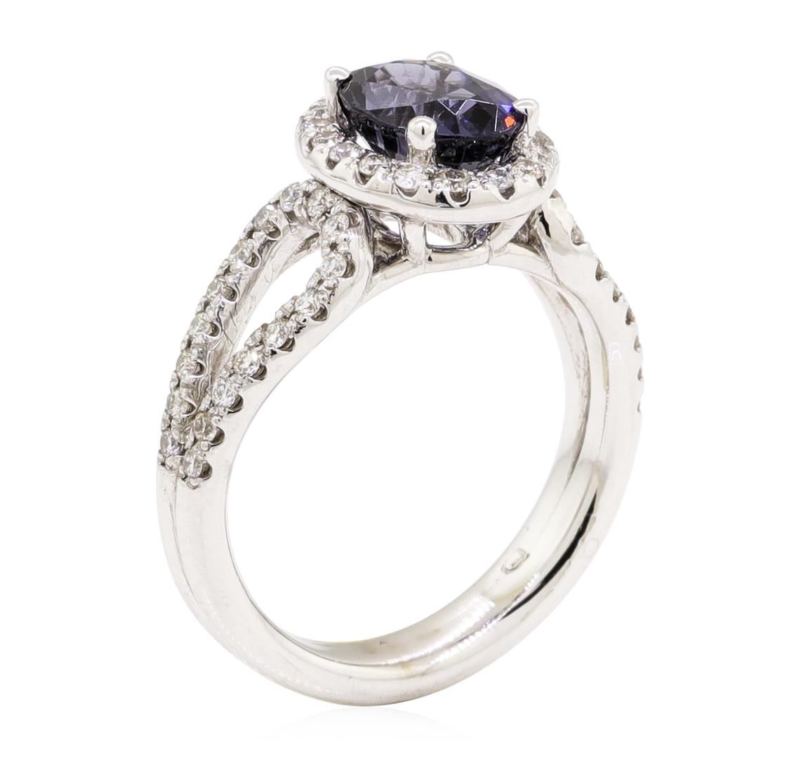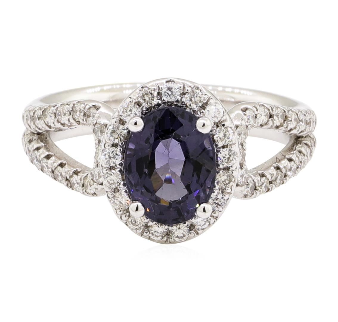 One electronically tested 14KT white gold lady's combination cast & assembled fashion ring with a split shank halo with a bright polish finish. The featured lady's ring has a shank measuring 3.45 millimeters wide. Identified with markings of '14K'. Condition is new, good workmanship. Containing: One prong set oval modified mixed cut natural lavender spinel, measuring 8.37 x 6.47 x 4.48mm, (depth est.) approximate weight of 1.93ct., clarity is slightly included, medium dark, very slightly grayish, bluish purple color, (GIA bP 6/3), cut is good. Transmitting light with a minimum of distortion, transparent. Colored gemstones are presumed to have been subjected to commonly used enhancement processes. Graded in the setting. Fifty prong set round brilliant cut diamonds, measuring 1.40 - 1.35 x 0.86mm (depth est.) approximate total weight of 50 Stones = 0.48ct. Graded in the setting. Color H - I Clarity SI-1 to SI-2 Cut Good. Total Weight of Colored Stones 1.93ct.. Total Weight of Diamonds 0.48ct.. Total Weight of Ring 5.90gm GAS Appraised at $2925.00. GAS Appraised at $2,925.00.