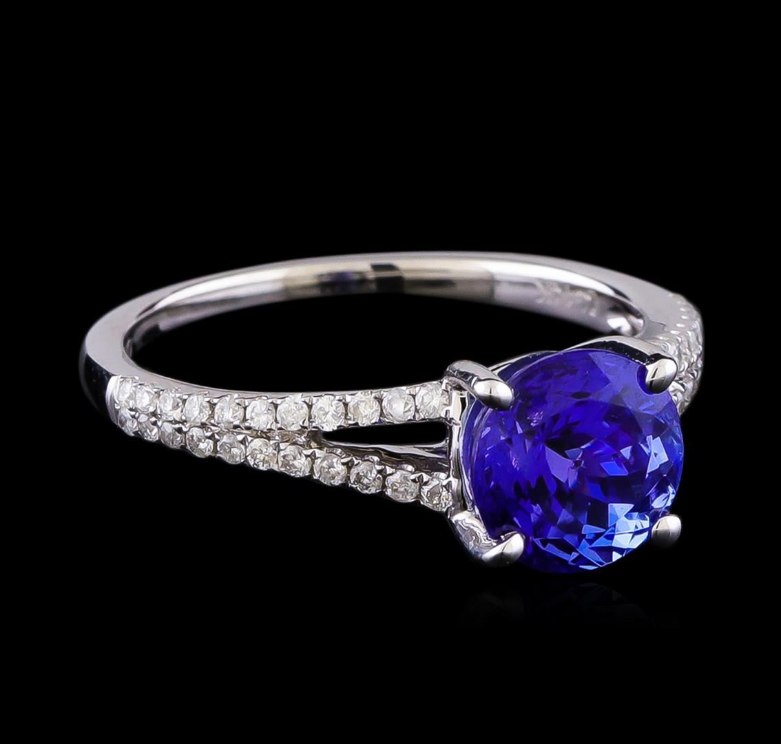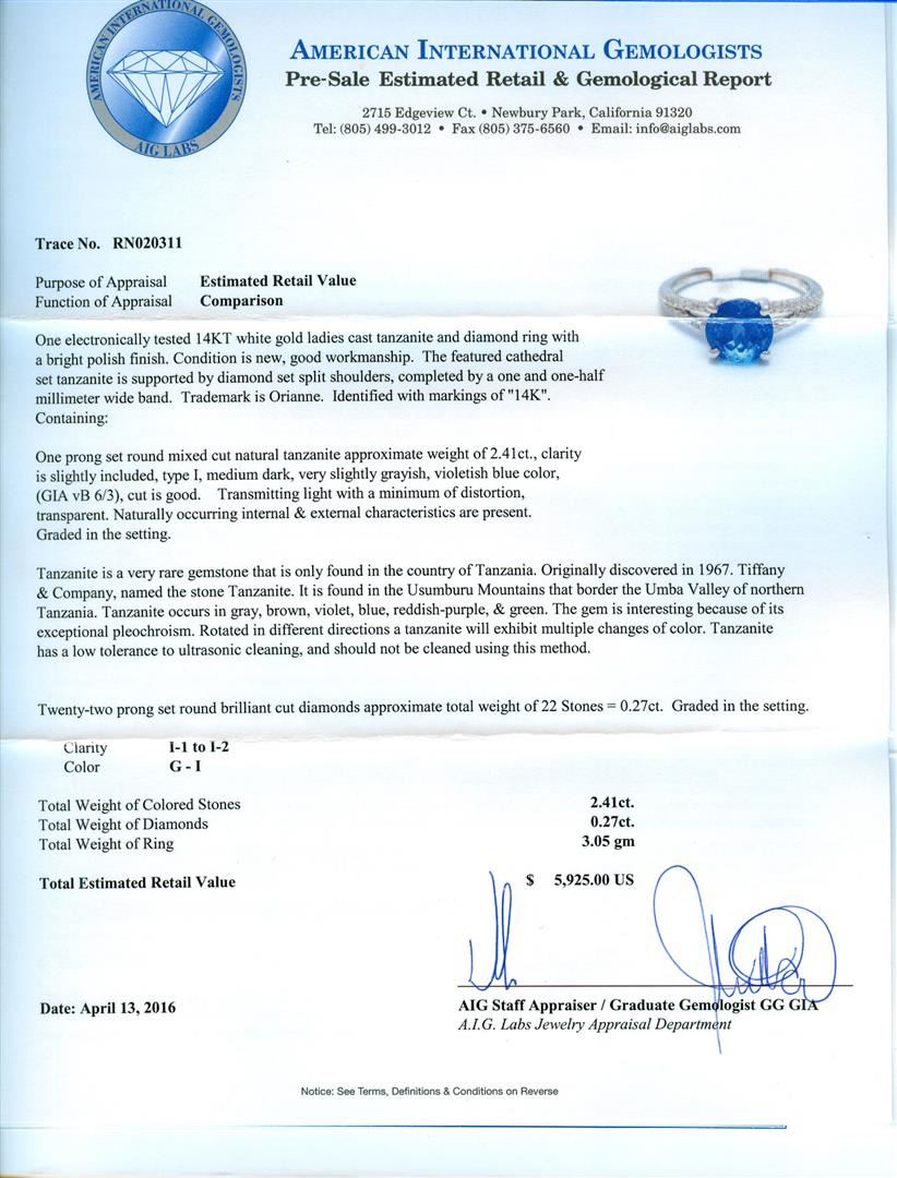 One electronically tested 14KT white gold ladies cast tanzanite and diamond ring with a bright polish finish. The featured cathedral set tanzanite is supported by diamond set split shoulders, completed by a one and one-half millimeter wide band. Trademark is Orianne. Identified with markings of "14K". Condition is new, good workmanship. Containing: One prong set round mixed cut natural tanzanite approximate weight of 2.41ct., clarity is slightly included, type I, medium dark, very slightly grayish, violetish blue color, (GIA vB 6/3), cut is good. Transmitting light with a minimum of distortion, transparent. Naturally occurring internal & external characteristics are present. Graded in the setting. Tanzanite is a very rare gemstone that is only found in the country of Tanzania. Originally discovered in 1967. Tiffany & Company, named the stone Tanzanite. It is found in the Usumburu Mountains that border the Umba Valley of northern Tanzania. Tanzanite occurs in gray, brown, violet, blue, reddish-purple, & green. The gem is interesting because of its exceptional pleochroism. Rotated in different directions a tanzanite will exhibit multiple changes of color. Tanzanite has a low tolerance to ultrasonic cleaning, and should not be cleaned using this method. Twenty-Two prong set round brilliant cut diamonds approximate total weight of 22 Stones = 0.27ct. Graded in the setting. Clarity: I-1 to I-2. Color: G - I. Total Weight of Colored Stones 2.41ct. Total Weight of Diamonds 0.27ct. Total Weight of Ring 3.05gm. AIG Appraised at $5,925.00.