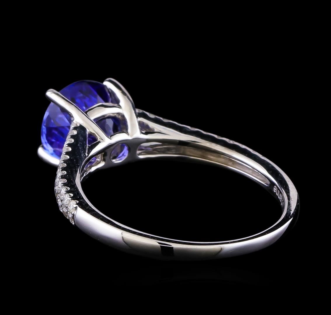 One electronically tested 14KT white gold ladies cast tanzanite and diamond ring with a bright polish finish. The featured cathedral set tanzanite is supported by diamond set split shoulders, completed by a one and one-half millimeter wide band. Trademark is Orianne. Identified with markings of "14K". Condition is new, good workmanship. Containing: One prong set round mixed cut natural tanzanite approximate weight of 2.41ct., clarity is slightly included, type I, medium dark, very slightly grayish, violetish blue color, (GIA vB 6/3), cut is good. Transmitting light with a minimum of distortion, transparent. Naturally occurring internal & external characteristics are present. Graded in the setting. Tanzanite is a very rare gemstone that is only found in the country of Tanzania. Originally discovered in 1967. Tiffany & Company, named the stone Tanzanite. It is found in the Usumburu Mountains that border the Umba Valley of northern Tanzania. Tanzanite occurs in gray, brown, violet, blue, reddish-purple, & green. The gem is interesting because of its exceptional pleochroism. Rotated in different directions a tanzanite will exhibit multiple changes of color. Tanzanite has a low tolerance to ultrasonic cleaning, and should not be cleaned using this method. Twenty-Two prong set round brilliant cut diamonds approximate total weight of 22 Stones = 0.27ct. Graded in the setting. Clarity: I-1 to I-2. Color: G - I. Total Weight of Colored Stones 2.41ct. Total Weight of Diamonds 0.27ct. Total Weight of Ring 3.05gm. AIG Appraised at $5,925.00.
