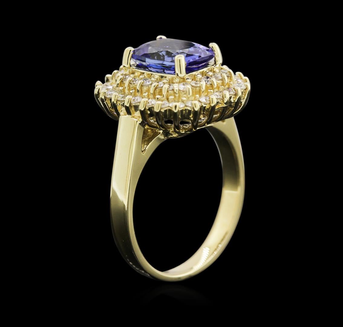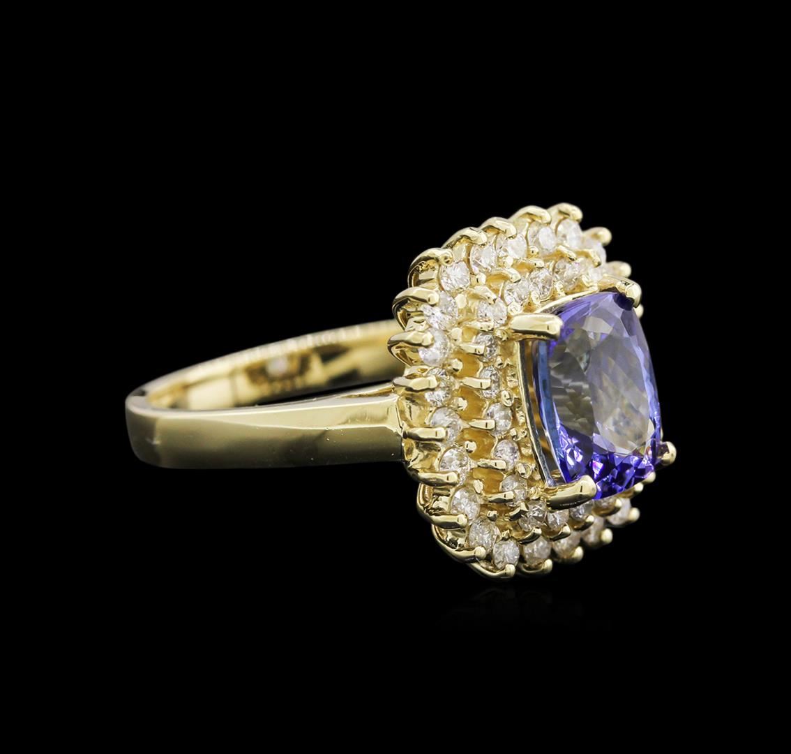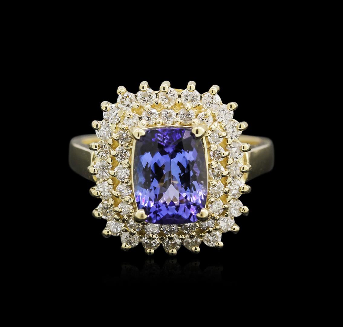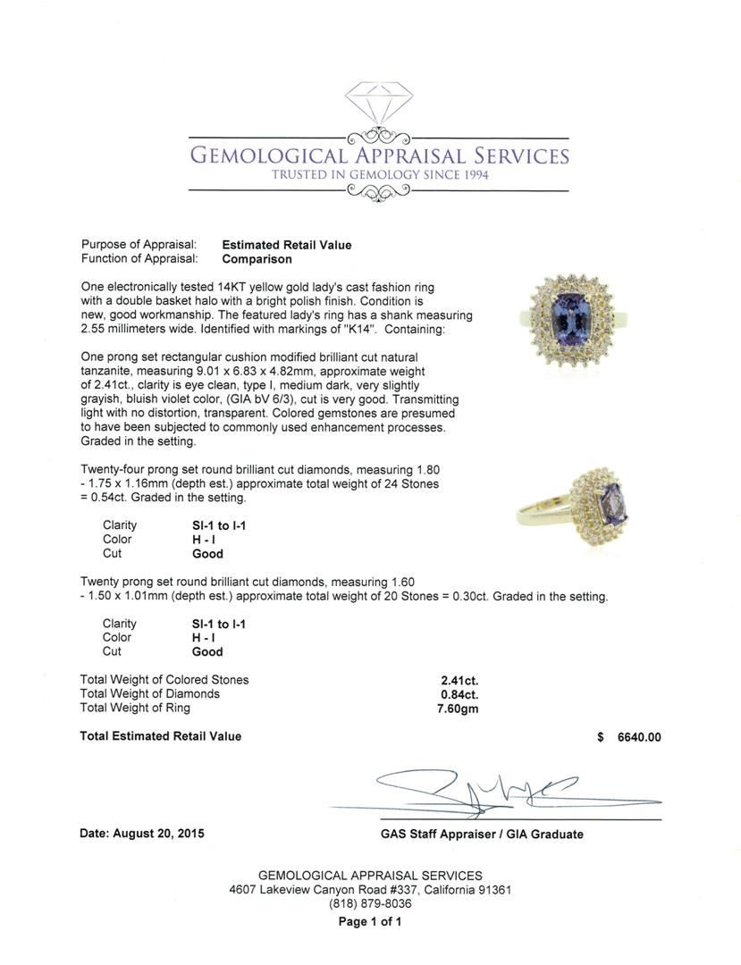 One electronically tested 14KT yellow gold lady's cast fashion ring with a double basket halo with a bright polish finish. The featured lady's ring has a shank measuring 2.55 millimeters wide. Identified with markings of "K14". Condition is new, good workmanship. Containing: One prong set rectangular cushion modified brilliant cut natural tanzanite, measuring 9.01 x 6.83 x 4.82mm, approximate weight of 2.41ct., clarity is eye clean, type I, medium dark, very slightly grayish, bluish violet color, (GIA bV 6/3), cut is very good. Transmitting light with no distortion, transparent. Colored gemstones are presumed to have been subjected to commonly used enhancement processes. Graded in the setting. Twenty-Four prong set round brilliant cut diamonds, measuring 1.80 - 1.75 x 1.16mm (depth est.) approximate total weight of 24 Stones = 0.54ct. Graded in the setting. Clarity: SI-1 to I-1. Color: H - I. Cut Good Twenty prong set round brilliant cut diamonds, measuring 1.60 - 1.50 x 1.01mm (depth est.) approximate total weight of 20 Stones = 0.30ct. Graded in the setting. Clarity: SI-1 to I-1. Color: H - I. Cut Good. Total Weight of Colored Stones 2.41ct. Total Weight of Diamonds 0.84ct. Total Weight of Ring 7.60gm. GAS Appraised at $6,640.00.