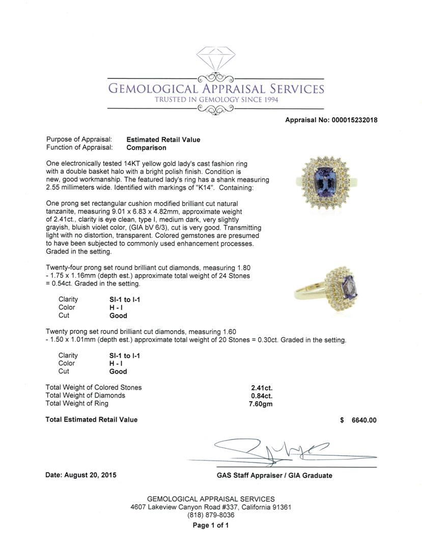 One electronically tested 14KT yellow gold lady's cast fashion ring with a double basket halo with a bright polish finish. The featured lady's ring has a shank measuring 2.55 millimeters wide. Identified with markings of "K14". Condition is new, good workmanship. Containing: One prong set rectangular cushion modified brilliant cut natural tanzanite, measuring 9.01 x 6.83 x 4.82mm, approximate weight of 2.41ct., clarity is eye clean, type I, medium dark, very slightly grayish, bluish violet color, (GIA bV 6/3), cut is very good. Transmitting light with no distortion, transparent. Colored gemstones are presumed to have been subjected to commonly used enhancement processes. Graded in the setting. Twenty-Four prong set round brilliant cut diamonds, measuring 1.80 - 1.75 x 1.16mm (depth est.) approximate total weight of 24 Stones = 0.54ct. Graded in the setting. Clarity: SI-1 to I-1. Color: H - I. Cut Good Twenty prong set round brilliant cut diamonds, measuring 1.60 - 1.50 x 1.01mm (depth est.) approximate total weight of 20 Stones = 0.30ct. Graded in the setting. Clarity: SI-1 to I-1. Color: H - I. Cut Good. Total Weight of Colored Stones 2.41ct. Total Weight of Diamonds 0.84ct. Total Weight of Ring 7.60gm. GAS Appraised at $6,640.00.