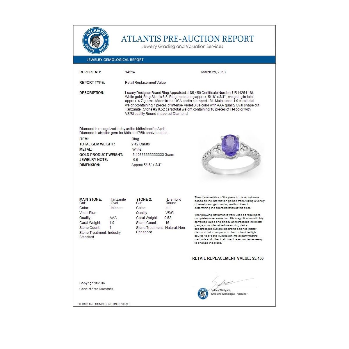 REF-76W2F -14254 ---- 2.42 CTW Tanzanite & Diamond Ring 18K White Gold ---- Luxury Designer Brand Ring Appraised at $5,450 Certificate Number US14254 18k White gold, Ring Size is 6.5, Ring measuring approx. 5/16" x 3/4" , weighing in total approx. 4.7 grams. Made in the USA and is stamped 18k, Main stone 1.9 carat total weight containing 1 pieces of Intense Violet Blue color with AAA quality Oval shape cut Tanzanite , Stone #2 0.52 carat total weight containing 16 pieces of H-I color with VS/SI quality Round shape cut Diamond