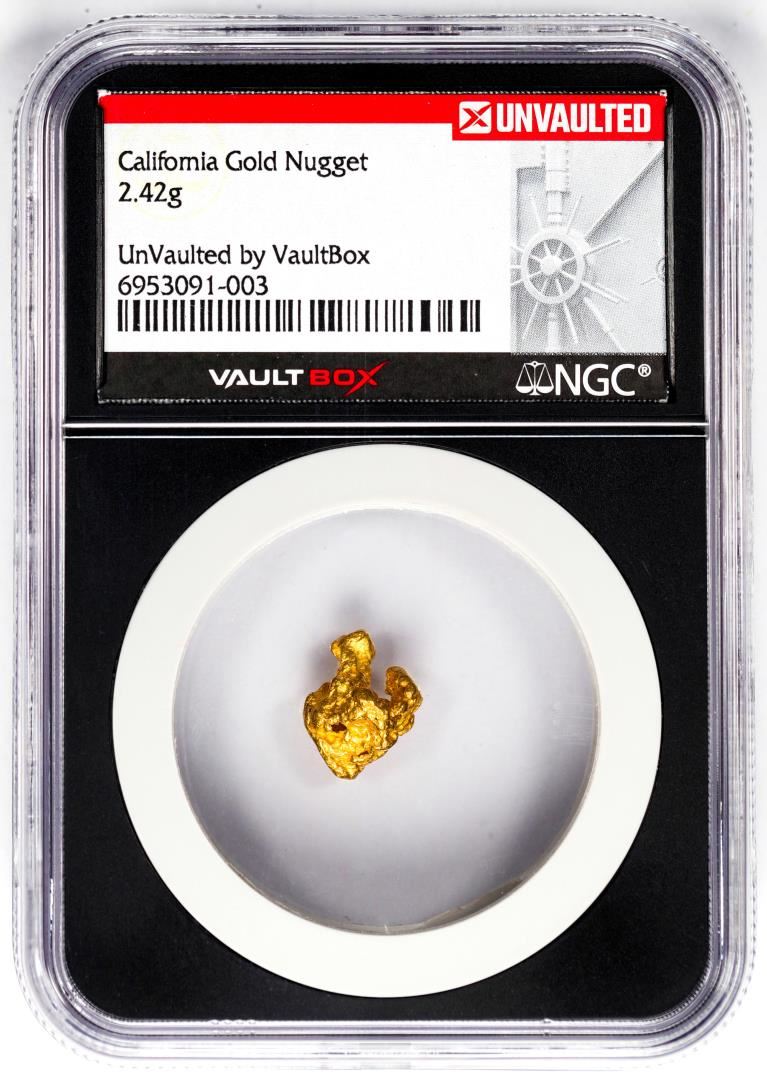 One 2.42 Gram California Gold Nugget NGC Vaultbox Unvaulted. NGC Certified.