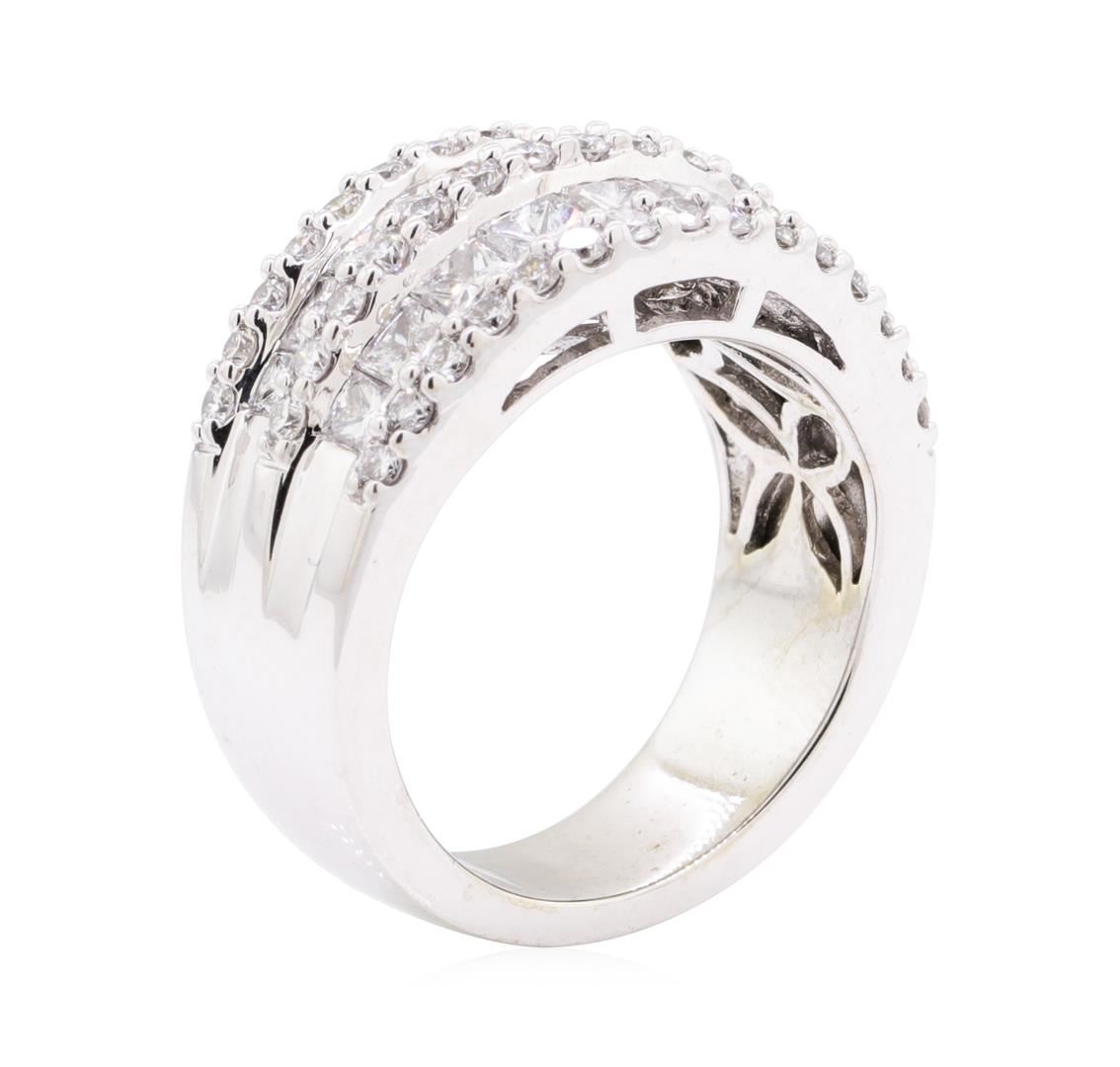 One electronically tested 14KT white gold lady's combination cast & assembled fashion ring with a five row half dome with a bright polish finish. The featured lady's ring has a shank measuring 6.00 millimeters wide. Identified with markings of '14K'. Condition is new, good workmanship. Containing: Eighteen channel set princess cut diamonds, measuring 3.00 x 2.30 x 1.73mm (depth est.) approximate total weight of 18 Stones = 1.75ct. Graded in the setting. Color H - I Clarity VS-2 to SI-2 Cut Very Good Forty-Five prong set round brilliant cut diamonds, measuring 1.60 - 1.55 x 0.98mm (depth est.) approximate total weight of 45 Stones = 0.67ct. Graded in the setting. Color H - I Clarity SI-1 to SI-2 Cut Good. Total Weight of Diamonds 2.42ct.. Total Weight of Ring 11.40gm GAS Appraised at $6585.00. GAS Appraised at $6,585.00.