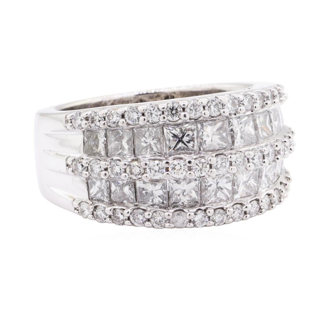 One electronically tested 14KT white gold lady's combination cast & assembled fashion ring with a five row half dome with a bright polish finish. The featured lady's ring has a shank measuring 6.00 millimeters wide. Identified with markings of '14K'. Condition is new, good workmanship. Containing: Eighteen channel set princess cut diamonds, measuring 3.00 x 2.30 x 1.73mm (depth est.) approximate total weight of 18 Stones = 1.75ct. Graded in the setting. Color H - I Clarity VS-2 to SI-2 Cut Very Good Forty-Five prong set round brilliant cut diamonds, measuring 1.60 - 1.55 x 0.98mm (depth est.) approximate total weight of 45 Stones = 0.67ct. Graded in the setting. Color H - I Clarity SI-1 to SI-2 Cut Good. Total Weight of Diamonds 2.42ct.. Total Weight of Ring 11.40gm GAS Appraised at $6585.00. GAS Appraised at $6,585.00.