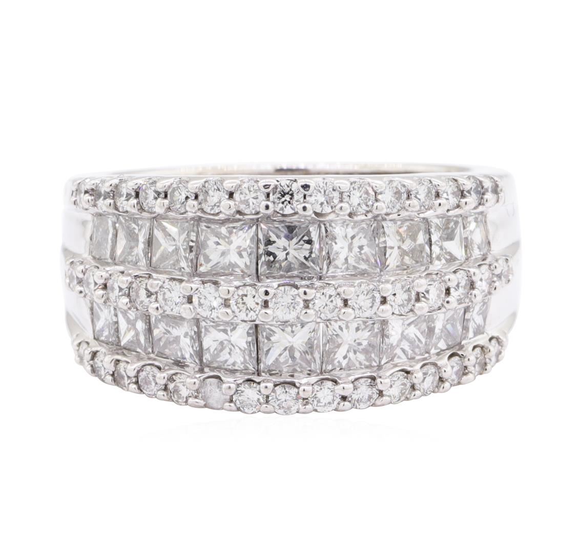 One electronically tested 14KT white gold lady's combination cast & assembled fashion ring with a five row half dome with a bright polish finish. The featured lady's ring has a shank measuring 6.00 millimeters wide. Identified with markings of '14K'. Condition is new, good workmanship. Containing: Eighteen channel set princess cut diamonds, measuring 3.00 x 2.30 x 1.73mm (depth est.) approximate total weight of 18 Stones = 1.75ct. Graded in the setting. Color H - I Clarity VS-2 to SI-2 Cut Very Good Forty-Five prong set round brilliant cut diamonds, measuring 1.60 - 1.55 x 0.98mm (depth est.) approximate total weight of 45 Stones = 0.67ct. Graded in the setting. Color H - I Clarity SI-1 to SI-2 Cut Good. Total Weight of Diamonds 2.42ct.. Total Weight of Ring 11.40gm GAS Appraised at $6585.00. GAS Appraised at $6,585.00.