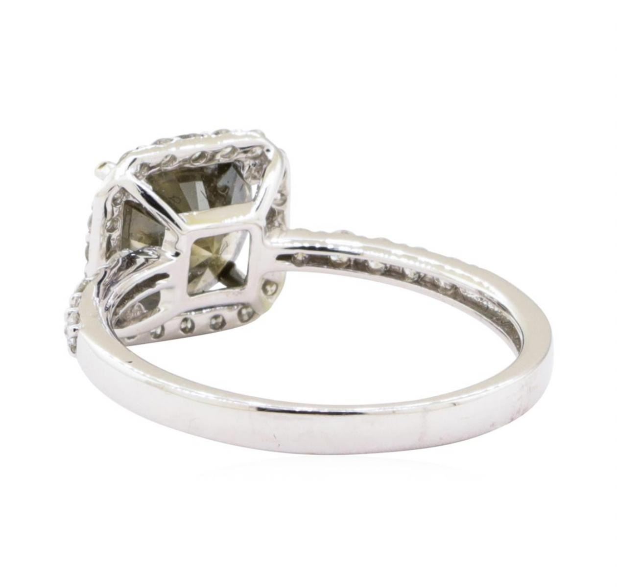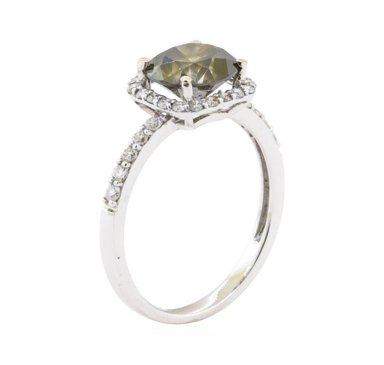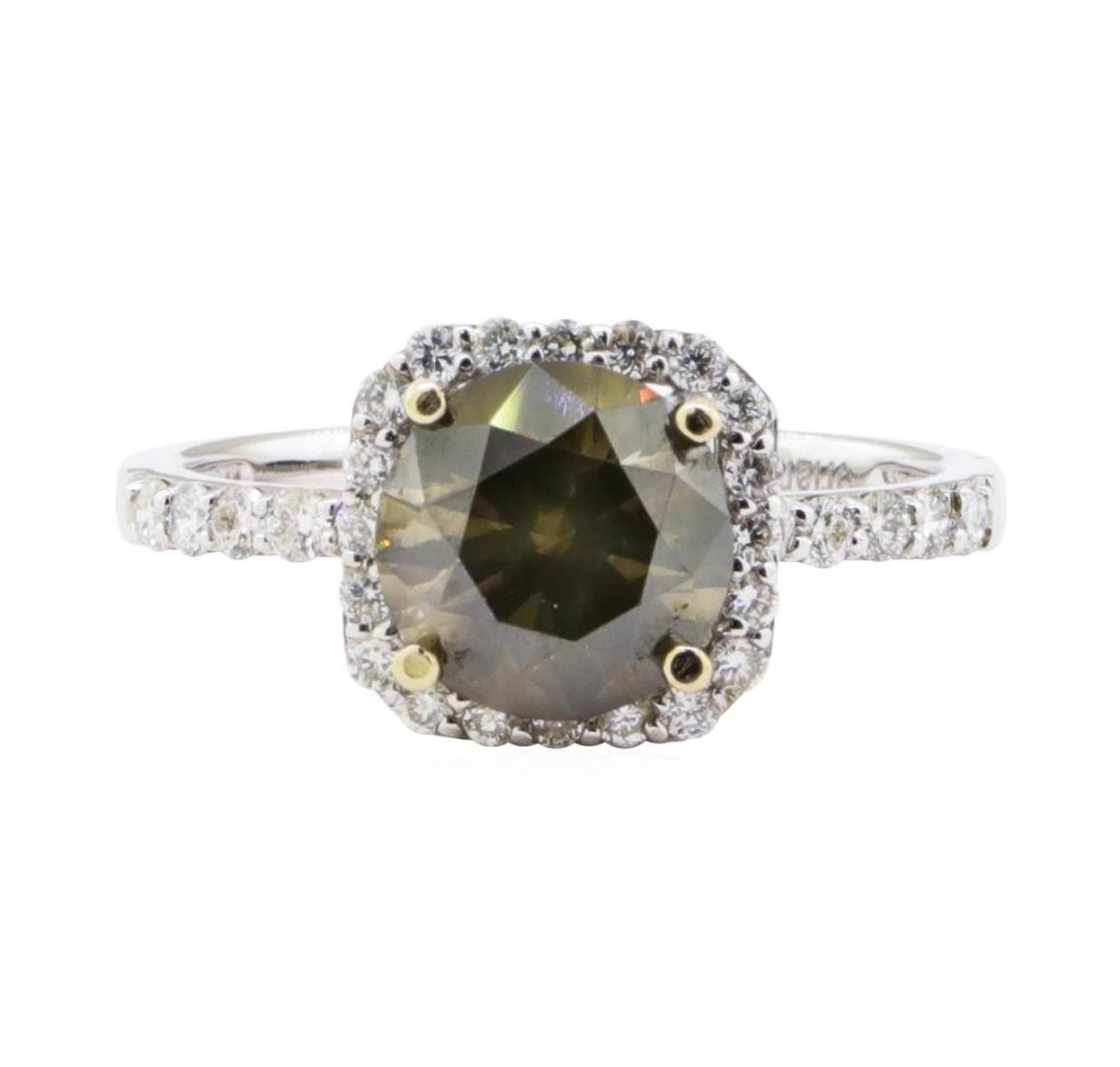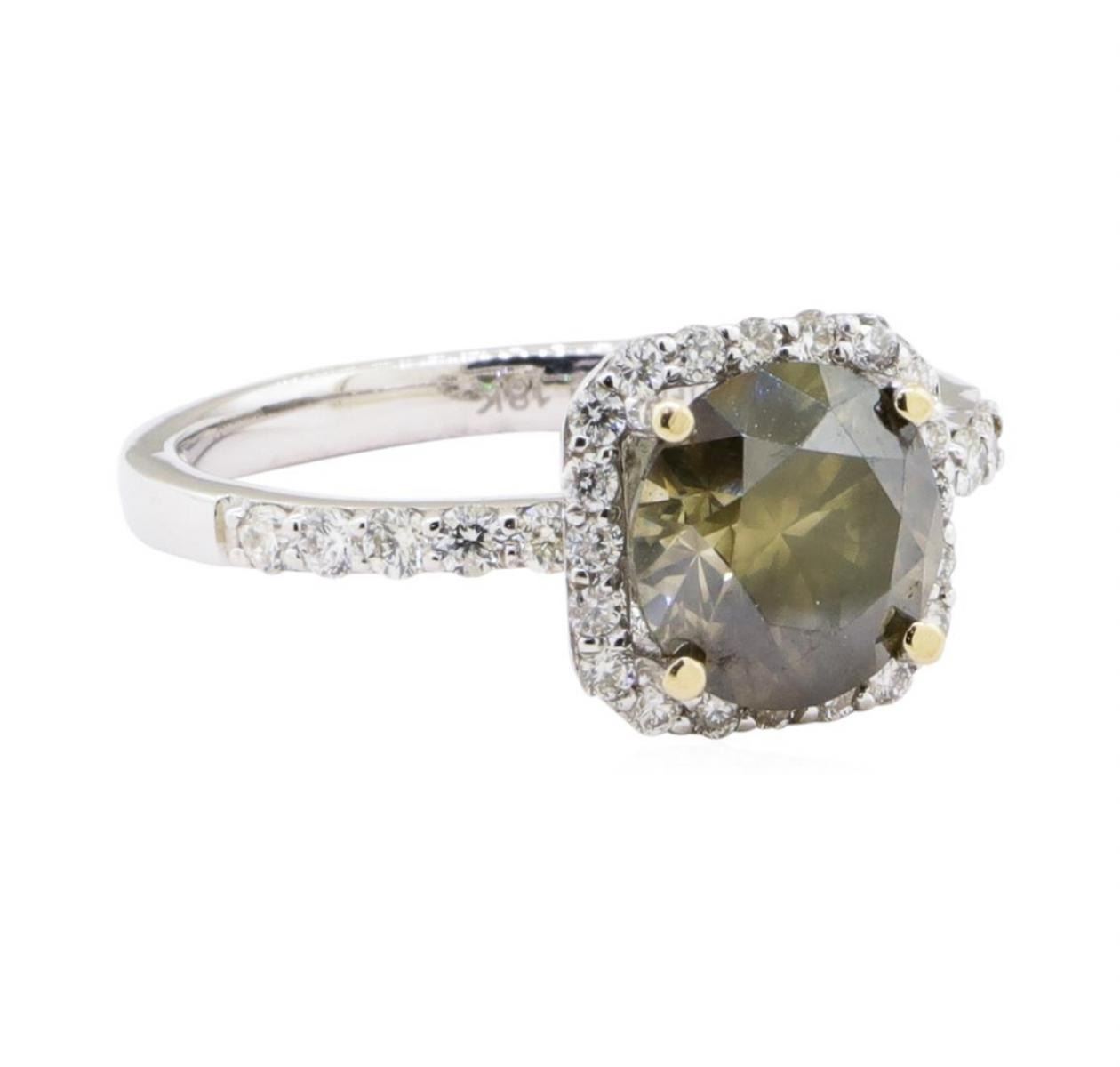 One electronically tested 18KT white gold ladies cast diamond ring with a bright polish finish. The featured diamond is set within a diamond bezel supported by diamond set shoulders, completed by a two millimeter wide band. Trademark is Orianne. Identified with markings of "18K". Condition is new, good workmanship. Containing: One prong set round brilliant cut diamond, measuring 8.06 - 8.00 x 5.00mm exact weight 2.01ct with a slight fluorescence. EGL Report attached. Graded loose prior to setting in the EGL Laboratory Report #1461011822. Clarity I-2 Color Fancy Dark Brown Greenish Yellow Depth 62.2% Table 53.5%. Thirty prong set round brilliant cut diamonds approximate total weight of 30 Stones = 0.41ct. Graded in the setting. Clarity SI-1 to I-1 Color G - I Total Weight of Diamonds 2.42 ct. Estimated Retail Value $ 12,350.00 US