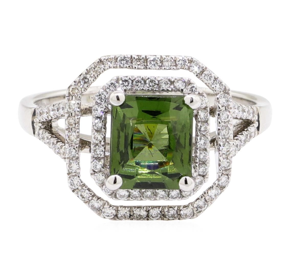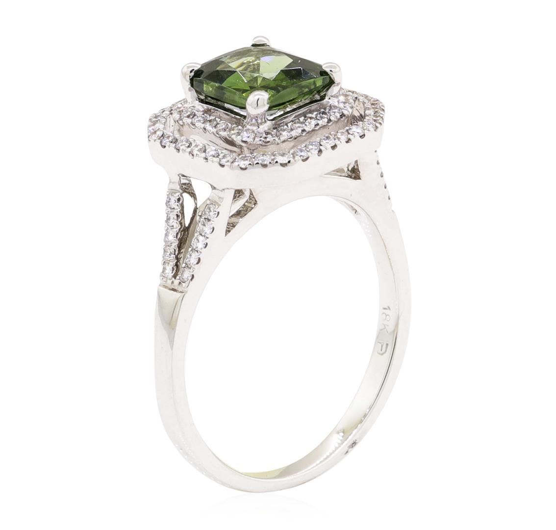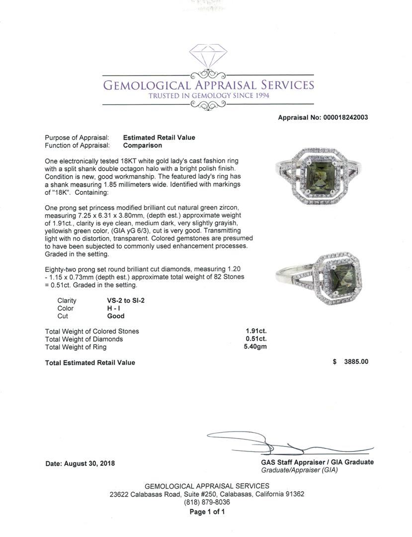 One electronically tested 18KT white gold lady's cast fashion ring with a split shank double octagon halo with a bright polish finish. The featured lady's ring has a shank measuring 1.85 millimeters wide. Identified with markings of '18K'. Condition is new, good workmanship. Containing: One prong set princess modified brilliant cut natural green zircon, measuring 7.25 x 6.31 x 3.80mm, (depth est.) approximate weight of 1.91ct., clarity is eye clean, medium dark, very slightly grayish, yellowish green color, (GIA yG 6/3), cut is very good. Transmitting light with no distortion, transparent. Colored gemstones are presumed to have been subjected to commonly used enhancement processes. Graded in the setting. Eighty-Two prong set round brilliant cut diamonds, measuring 1.20 - 1.15 x 0.73mm (depth est.) approximate total weight of 82 Stones = 0.51ct. Graded in the setting. Color H - I Clarity VS-2 to SI-2 Cut Good. Total Weight of Colored Stones 1.91ct.. Total Weight of Diamonds 0.51ct.. Total Weight of Ring 5.40gm GAS Appraised at $3885.00. GAS Appraised.