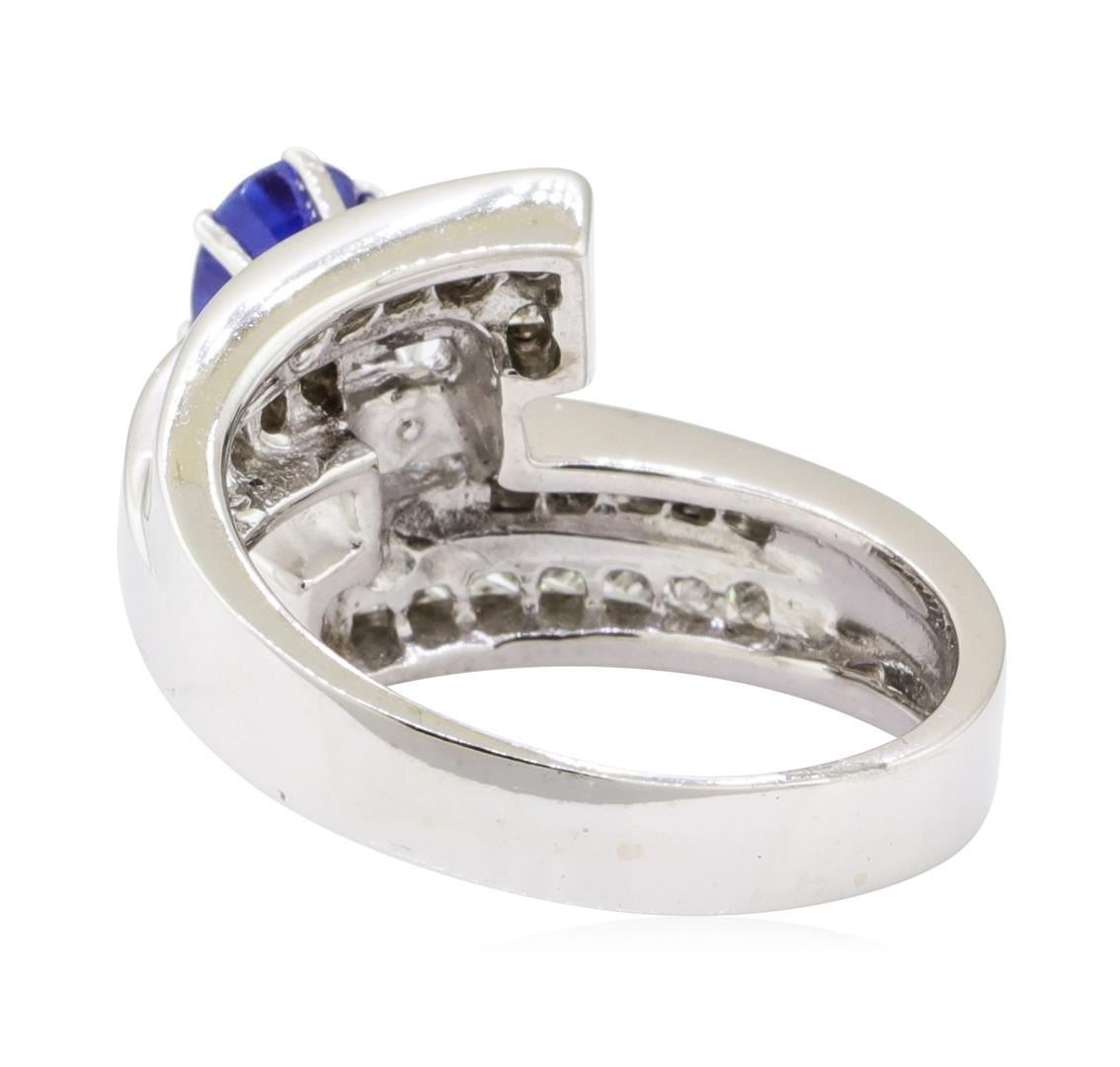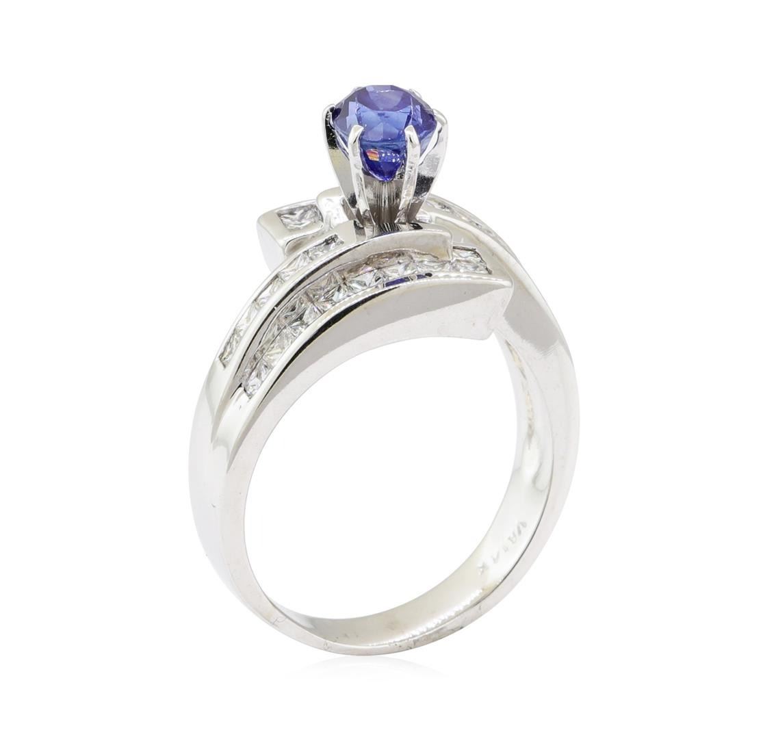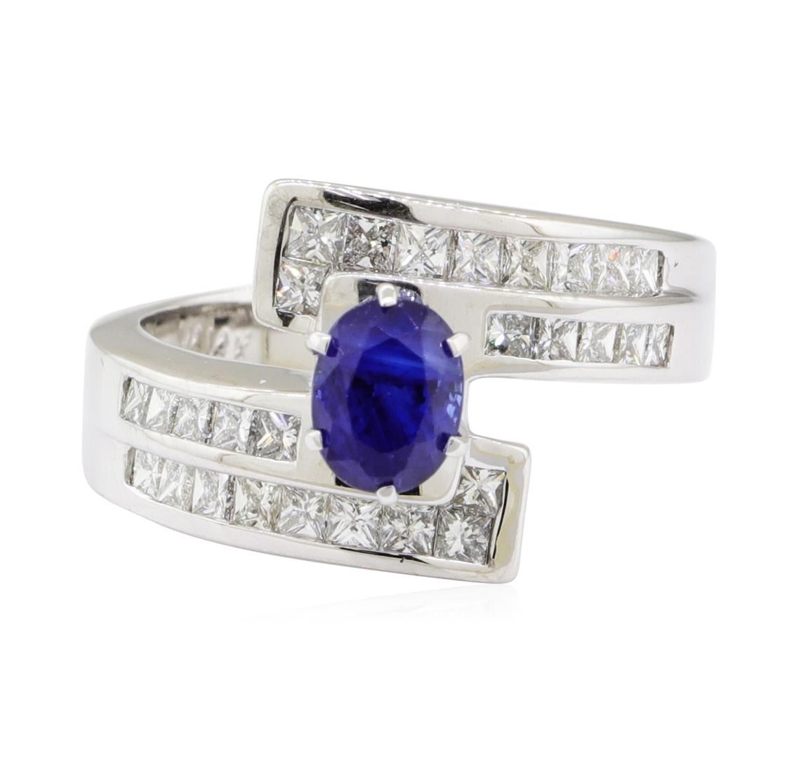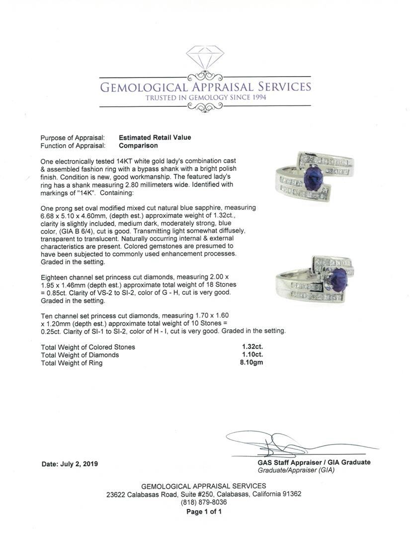 One electronically tested 14KT white gold lady's combination cast & assembled fashion ring with a bypass shank with a bright polish finish. The featured lady's ring has a shank measuring 2.80 millimeters wide. Identified with markings of '14K'. Condition is new, good workmanship. Containing: One prong set oval modified mixed cut natural blue sapphire, measuring 6.68 x 5.10 x 4.60mm, (depth est.) approximate weight of 1.32ct., clarity is slightly included, medium dark, moderately strong, blue color, (GIA B 6/4), cut is good. Transmitting light somewhat diffusely, transparent to translucent. Naturally occurring internal & external characteristics are present. Colored gemstones are presumed to have been subjected to commonly used enhancement processes. Graded in the setting. Eighteen channel set princess cut diamonds, measuring 2.00 x 1.95 x 1.46mm (depth est.) approximate total weight of 18 Stones = 0.85ct. Graded in the setting. Color G - H Clarity VS-2 to SI-2 Cut Very Good Ten channel set princess cut diamonds, measuring 1.70 x 1.60 x 1.20mm (depth est.) approximate total weight of 10 Stones = 0.25ct. Graded in the setting. Color H - I Clarity SI-1 to SI-2 Cut Very Good. Total Weight of Colored Stones 1.32ct.. Total Weight of Diamonds 1.10 ct.. Total Weight of Ring 8.10gm GAS Appraised at $5405.00. GAS Appraised.