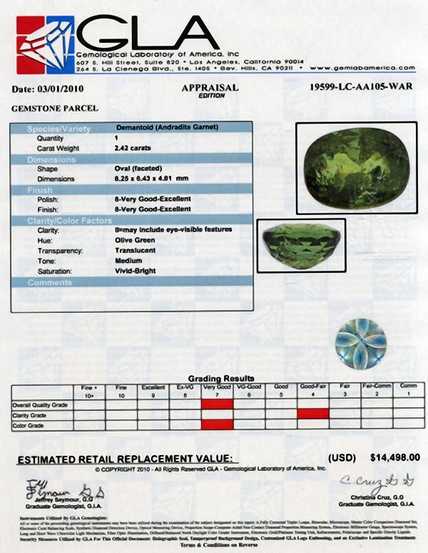 Very good green specimen oval cut and clear; lab quality evaluation 6; no treatment noted; Gem Guide wholesale $3630-$6050; full retail appraisal $14498; full lab evaluation included