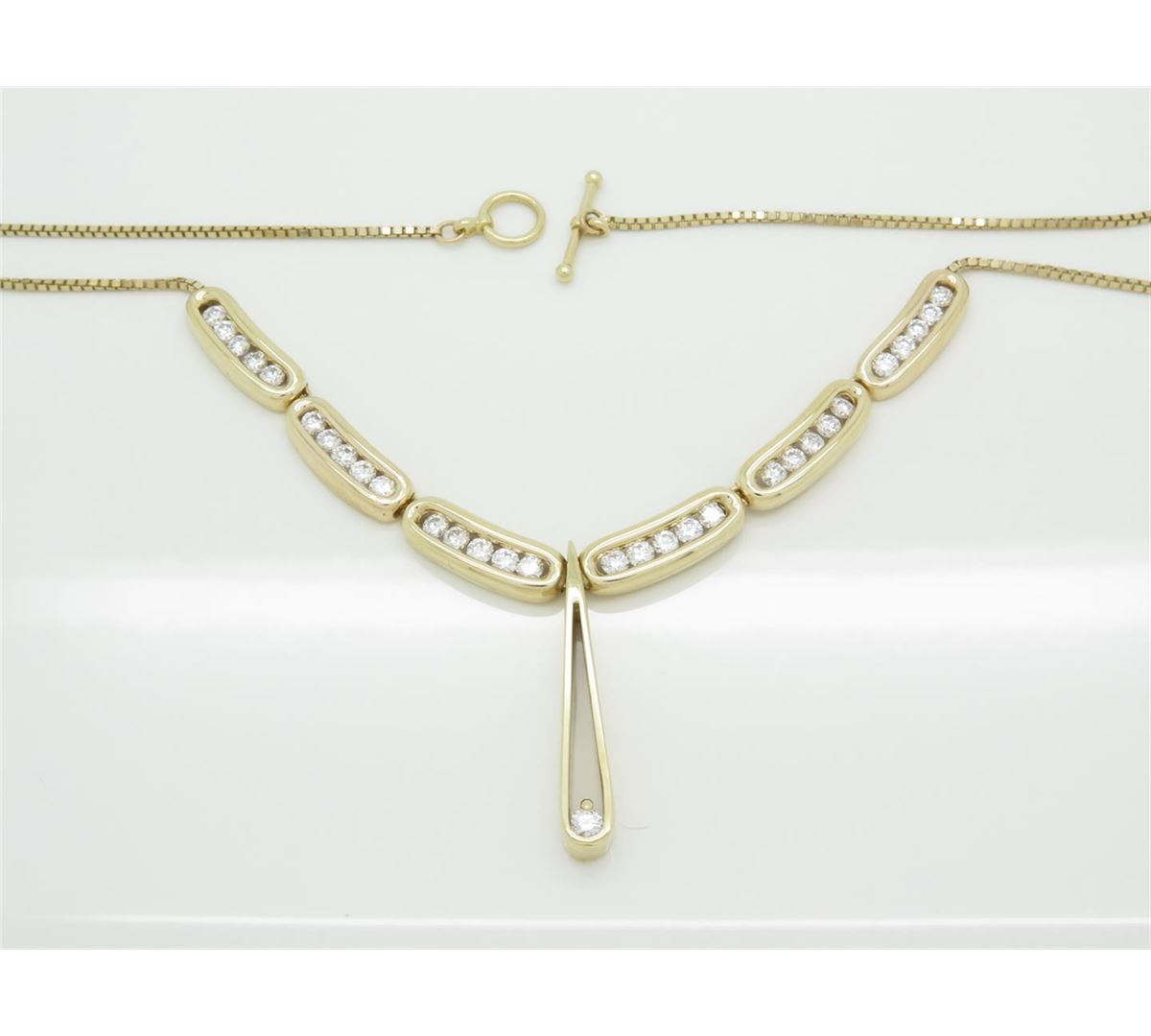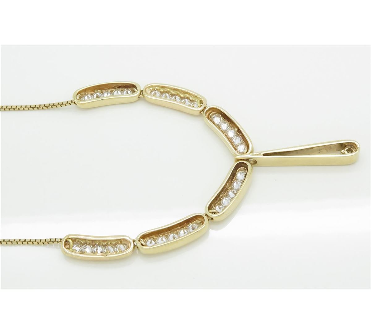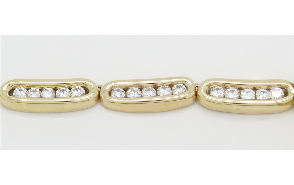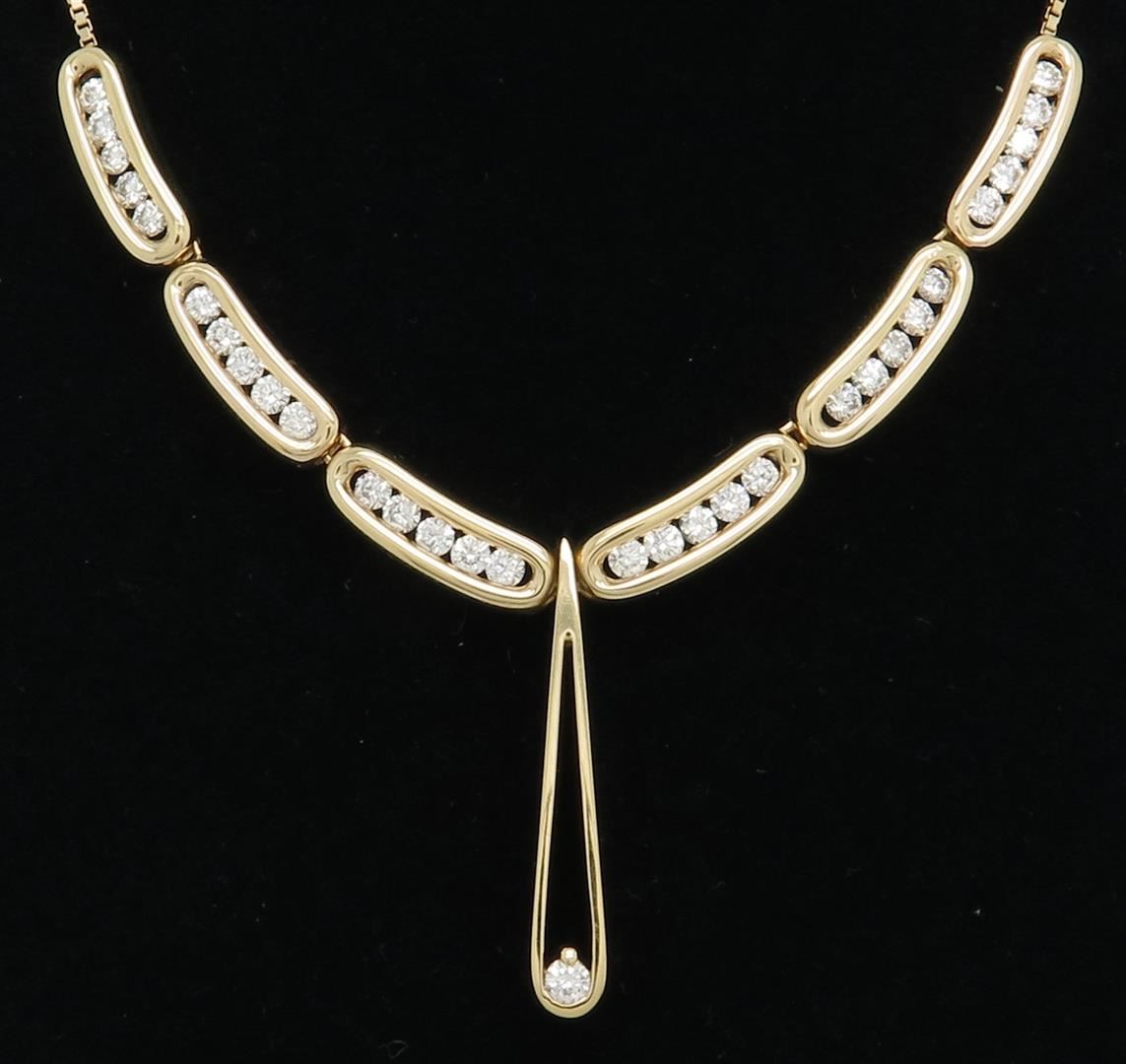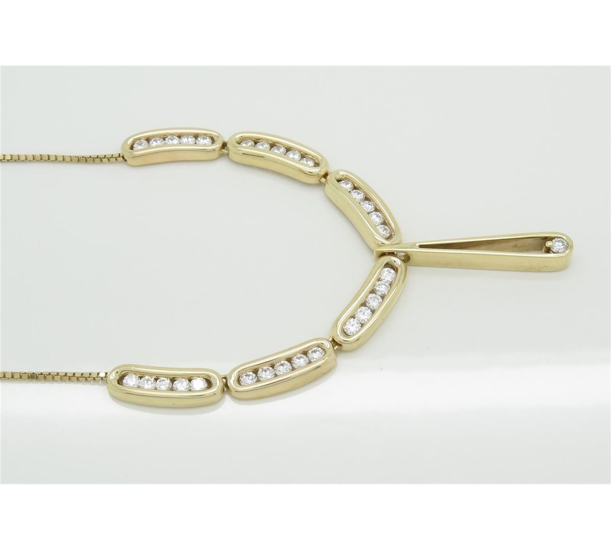 One tested 14K yellow gold necklace. Containing: 31 Round Brilliant Cut Diamonds, Clarity: VS-SI, Color: G-H. Approximate total diamond weight: 2.43CTW. All diamonds are graded in the mounting unless otherwise stated. Weight of necklace: 15.0 grams, Size of chain: 15 inches.