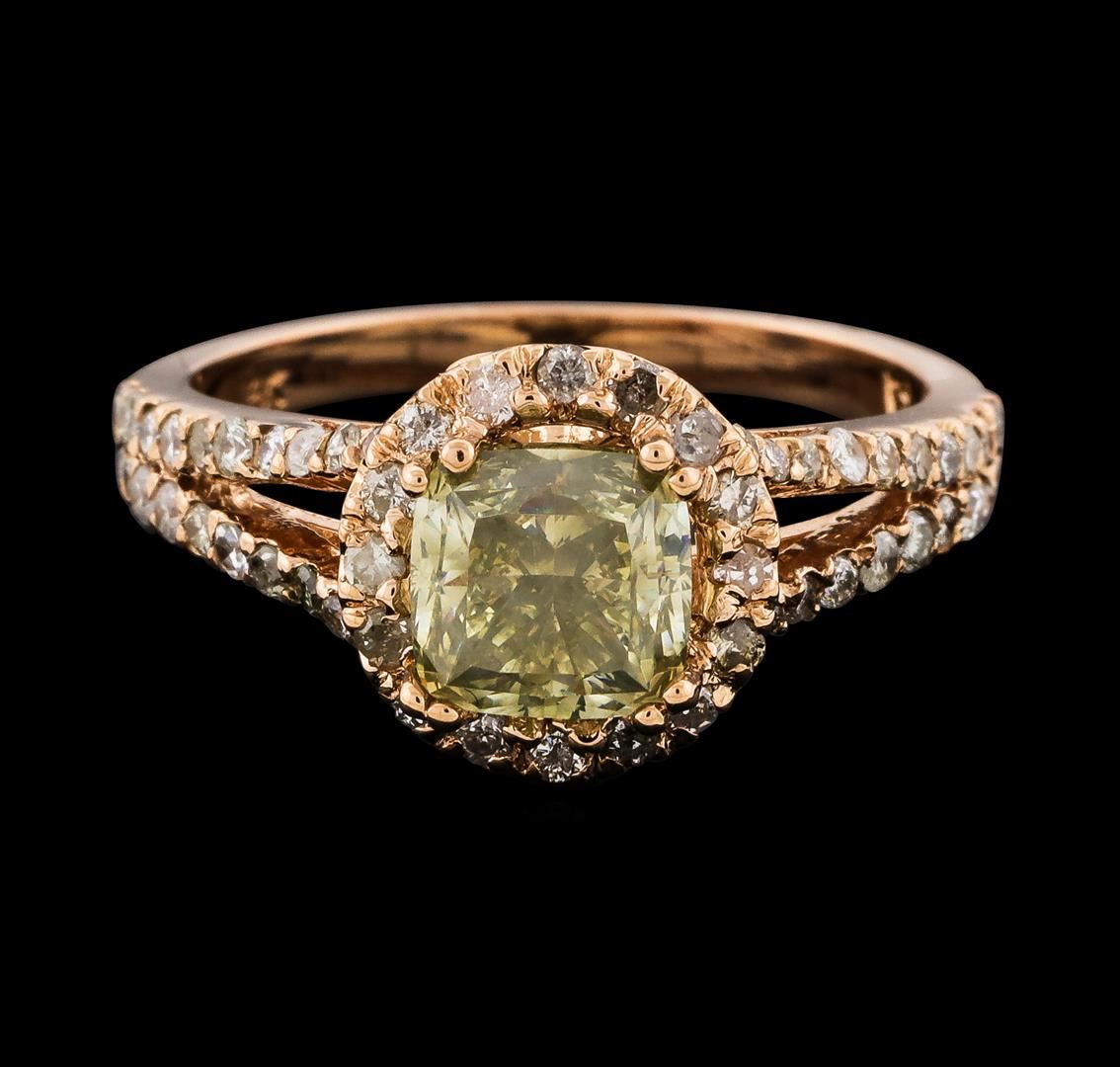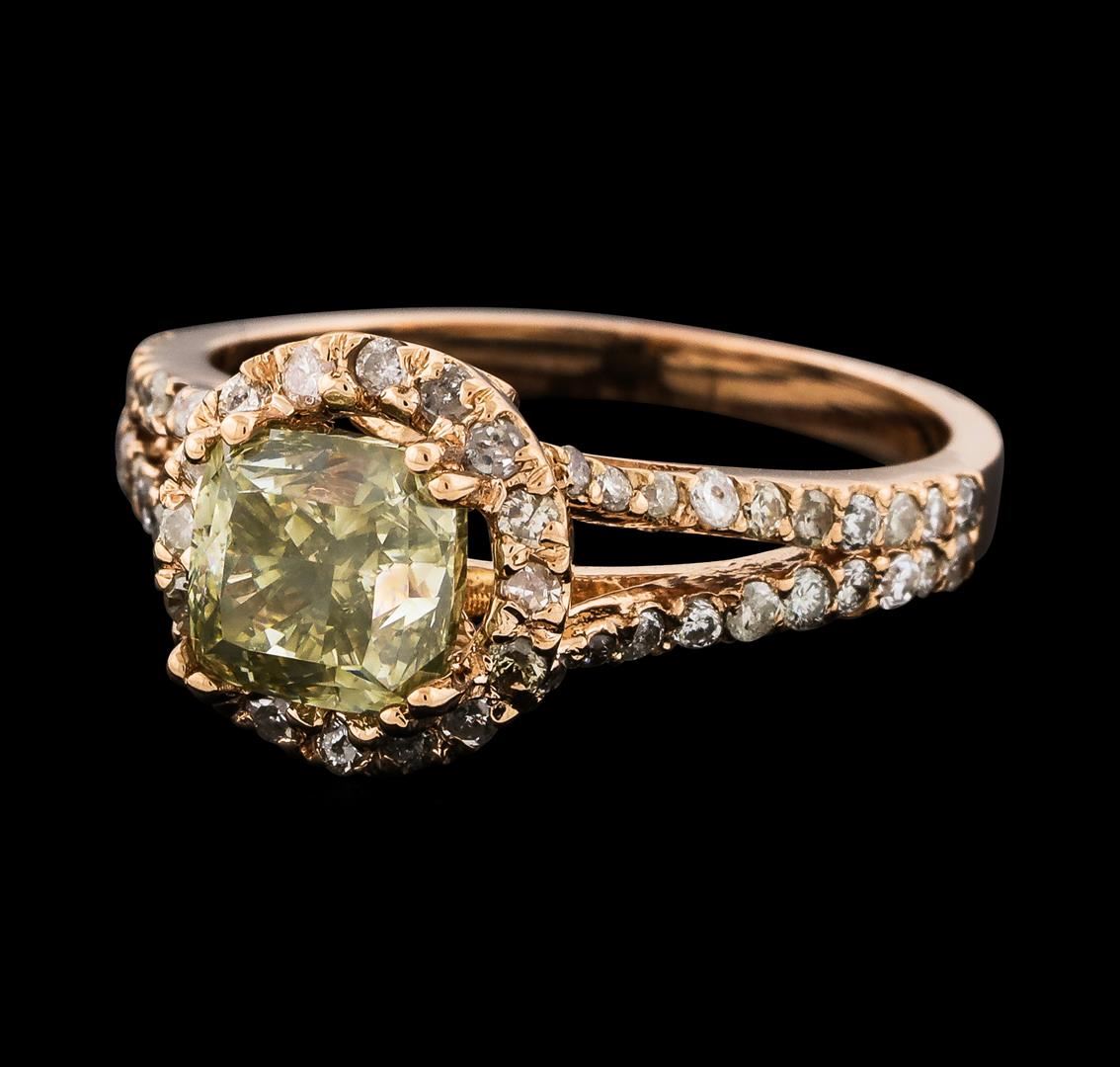 One electronically tested 14KT rose gold lady's cast fashion ring with a split cathedral shank with a halo with a bright polish finish. The featured lady's ring has a shank measuring 1.91 millimeters wide. Identified with markings of '14K'. Condition is new, good workmanship. Containing: One prong set cushion cut diamond, measuring 6.15 x 6.29 x 5.02mm (depth est.) , 10.00.%. GTCF approximate weight of 1.82ct. Graded in the setting. Clarity I-1 Cut Good Fifty-Six prong set round brilliant cut diamonds, measuring 1.45 - 1.40 x 0.89mm (depth est.) approximate total weight of 56 Stones = 0.61ct. Graded in the setting. Clarity SI-2 to I-2. Color: I - K Cut Good. Total Weight of Diamonds 2.43ct.. Total Weight of Ring 4.00gm. GAS Appraised at $9,895.00.