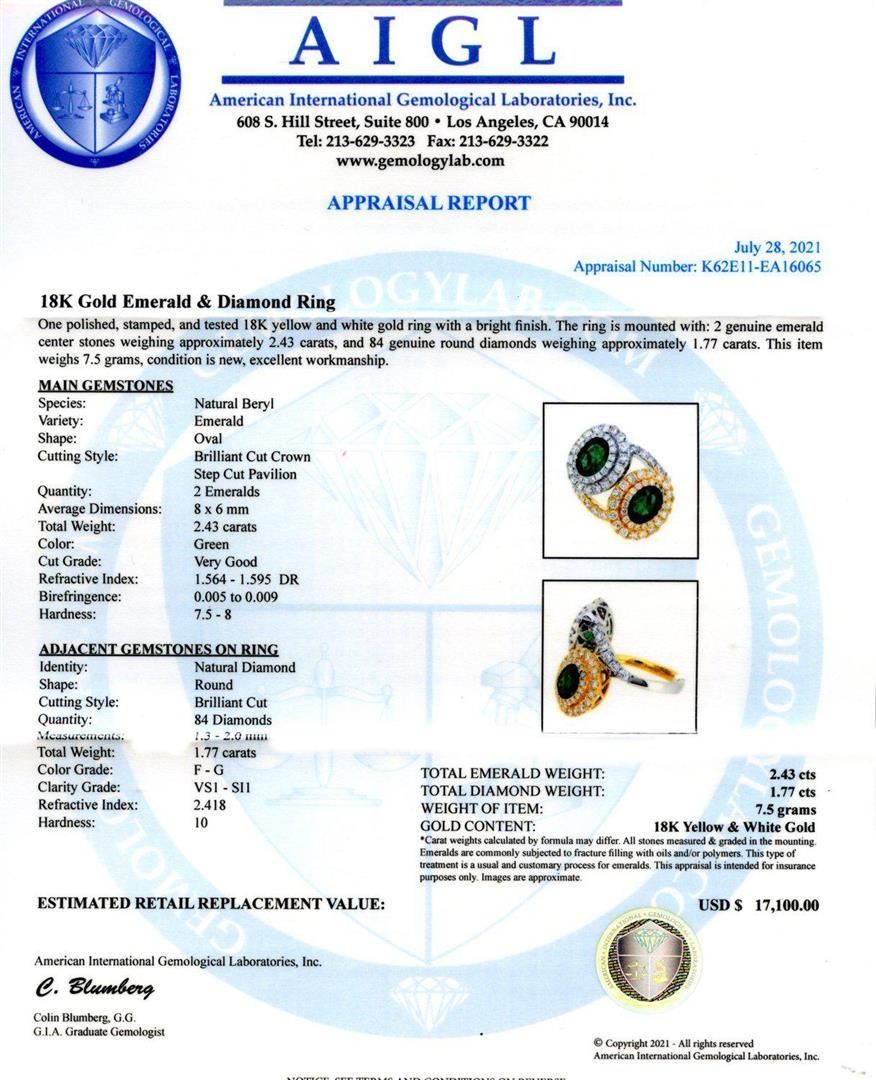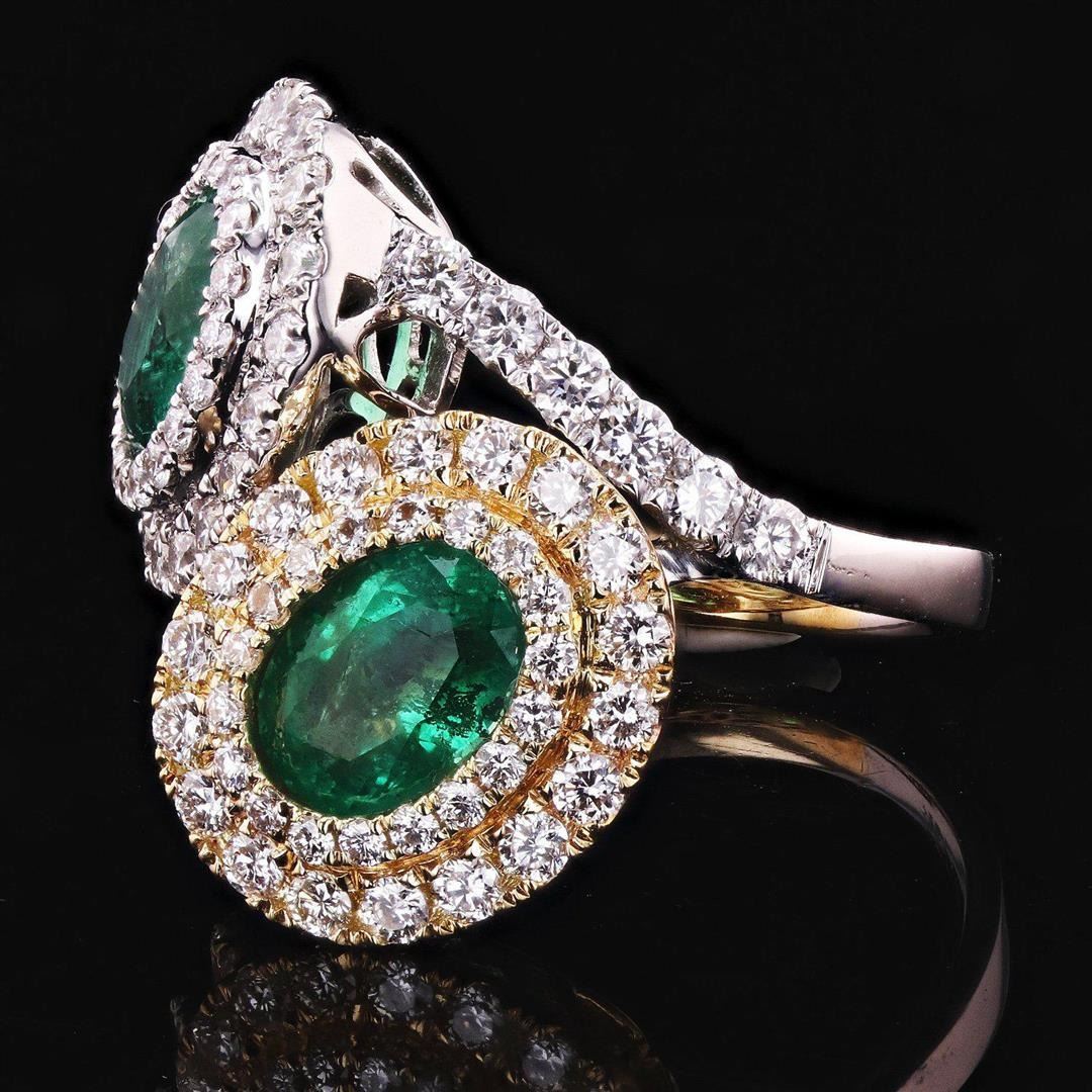 One polished, stamped, and tested 18K yellow and white gold ring with a bright finish. The ring is mounted with: 2 genuine emerald center stones weighing approximately 2.43 carats, and 84 genuine round diamonds weighing approximately 1.77 carats. This ite