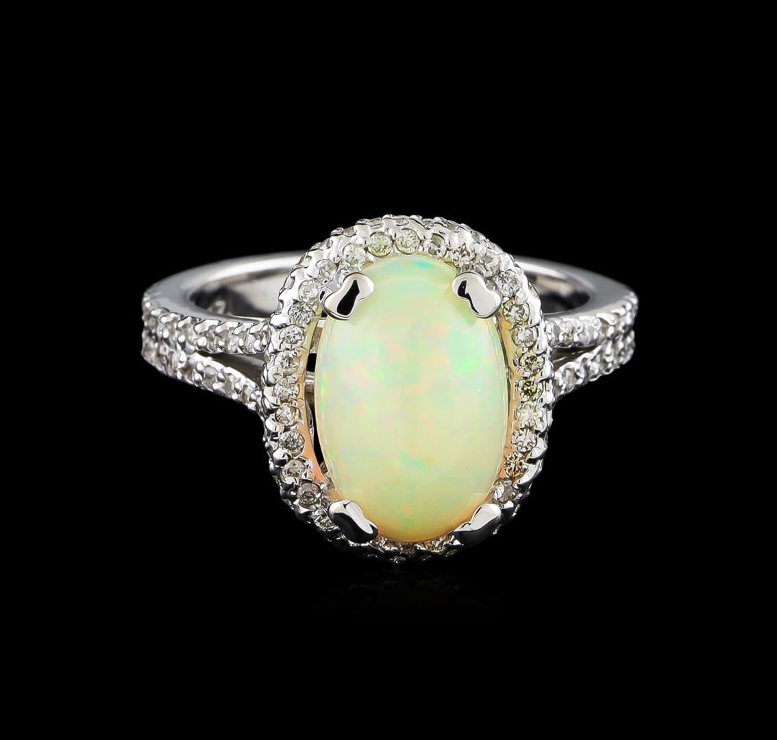 One ring featuring: 14KT white gold weighing 5.83 grams containing one opal with a total weight of 2.43ct and side diamonds with a total weight of 0.65ct.