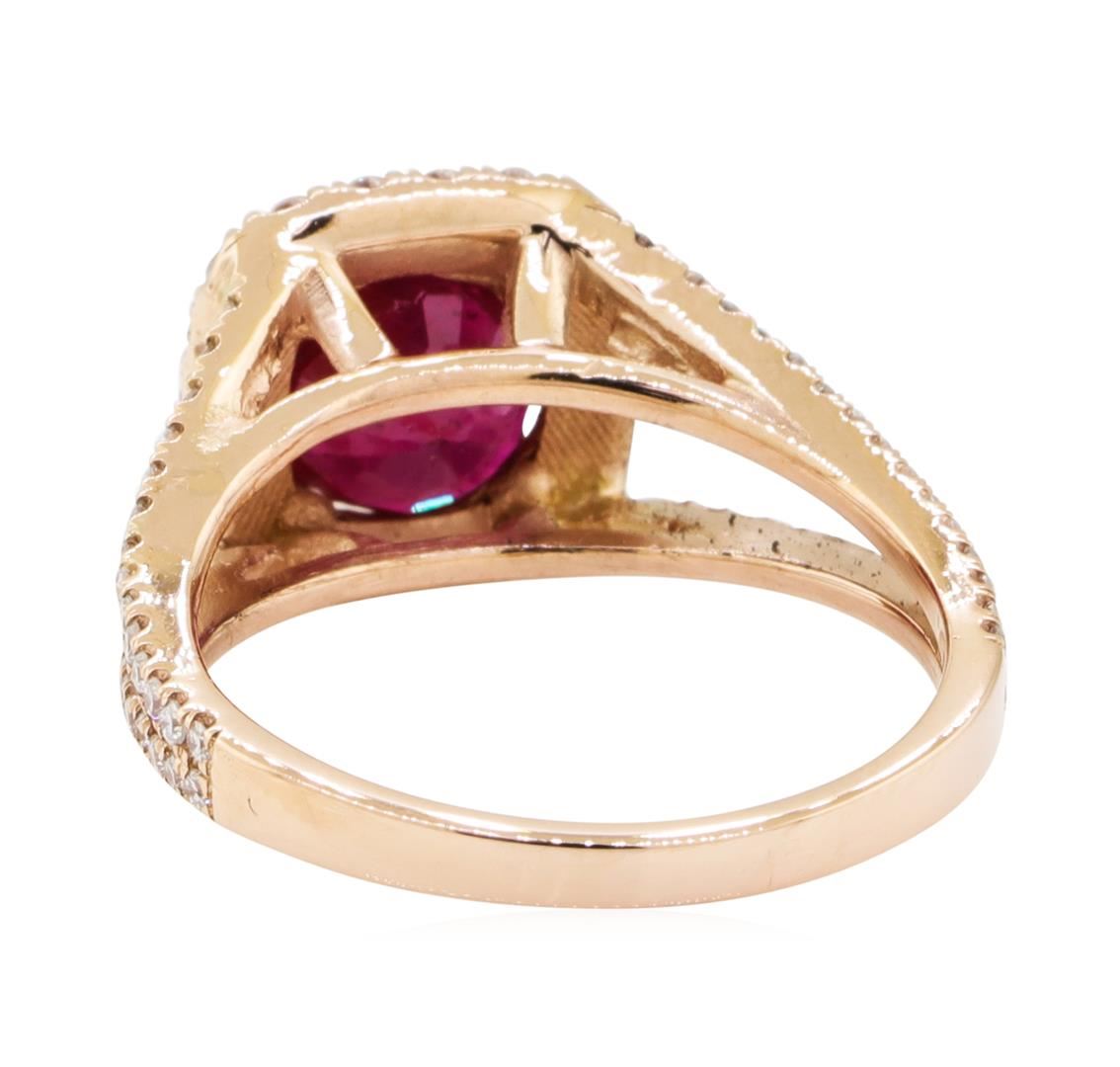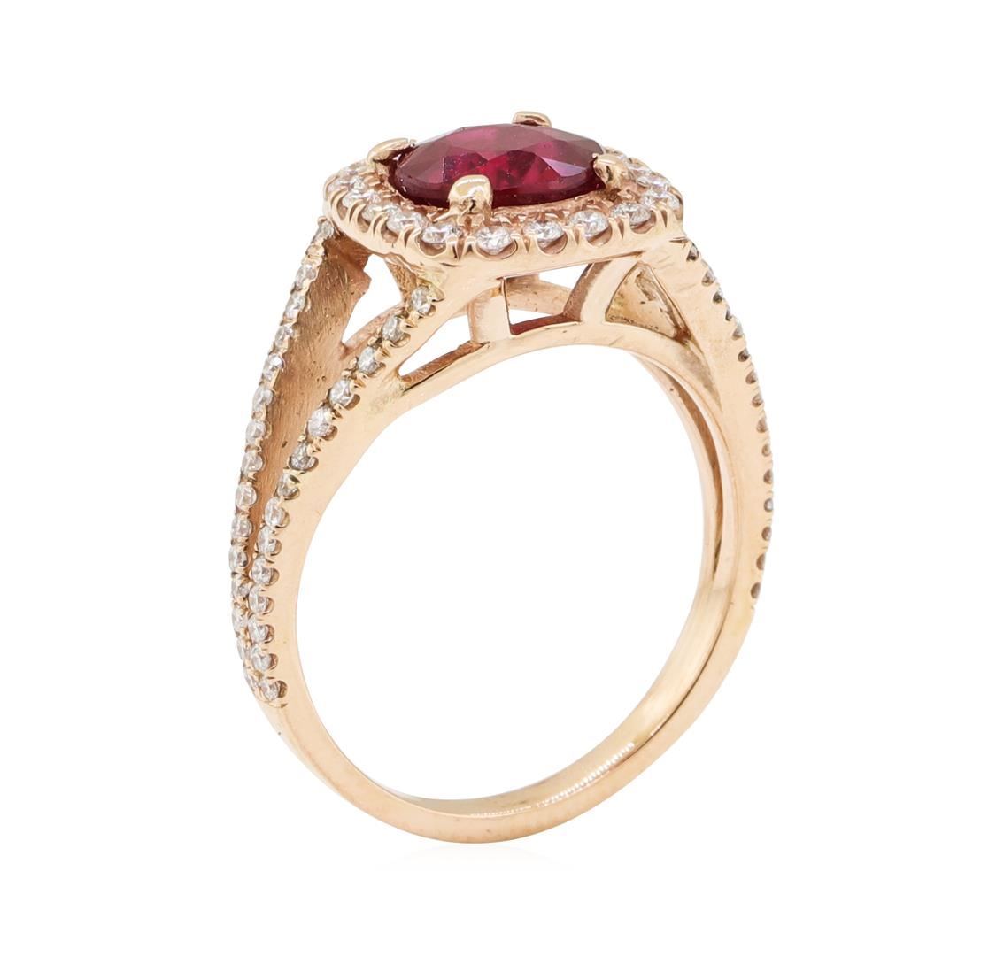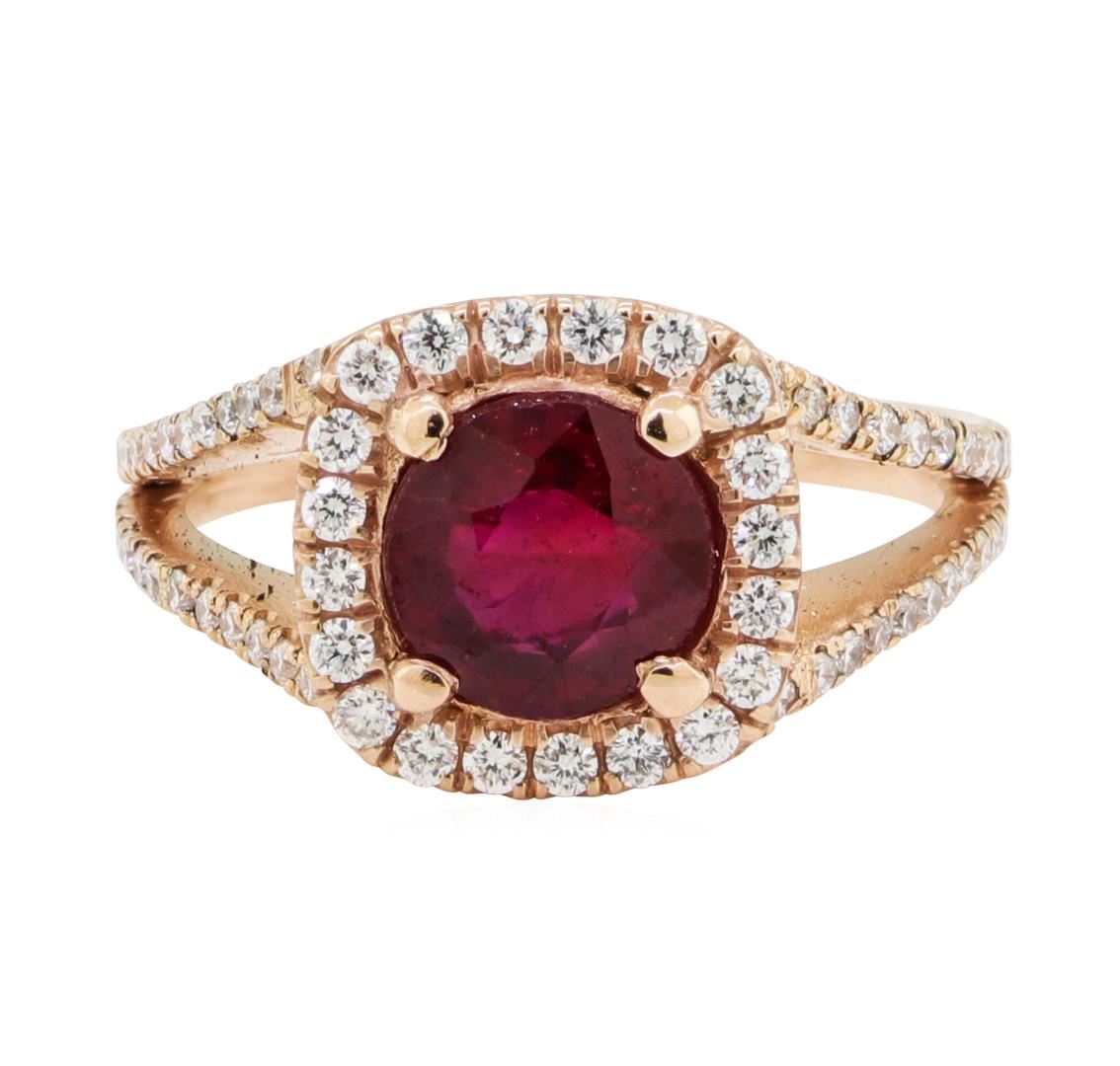 One electronically tested 14KT rose gold lady's cast fashion ring with a split shank cathedral basket halo with a bright polish finish. The featured lady's ring has a shank measuring 1.80 millimeters wide. Identified with markings of '14K'. Condition is new, good workmanship. Containing: One prong set round modified mixed cut natural ruby-glass composite, measuring 6.90 - 6.88 x 4.32 mm, (depth est.) 10%. bulge factor, approximate weight of 1.96ct., clarity is moderately included, medium, strong, red color, (GIA R 5/5), cut is good. Transmitting light somewhat diffusely, transparent to translucent. Naturally occurring internal & external characteristics are present. Indications of laboratory high temperature heat treatment, with glass & flux additives. Colored gemstones are presumed to have been subjected to commonly used enhancement processes. Graded in the setting. Twenty prong set round brilliant cut diamonds, measuring 1.55 - 1.50 x 0.95mm (depth est.) approximate total weight of 20 Stones = 0.27ct. Graded in the setting. Color G - H Clarity VS-1 to VS-2 Cut Very Good Fifty-Six prong set round brilliant cut diamonds, measuring 1.00 - 0.95 x 0.59mm (depth est.) approximate total weight of 56 Stones = 0.20ct. Graded in the setting. Color H - I Clarity SI-1 to SI-2 Cut Very Good. Total Weight of Colored Stones 1.96ct.. Total Weight of Diamonds 0.47ct.. Total Weight of Ring 4.00gm GAS Appraised at $3190.00. GAS Appraised at $3,190.00.