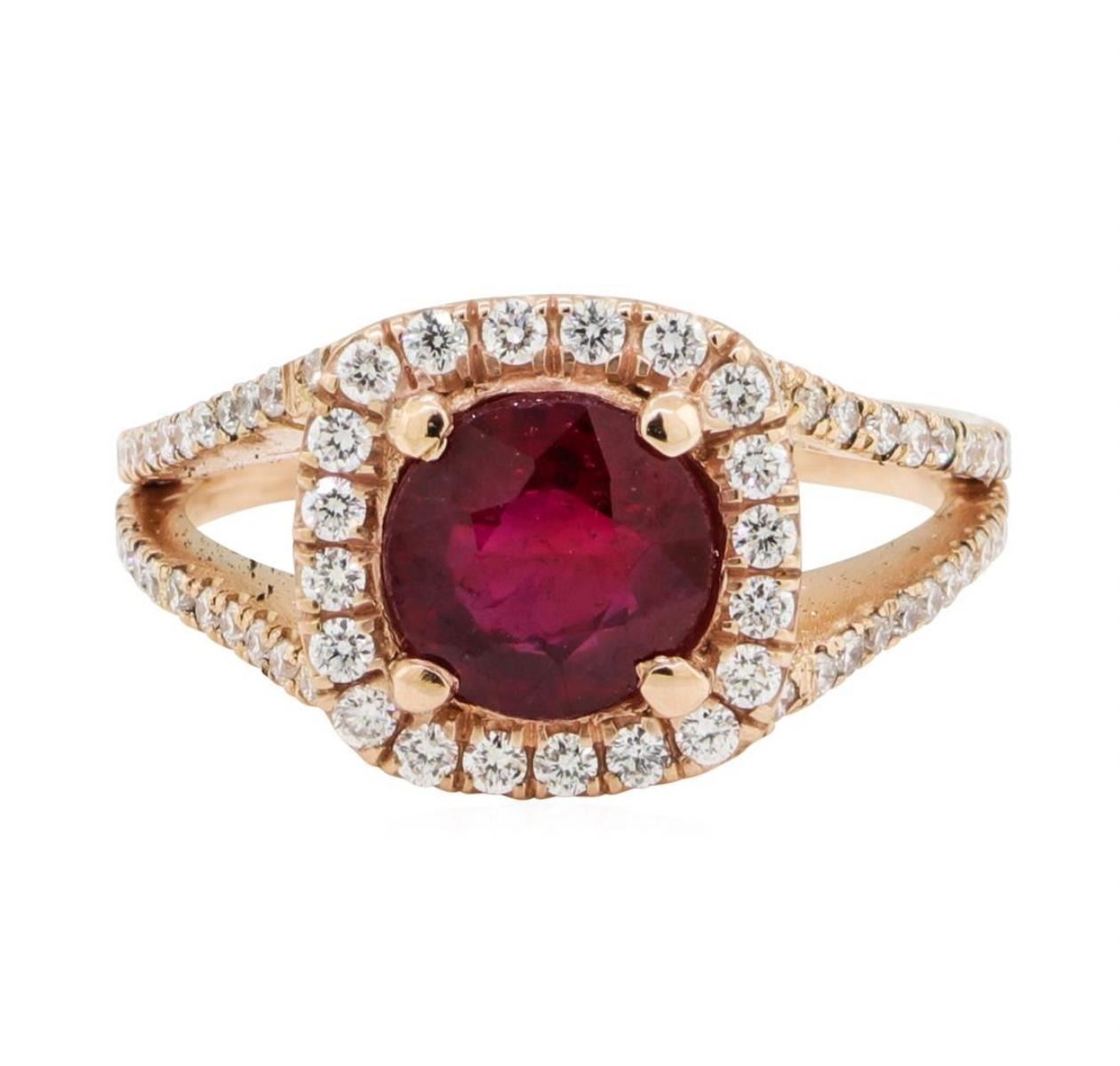 One electronically tested 14KT rose gold lady's cast fashion ring with a split shank cathedral basket halo with a bright polish finish. The featured lady's ring has a shank measuring 1.80 millimeters wide. Identified with markings of '14K'. Condition is new, good workmanship. Containing: One prong set round modified mixed cut natural ruby-glass composite, measuring 6.90 - 6.88 x 4.32 mm, (depth est.) 10%. bulge factor, approximate weight of 1.96ct., clarity is moderately included, medium, strong, red color, (GIA R 5/5), cut is good. Transmitting light somewhat diffusely, transparent to translucent. Naturally occurring internal & external characteristics are present. Indications of laboratory high temperature heat treatment, with glass & flux additives. Colored gemstones are presumed to have been subjected to commonly used enhancement processes. Graded in the setting. Twenty prong set round brilliant cut diamonds, measuring 1.55 - 1.50 x 0.95mm (depth est.) approximate total weight of 20 Stones = 0.27ct. Graded in the setting. Color G - H Clarity VS-1 to VS-2 Cut Very Good Fifty-Six prong set round brilliant cut diamonds, measuring 1.00 - 0.95 x 0.59mm (depth est.) approximate total weight of 56 Stones = 0.20ct. Graded in the setting. Color H - I Clarity SI-1 to SI-2 Cut Very Good. Total Weight of Colored Stones 1.96ct.. Total Weight of Diamonds 0.47ct.. Total Weight of Ring 4.00gm GAS Appraised at  $3190.00. GAS Appraised.