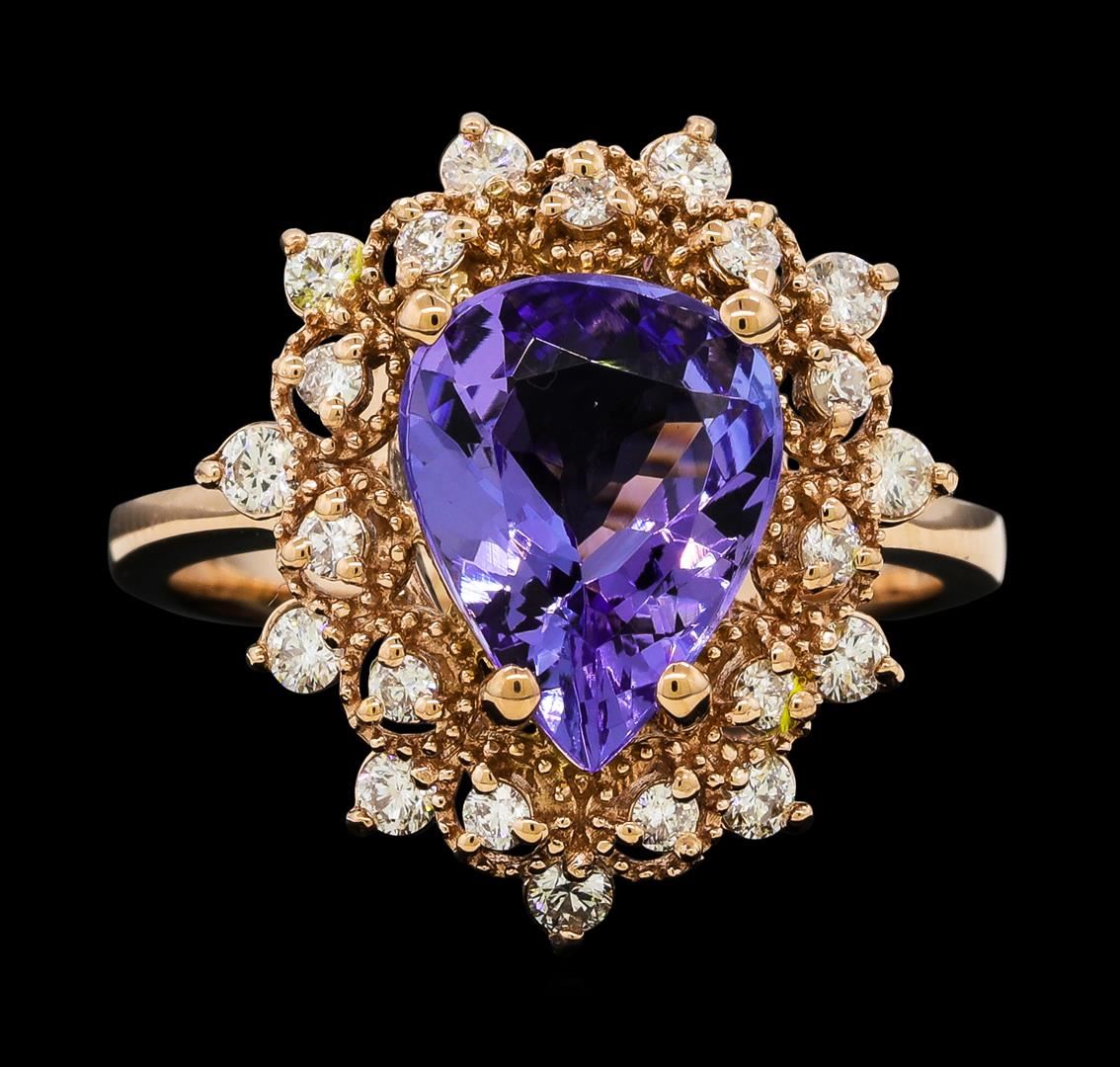 One Tanzanite and Diamond Ring including: 14KT Rose Gold weighing a total of 3.91 grams, Tanzanite weighing a total of 2.43ct, and 22 Diamonds weighing a total of 0.42ctw.